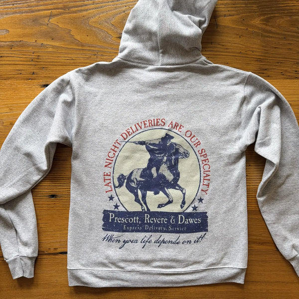In the spirit of our Knox Moving Company shirt and our Dolley Madison Art Storage Company tote bag, we bring you our new "Prescott, Revere, and Dawes Express Delivery Service" hooded sweatshirt.