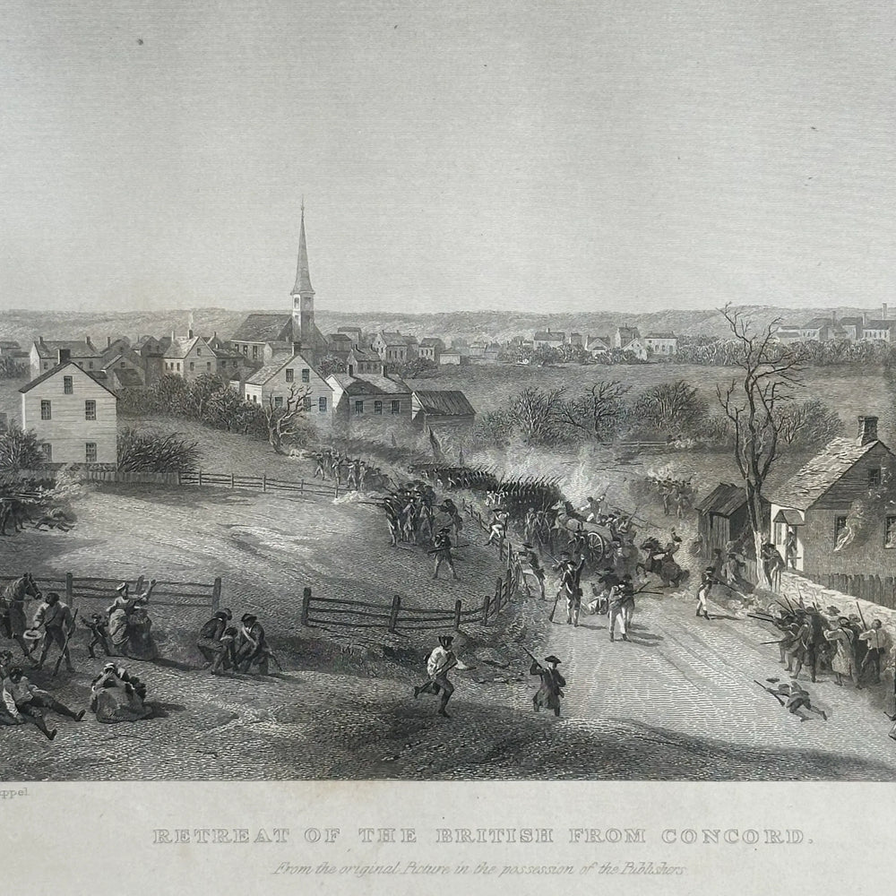 • Retreat of the British from Concord — c. 1860 steel engraving — In an antique frame