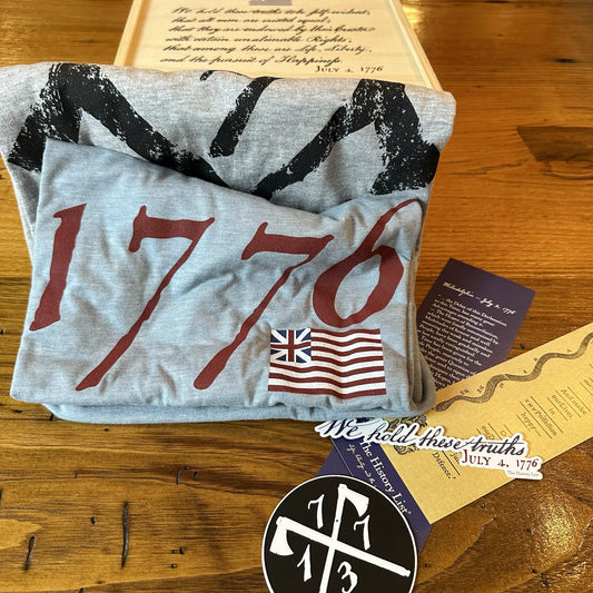 Revolutionary War gift box with our "1773" and "1776" shirts and bookmarks and stickers