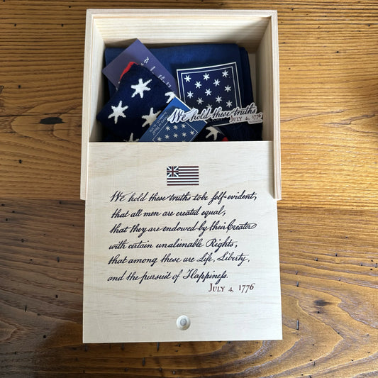 Revolutionary War Victory gift box with "Victory or Death" scarf and socks with stickers and bookmarks