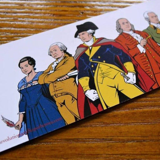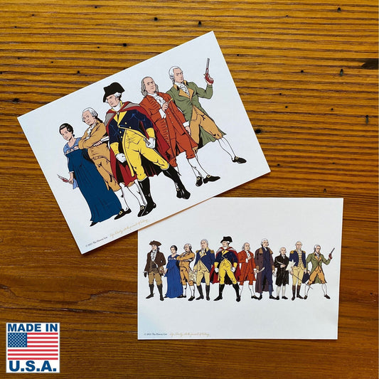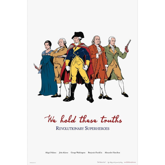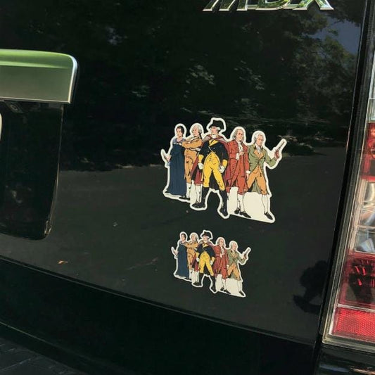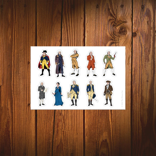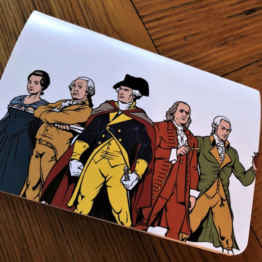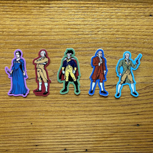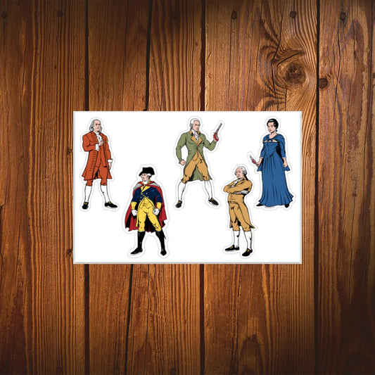 Sticker bundle with individual Abigail Adams, John Adams, George Washington, Ben Franklin, and Alexander Hamilton as "Revolutionary Superheroes"