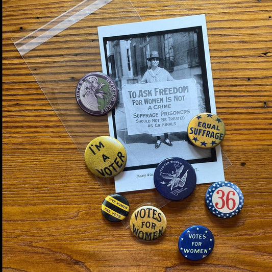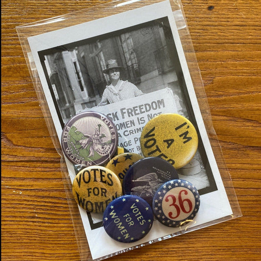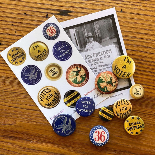 Suffrage Campaign historical button pins and sticker sheet bundle