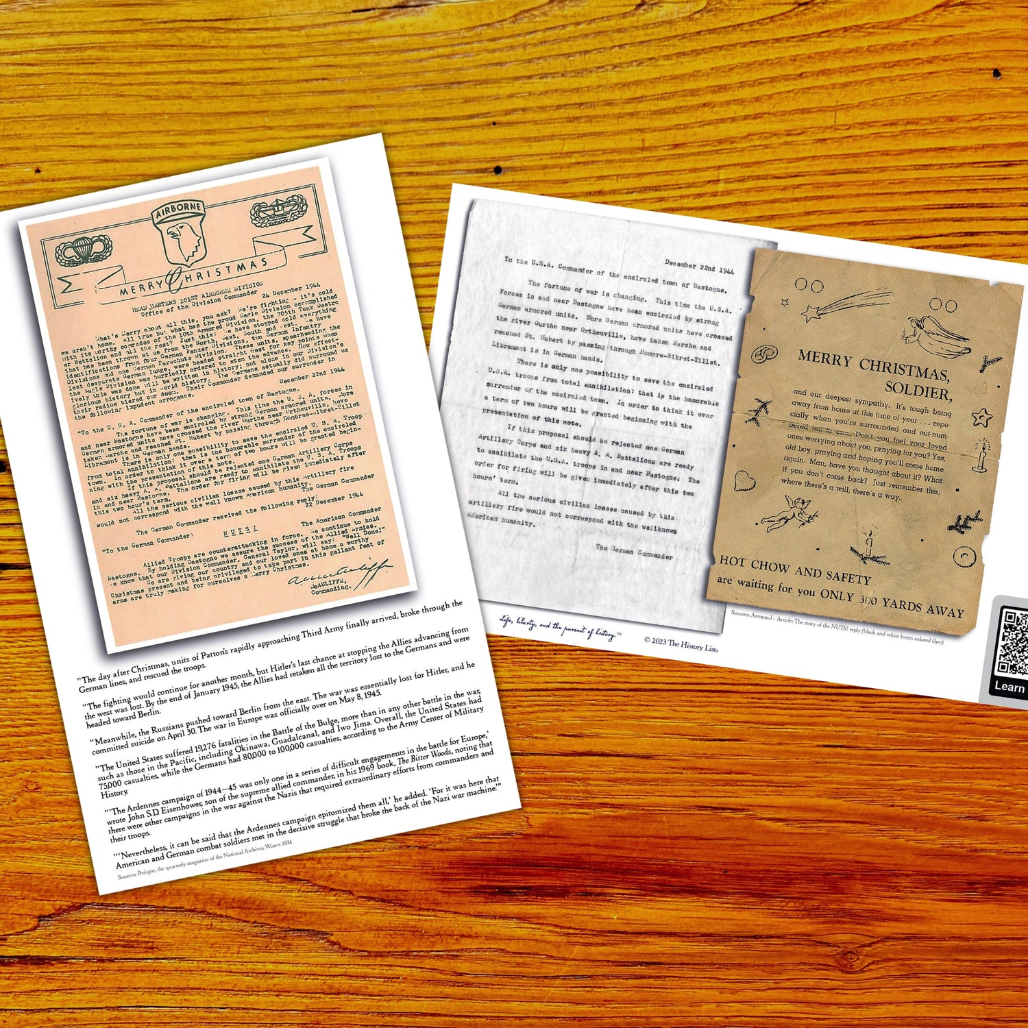 A 5" x 8" card with an image of Brig. Gen. Anthony McAuliffe’s 1944 Christmas letter to his troops, and on the back, the typed offer to negotiate a surrender that the Germans presented and the propaganda flier that the Germans dropped.