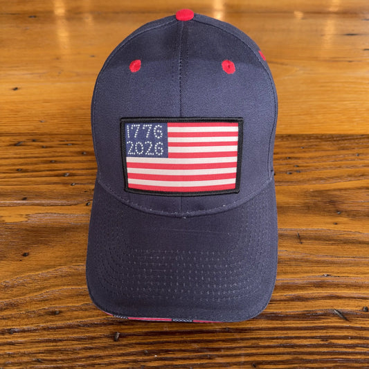 1776 - 2026 "Let Freedom Ring" cap — Dark blue with flag brim