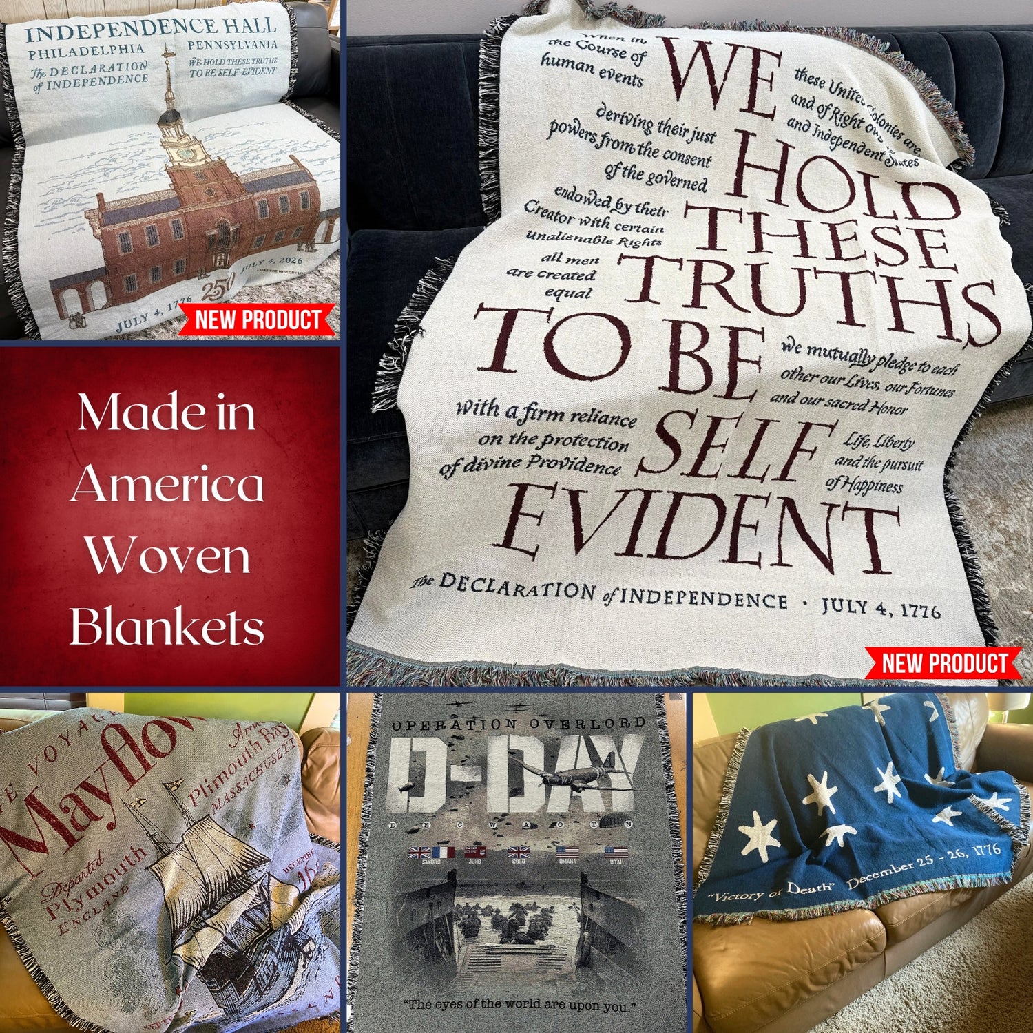Our original design on a soft acrylic scarf — "Join or Die" Made in America woven scarf adapts Ben Franklin's famous illustration and "Victory or Death" with George Washington's signature woven scarf