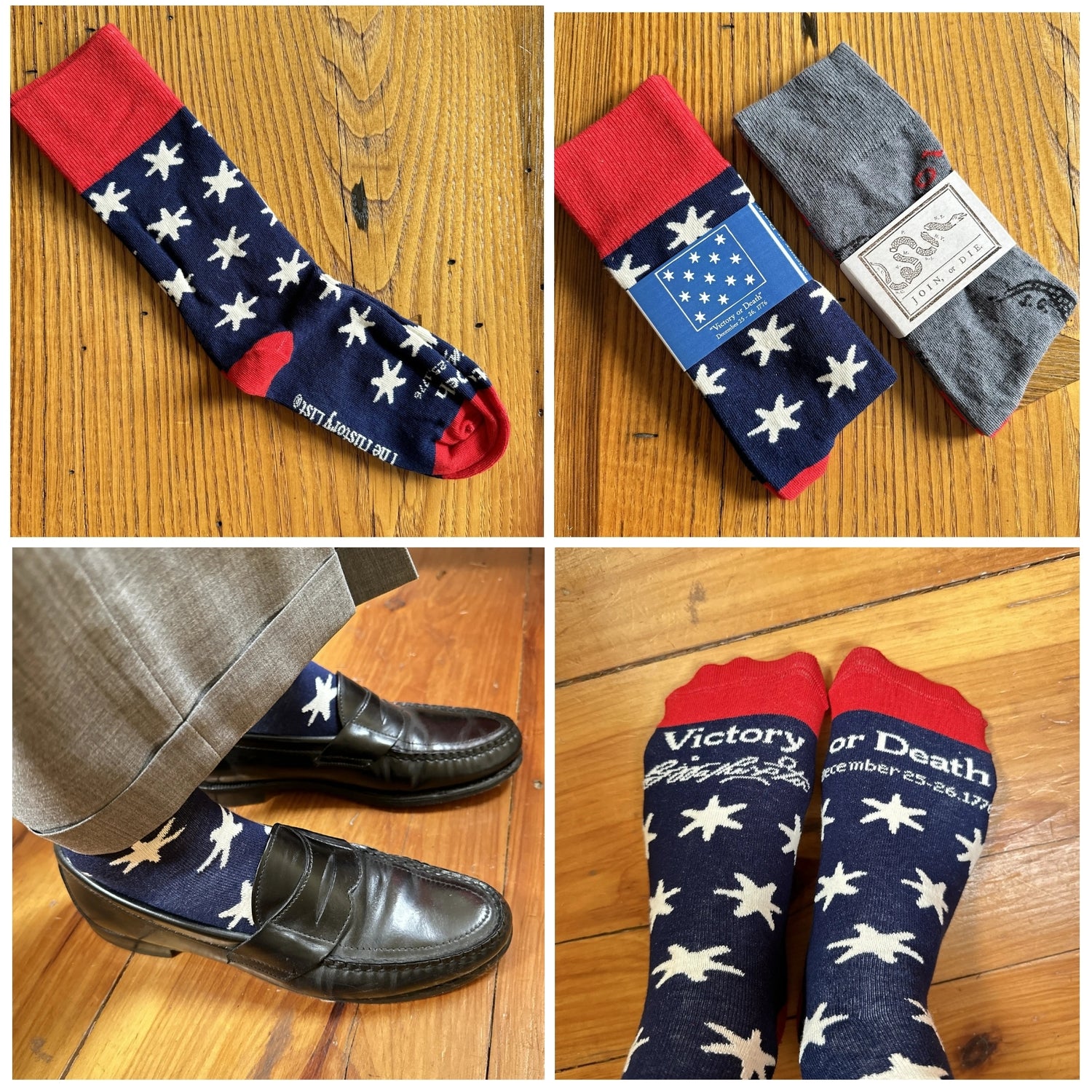 Our originally designed socks based on the illustration "Join or Die", Taken from Franklin’s The Pennsylvania Gazette and the "Victory or Death" Socks" as a reminder of the huge risk and critical victory by Washington and his men on Christmas Day night in 1776.