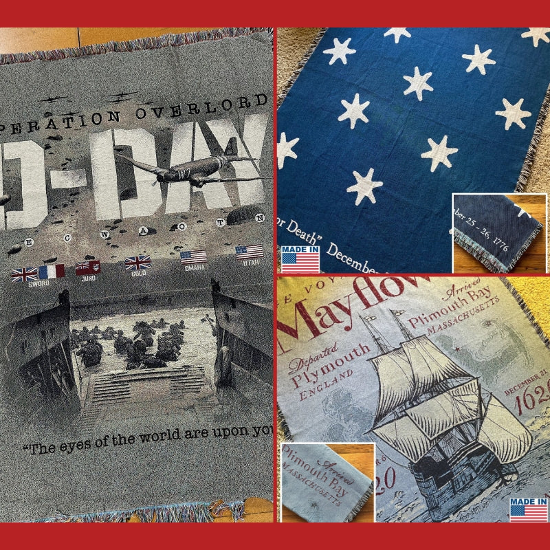 A unique family heirloom, choose between our "Voyage of the Mayflower" woven blanket, the "Victory" blanket woven showing the stars from Washington's HQs flag, and our new D-Day Operation Overlord design.