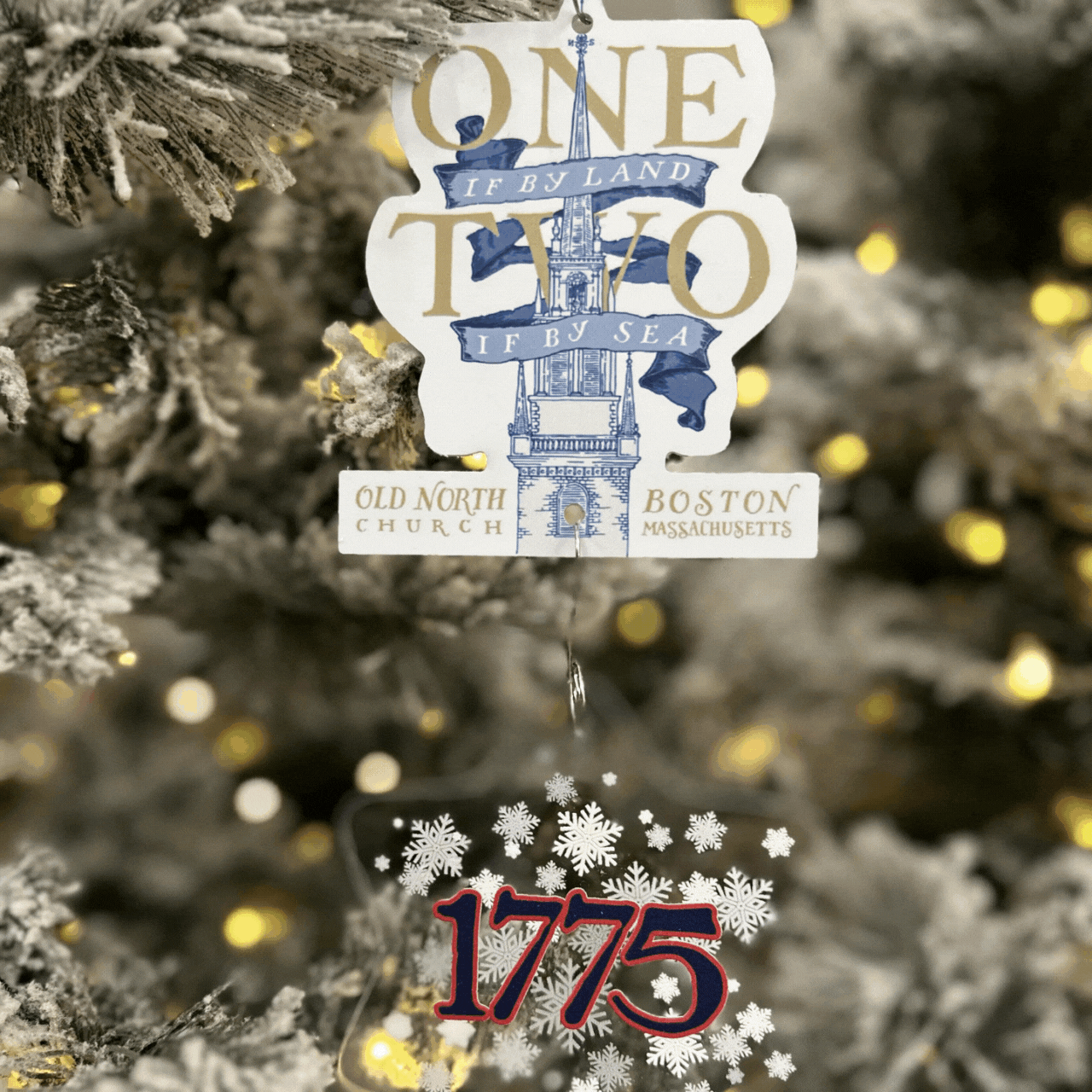 The third in our series of historic ornaments, all made in America — Our original design features our "One if by land, two if by sea" design. On one side is "Old North Church," and on the other, "Lexington Green" and "North Bridge Concord."