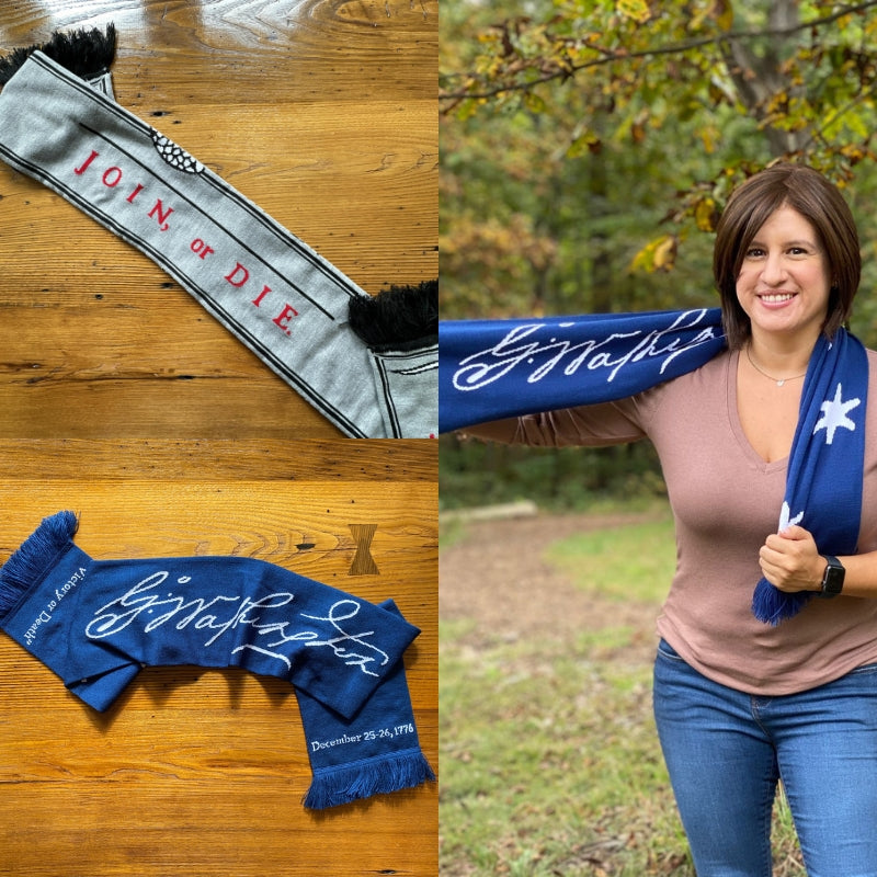 Our original design on a soft acrylic scarf — "Join or Die" Made in America woven scarf adapts Ben Franklin's famous illustration and "Victory or Death" with George Washington's signature woven scarf