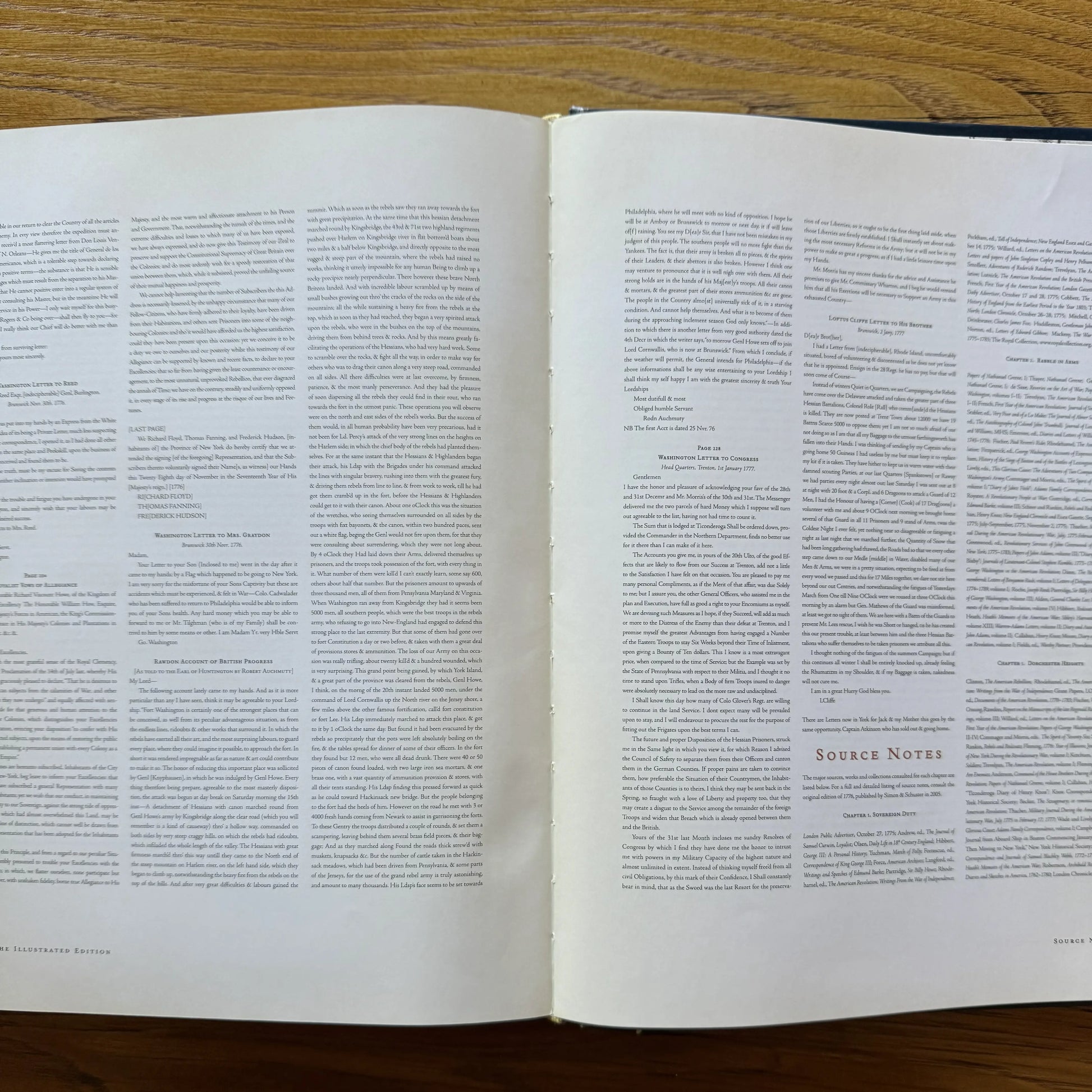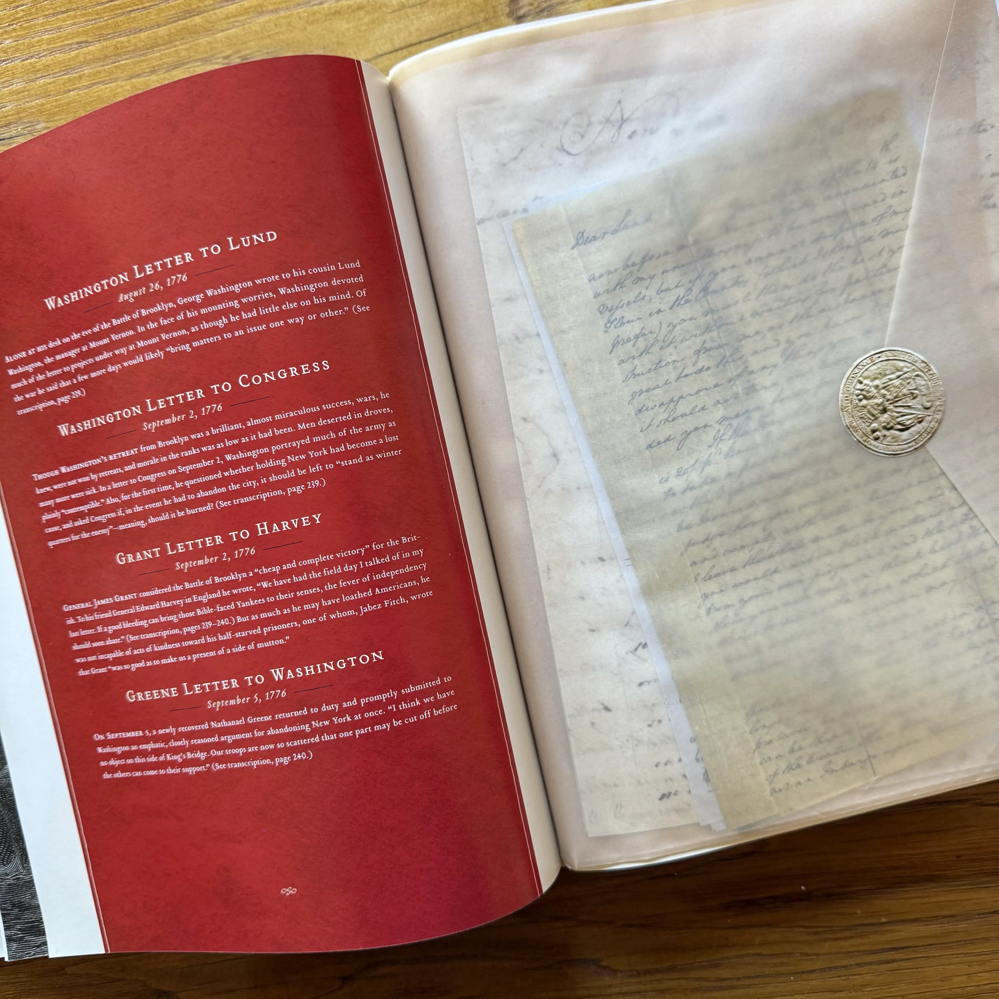 thirty-seven removable replicas of source documents in sealed envelopes, in a slipcase. The ten full-page (imitation) parchment envelopes contain removable facsimiles of key historical documents featured in the book, including letters from George Washington, a July 8, 1776 printing of the Declaration of Independence on the front page of Dunlap’s Pennsylvania Packet, and more.