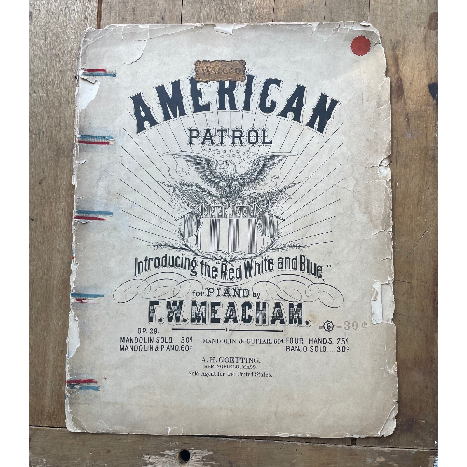 Our original design, with a bald eagle, arrows and olive branch, shield, 13 stars, flag, and the text, "E Pluribus Unum," on a banner below, is based on the sheet music to the popular march, American Patrol, written in 1885 by Frank White (F.W.) Meacham.