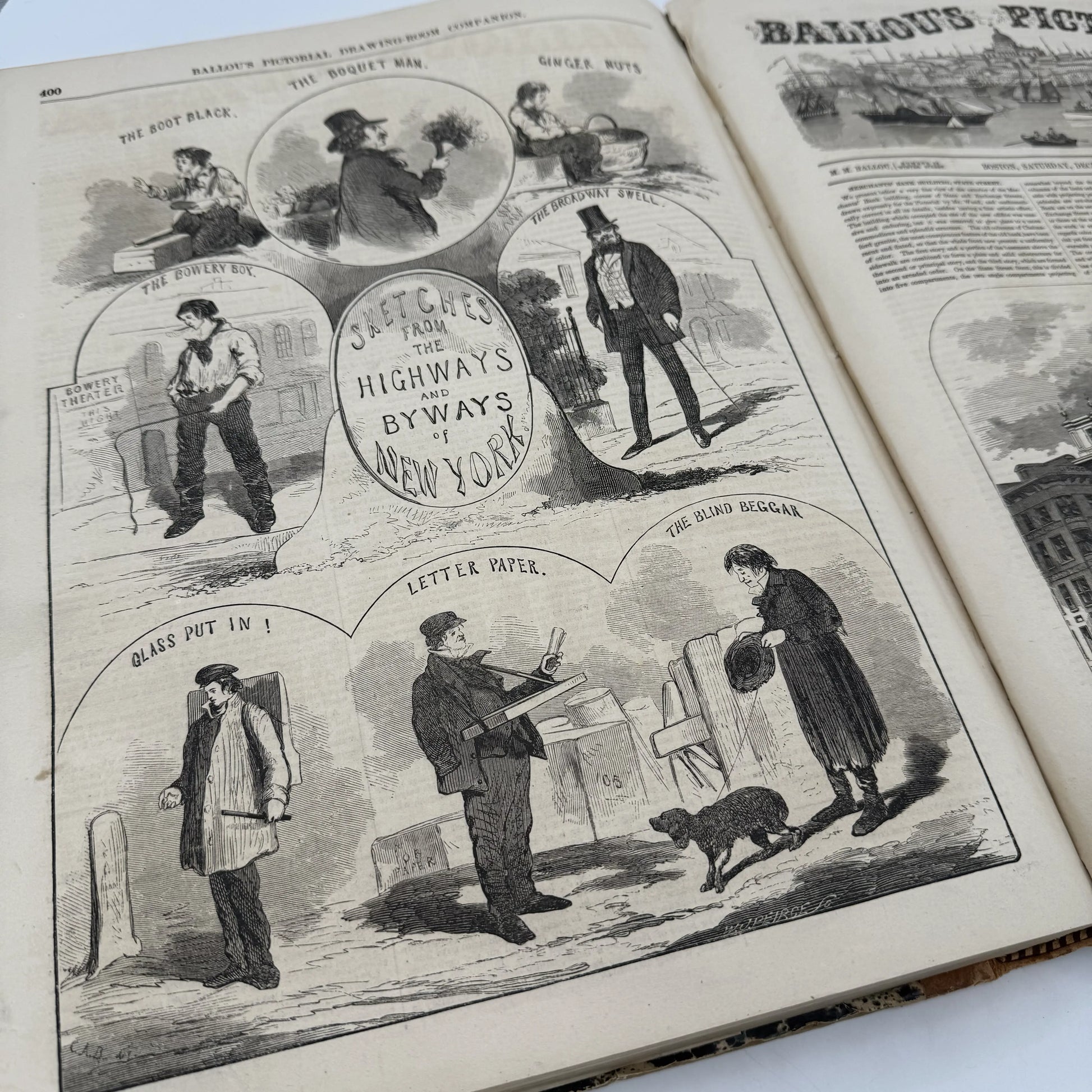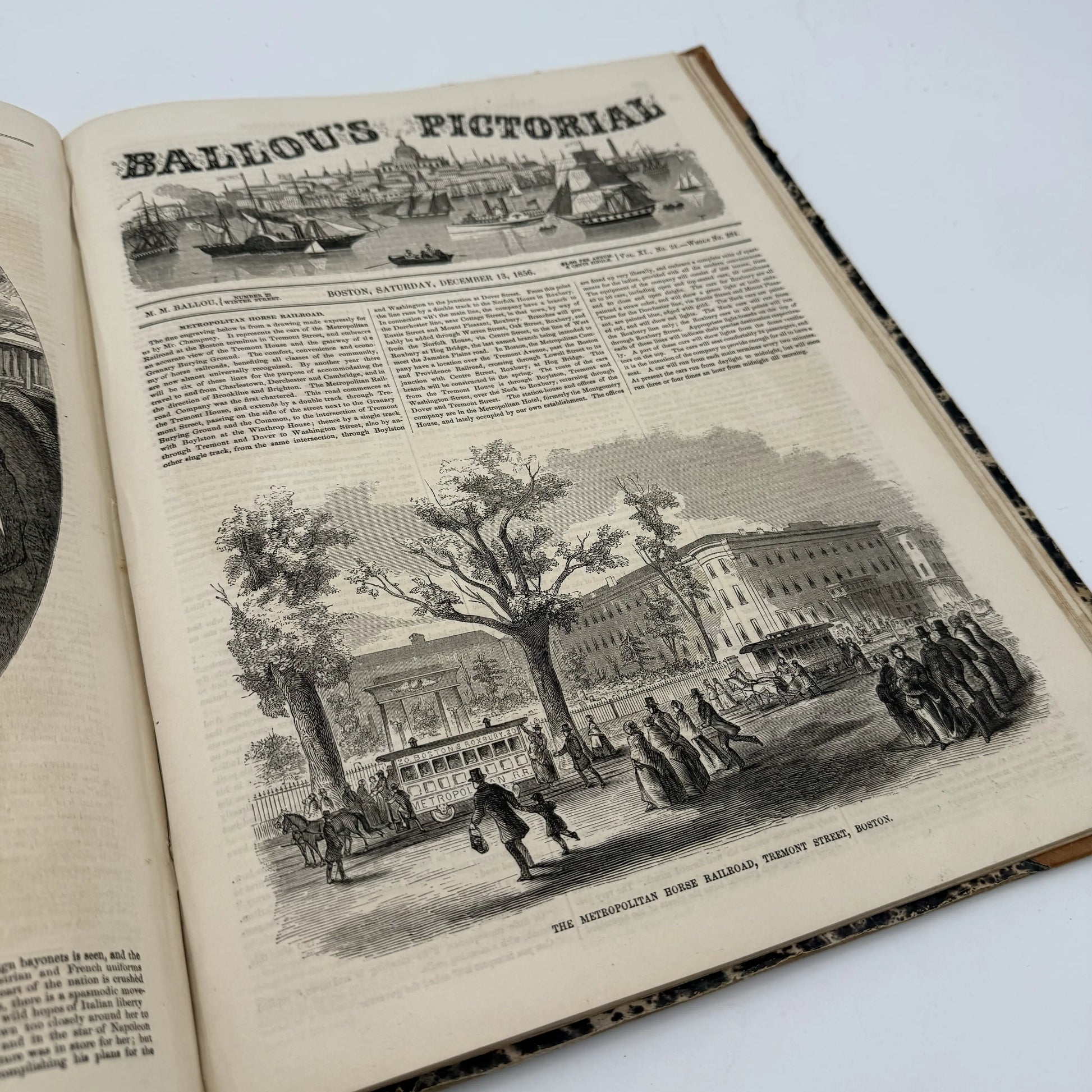 Ballou’s Pictorial Drawing-Room Companion began publication on January 6, 1855, following Maturin Murray Ballou’s purchase of Frederick Gleason’s interest in the original magazine. First launched in 1851 as Gleason’s Pictorial Drawing-Room Companion, the illustrated weekly was based in Boston and quickly became known for its rich engravings and wide-ranging content. After taking full control, Ballou rebranded the magazine under his own name. At its peak, the publication absorbed New York’s Illustrated News in 1853 and continued until it ceased publication in 1859.