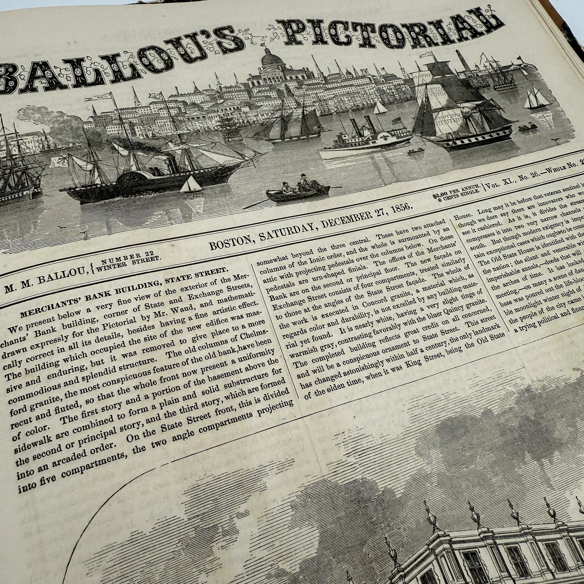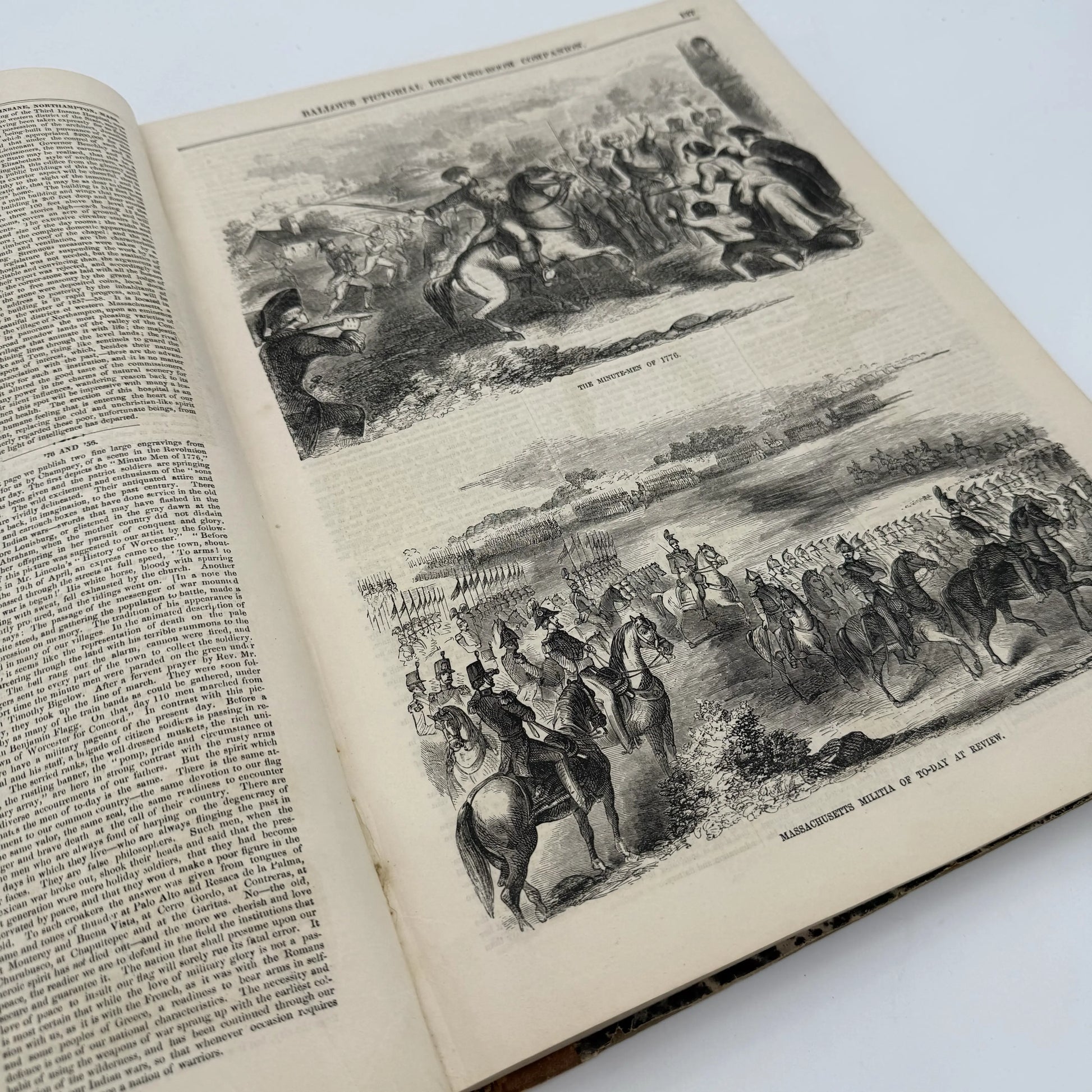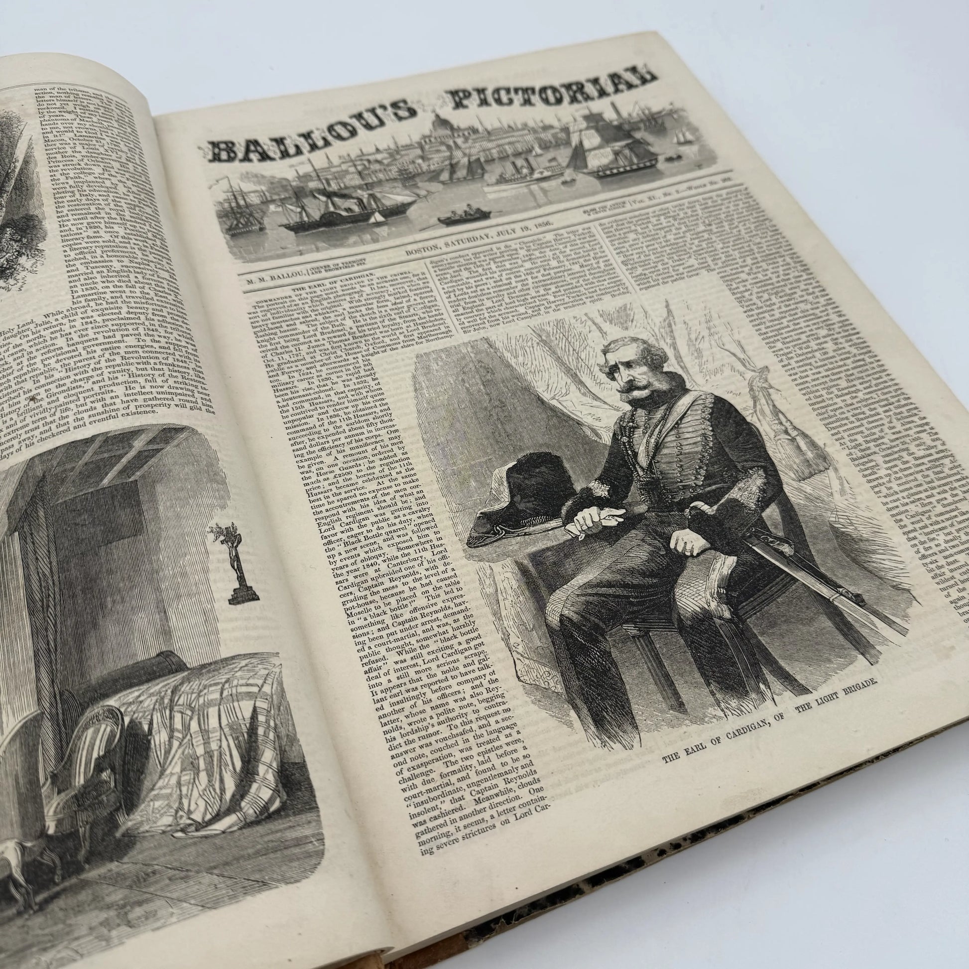 A large compilation of Ballou's Pictorial Drawing-Room Companion with issues from July 5, 1856 to December 13, 1856 in a hard bound volume.