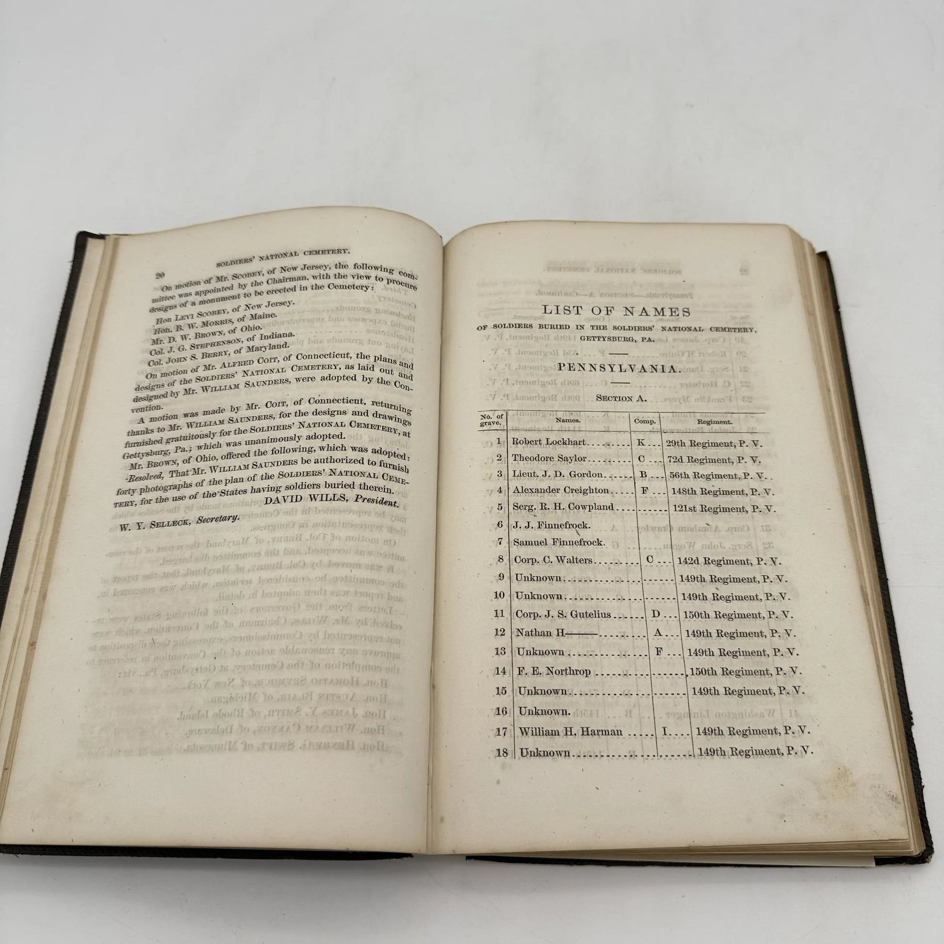 - Includes plans for the design of the cemetery, the re-interrment of the dead, and the expenses required to finish the cemetery, a list of names of soldiers buried in the Pennsylvania State Lot, by company and regiment, and the section of the cemetery in which they are buried;