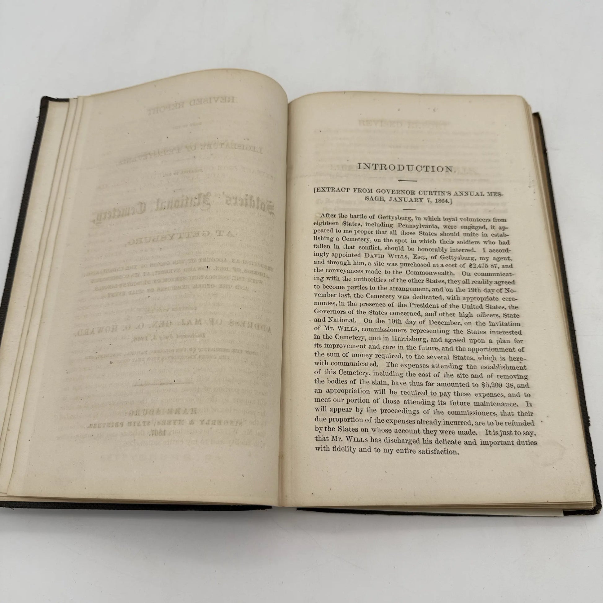 Full title: Revised report made to the legislature of Pennsylvania, relative to the Soldiers' National Cemetery at Gettysburg, embracing an account of the origin of the undertaking; address of Hon. Edward Everett, at its consecration, with the dedicatory speech of President Lincoln, and the other exercises of that event; together with the address of Maj. Gen. O.O. Howard, delivered July 4, 1866 [i.e. 1865], upon the dedication of the Soldiers' National Monument and the other proceedings upon that occasion. Published by Harrisburg, Singerly & Myers, State Printers, in 1867. 282pp.
