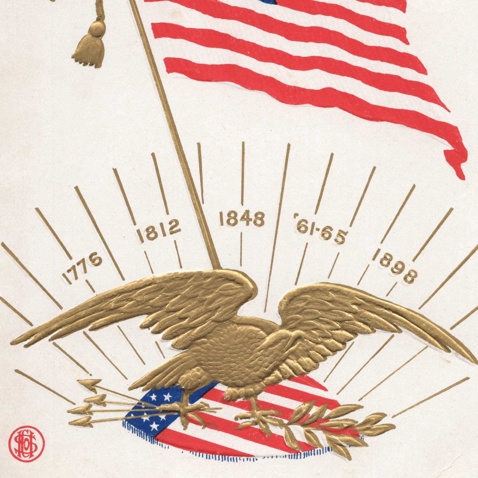 Along the rays are the dates 1776, 1812, 1848, ’61–’65, and 1898, marking America’s major conflicts from the Revolution through the Spanish–American War. See the Historical Background below for more on the 46-star flag and the conflicts.
