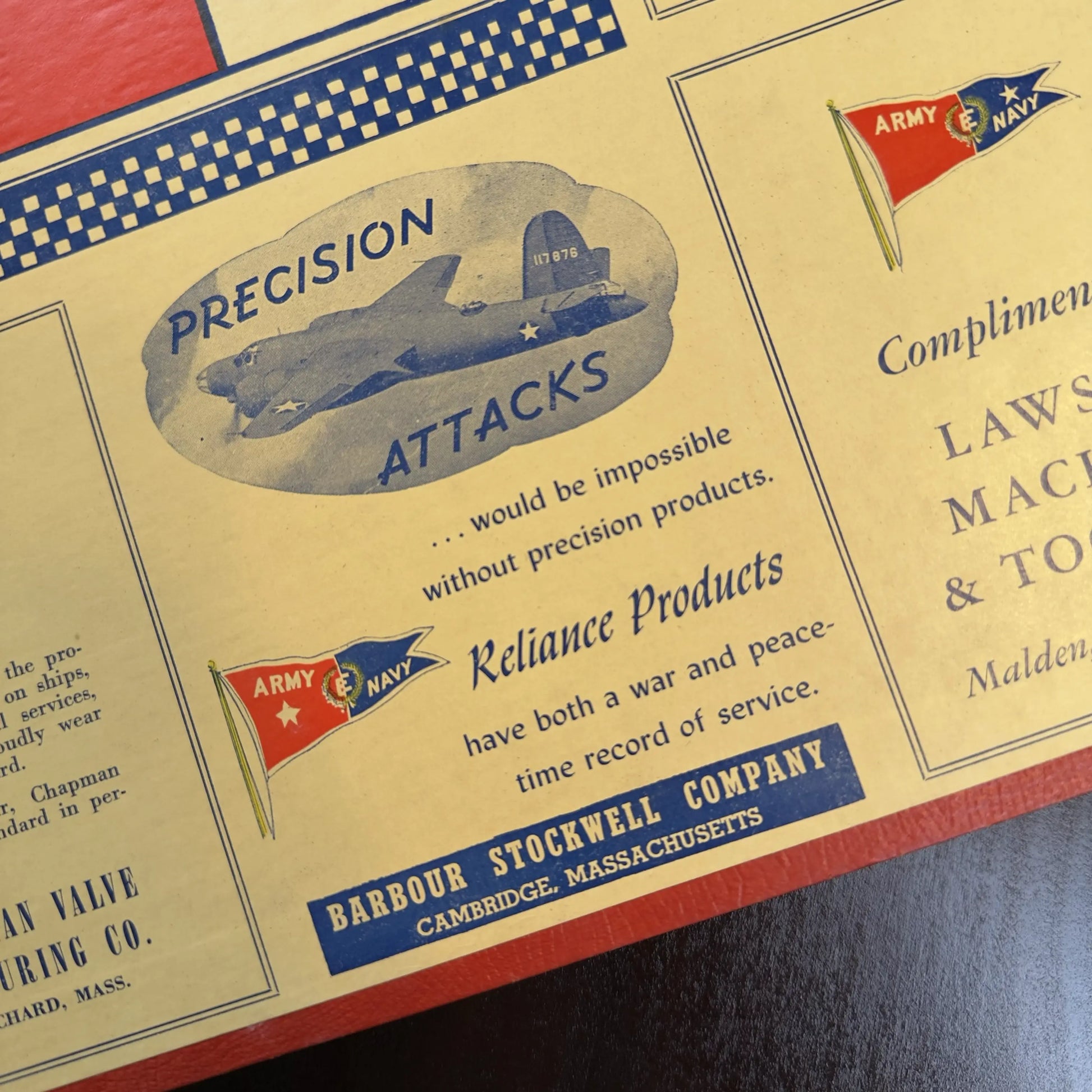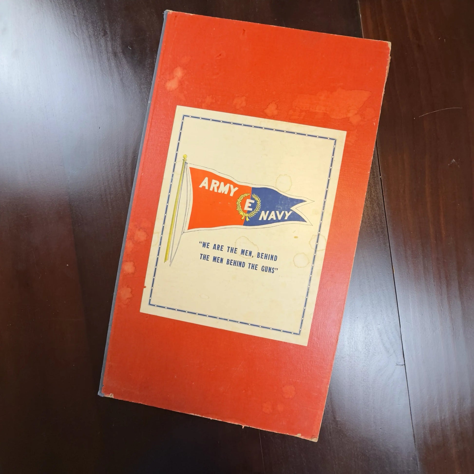 On the front, an image of the WWII Army-Navy "E" Award banner, also known as the Army-Navy Production Award. This award was presented during World War II to civilian companies and corporations who demonstrated "Excellence in Production" of war items. More on the "E" award below.