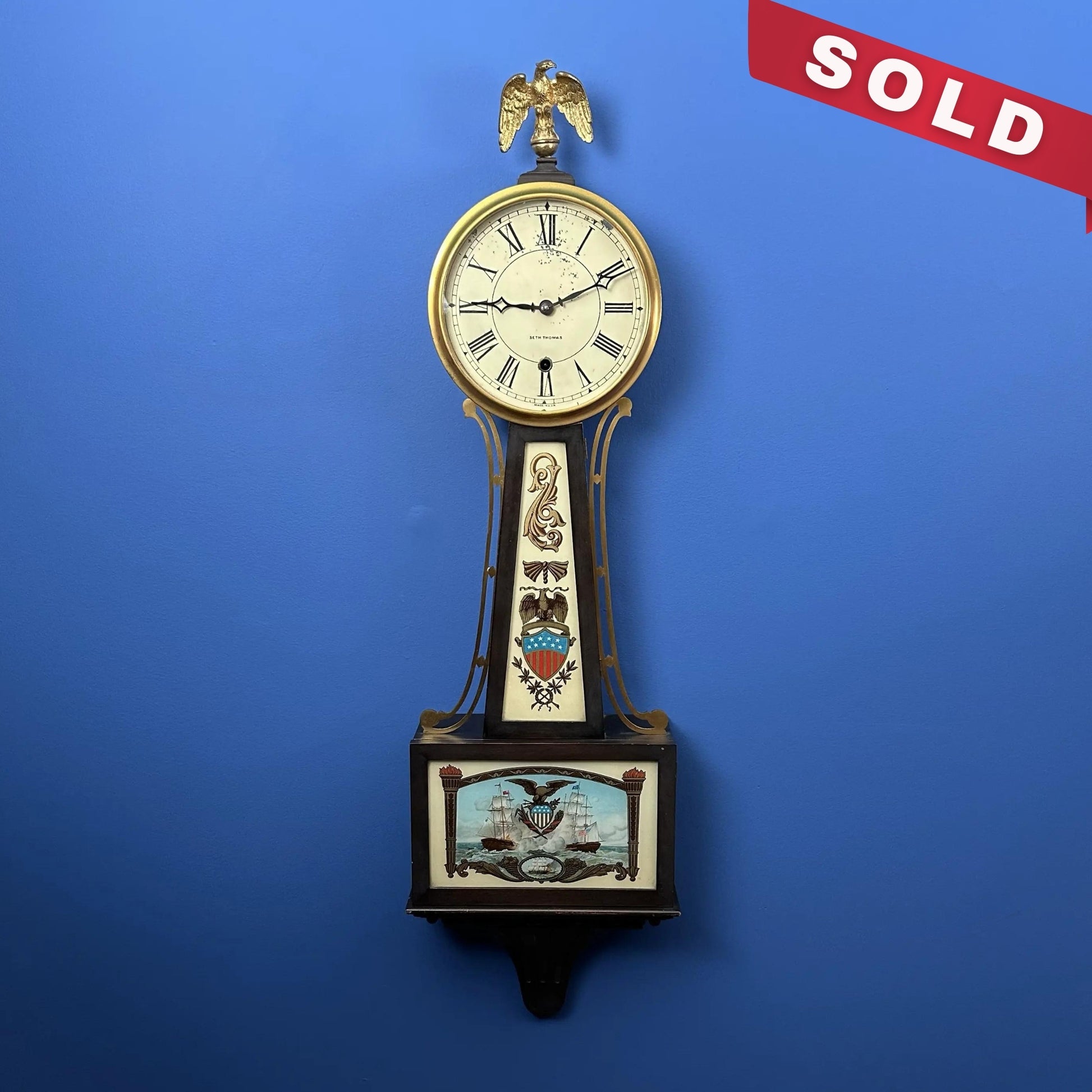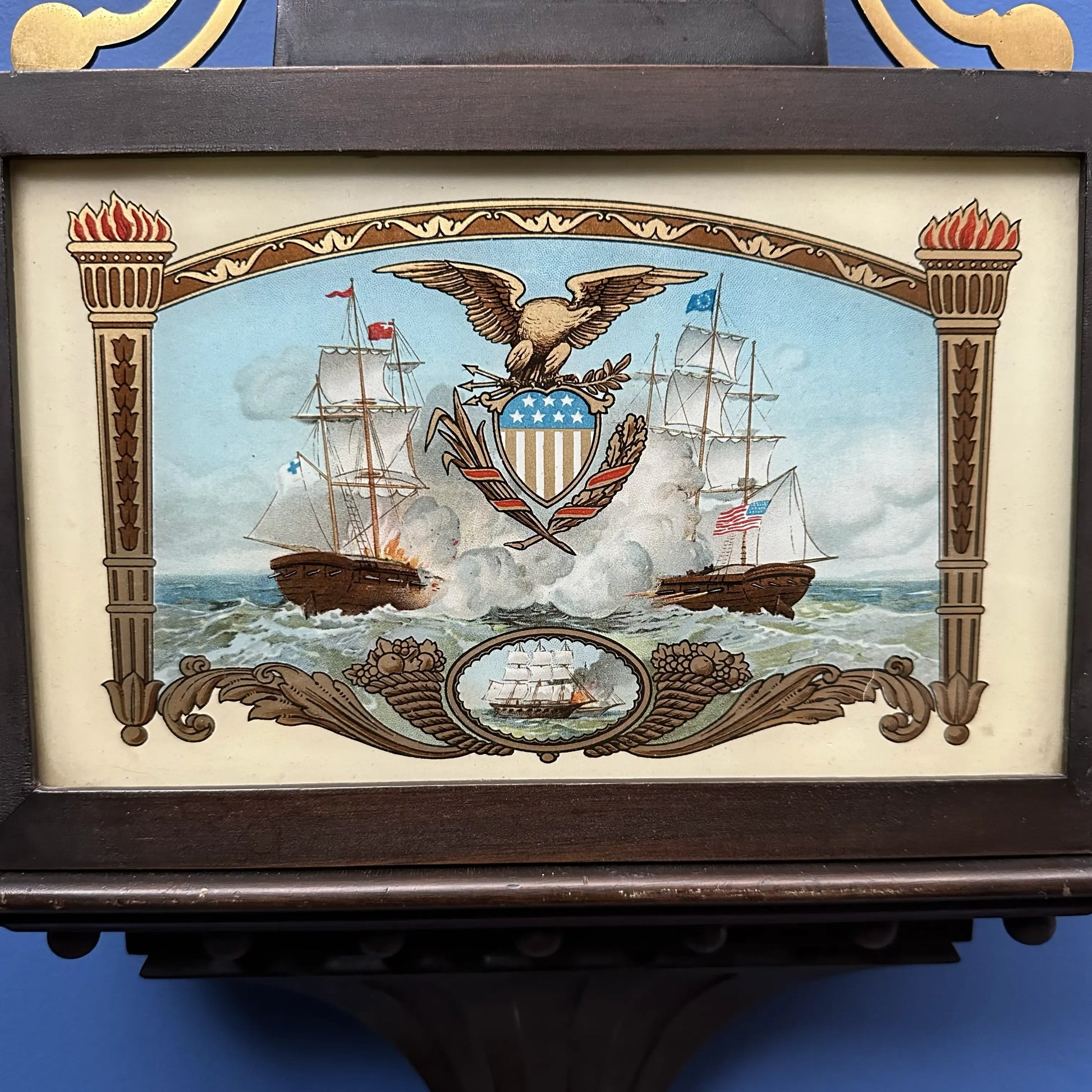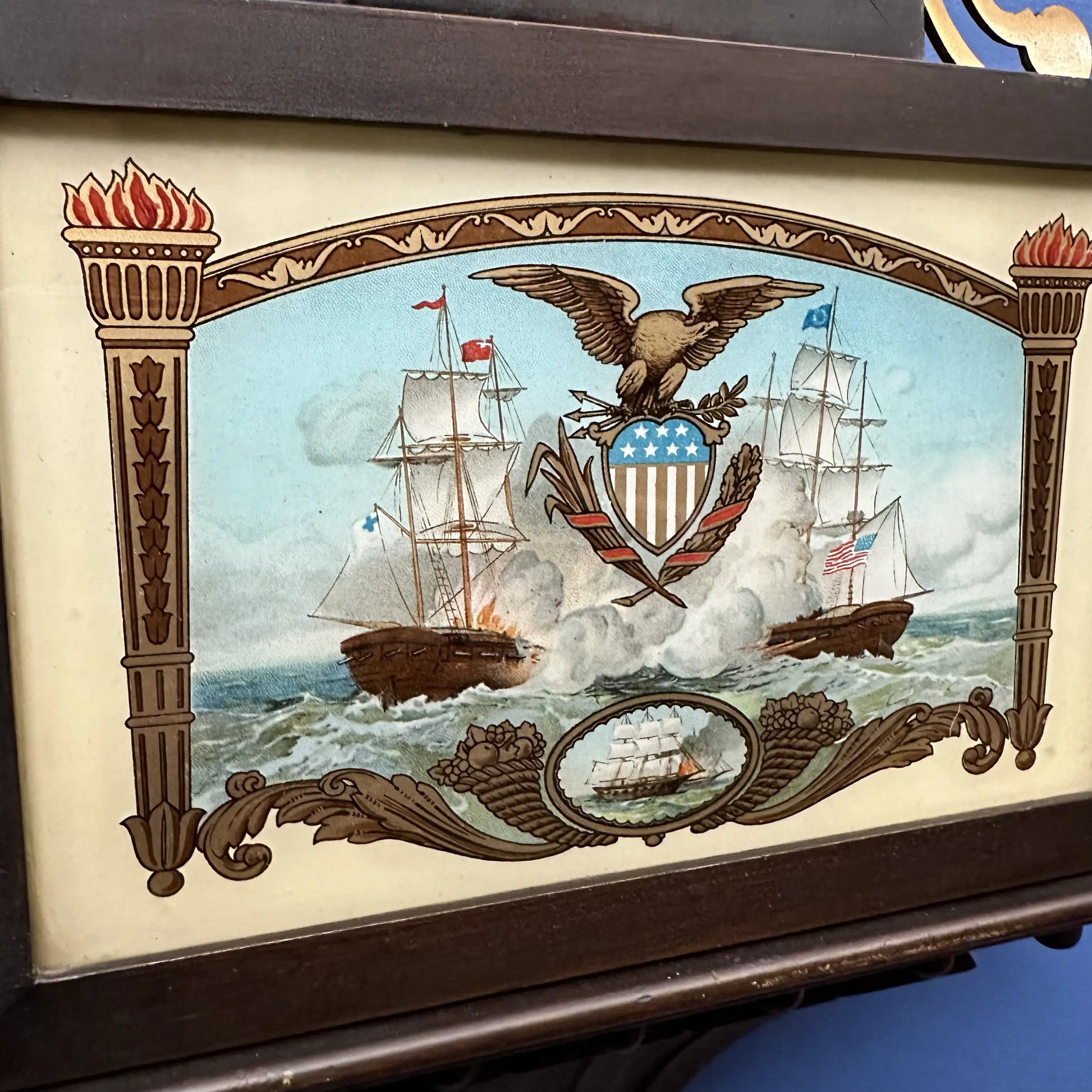 Seth Thomas mahogany "banjo style" patriotic wall clock from the early 1800s depicting a naval engagement between two large sailing ships and topped with  gold-toned metal eagle.