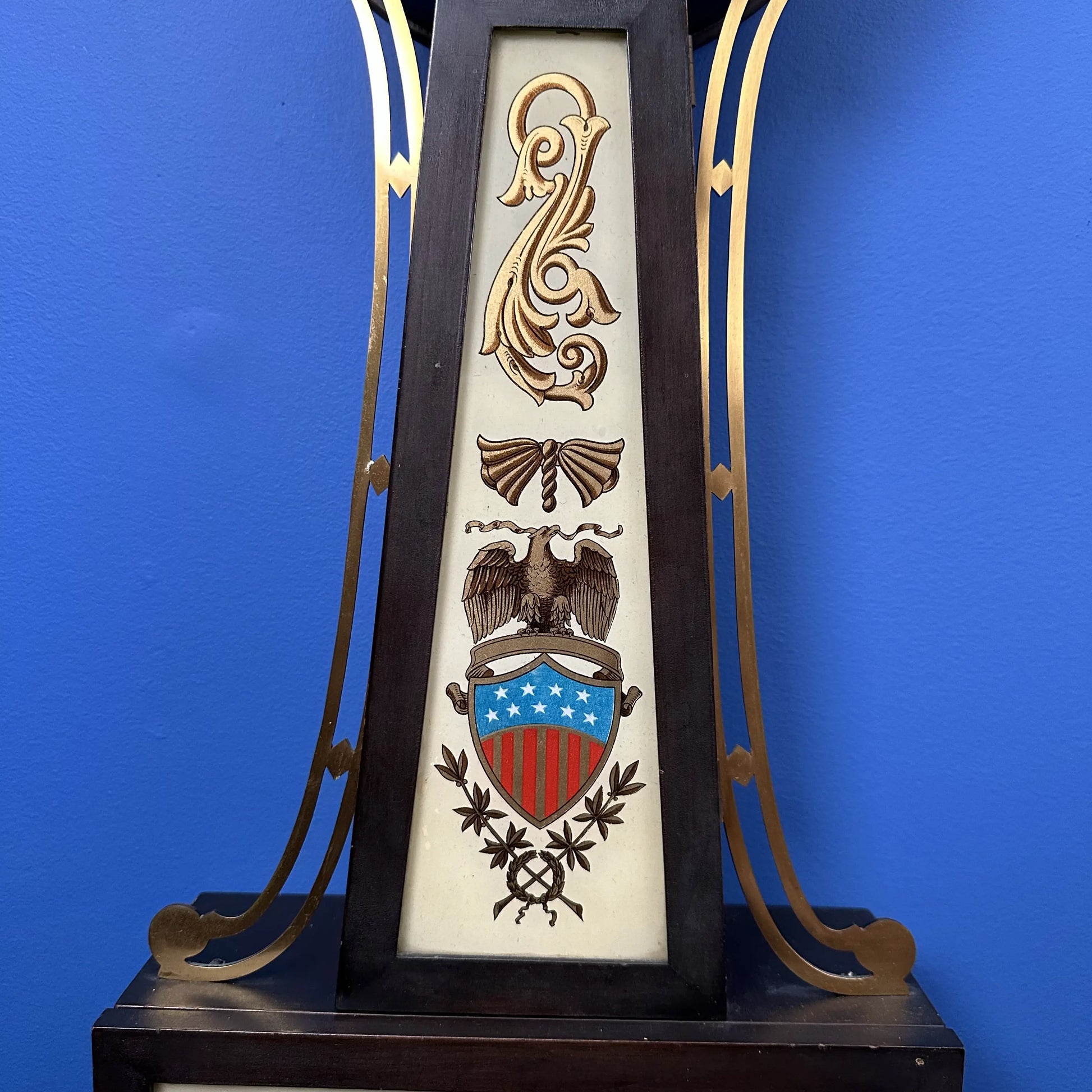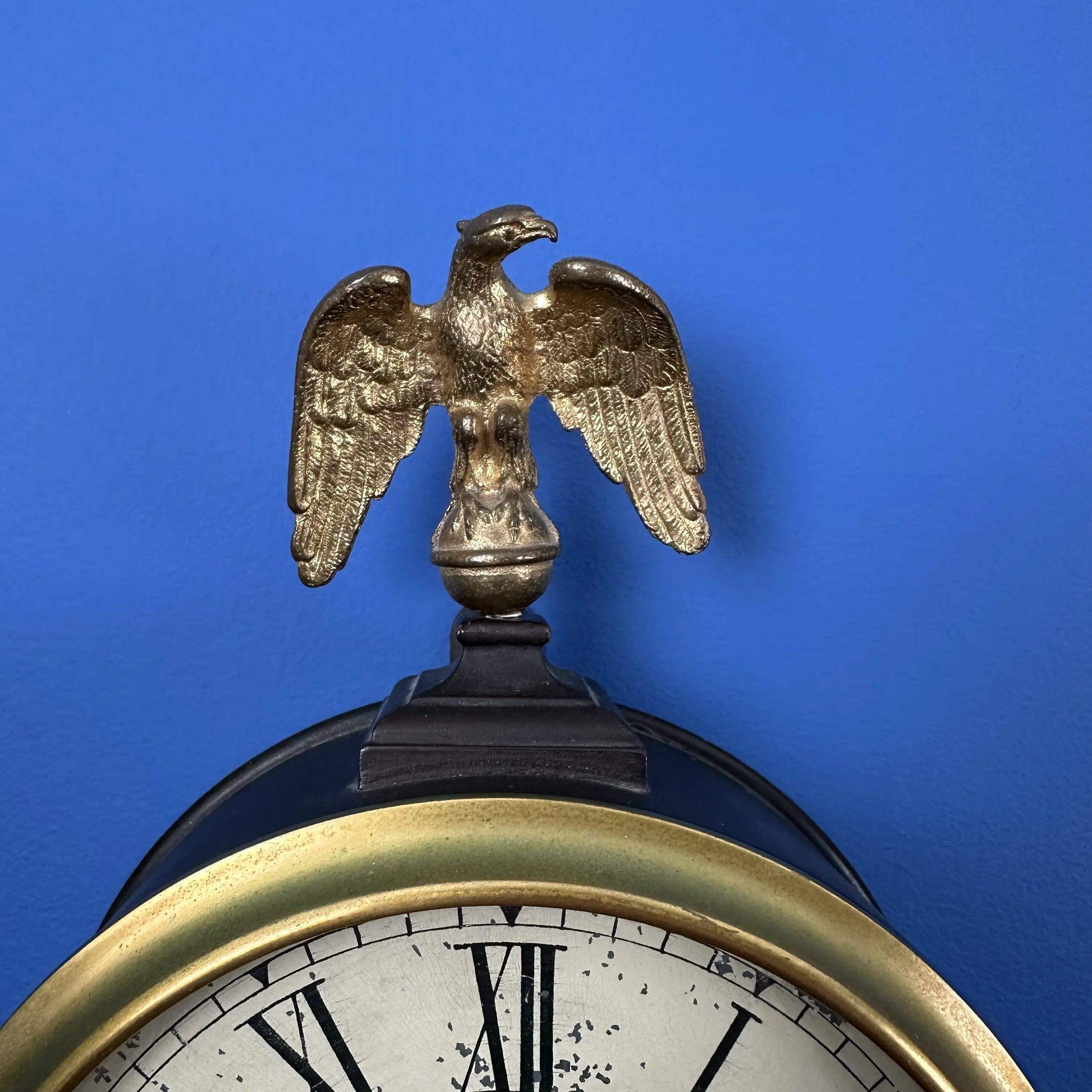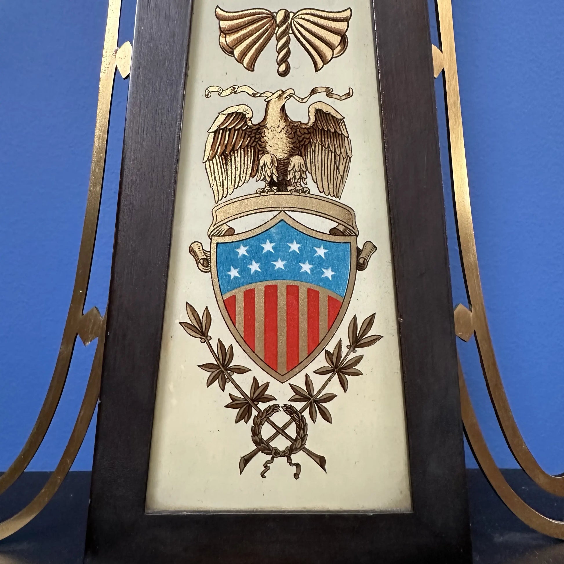 Seth Thomas mahogany "banjo style" patriotic wall clock from the early 1800s depicting a naval engagement between two large sailing ships and topped with  gold-toned metal eagle.