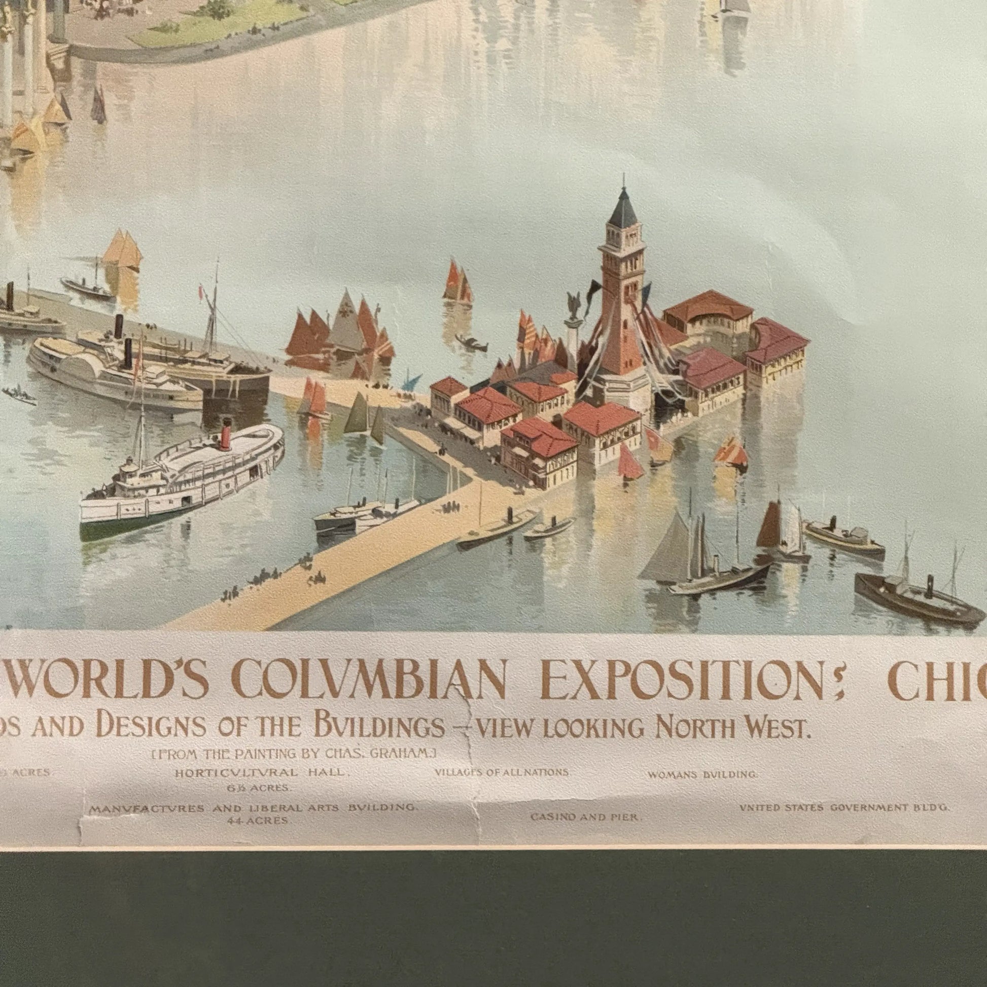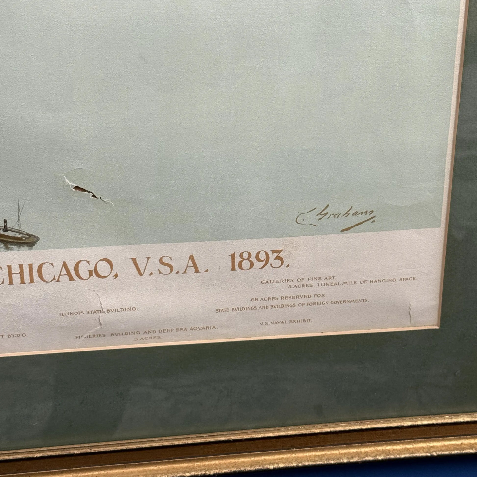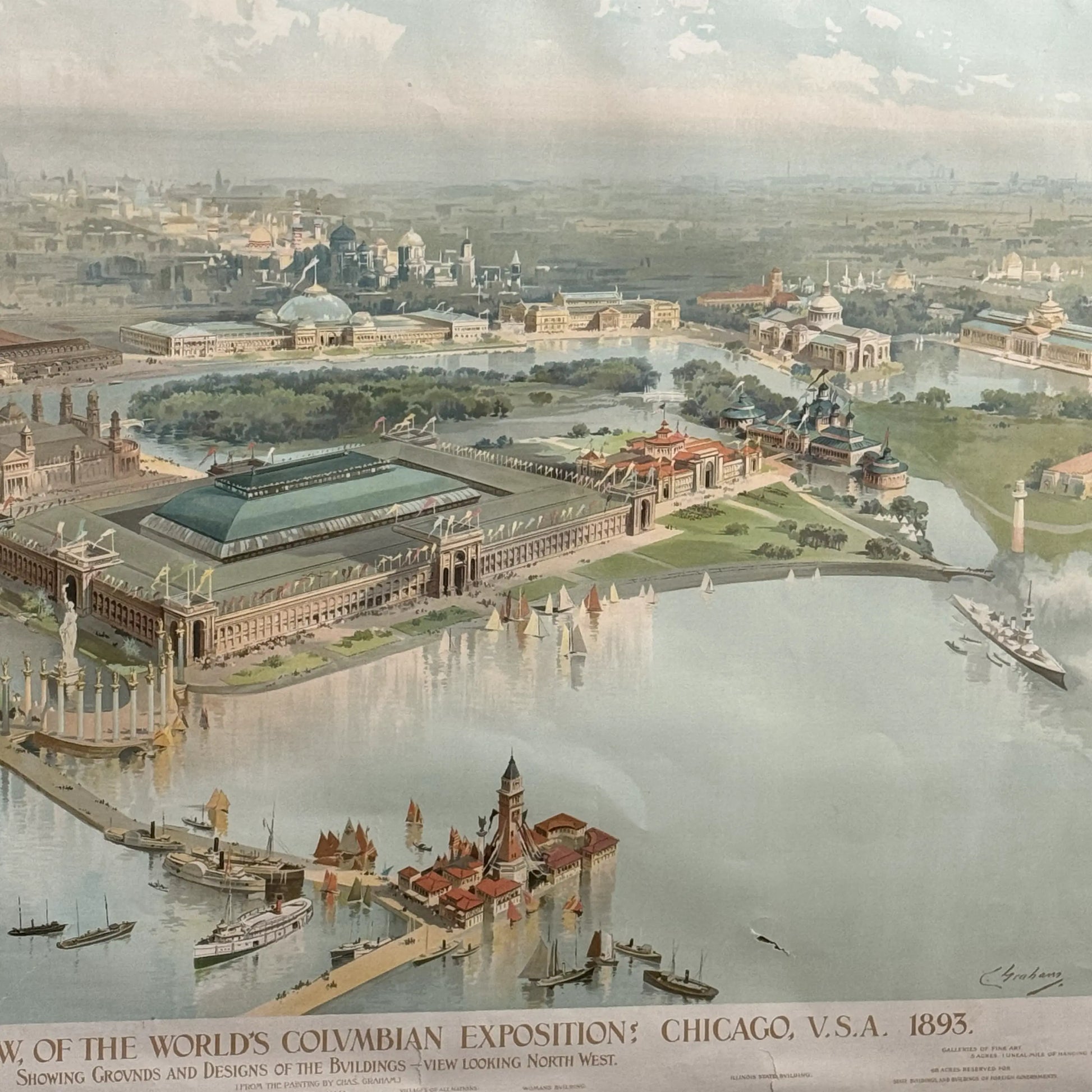 Originally crafted as part of a portfolio for the World’s Columbian Exposition, this stunning print by Charles S. Graham, derived from a watercolor, captures an aerial view of the entire fairgrounds when viewed from the north west
