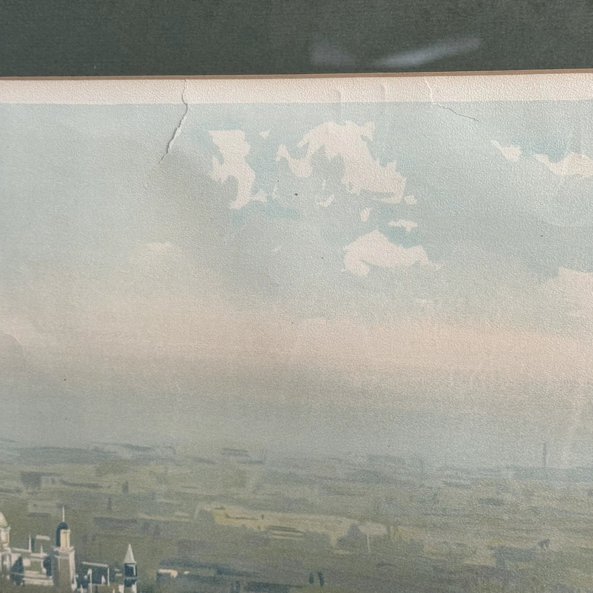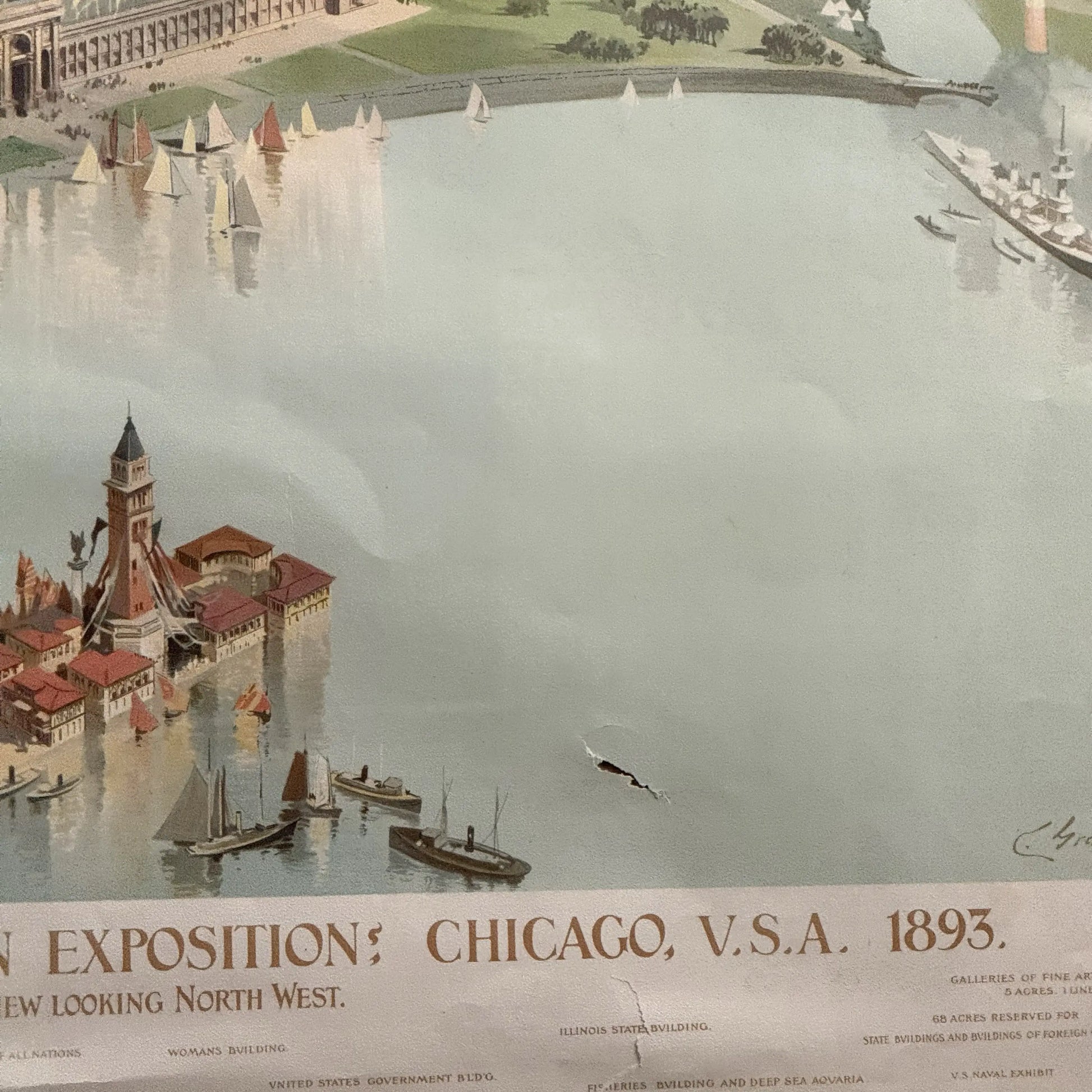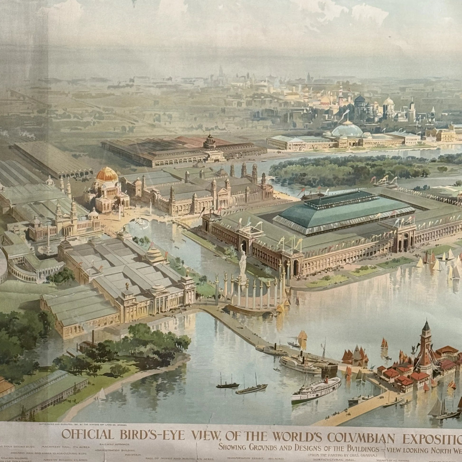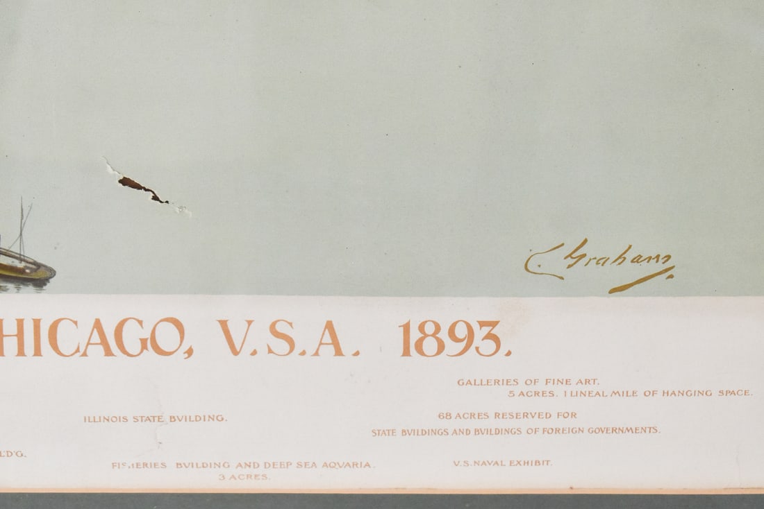 Originally crafted as part of a portfolio for the World’s Columbian Exposition, this stunning print by Charles S. Graham, derived from a watercolor, captures an aerial view of the entire fairgrounds when viewed from the north west