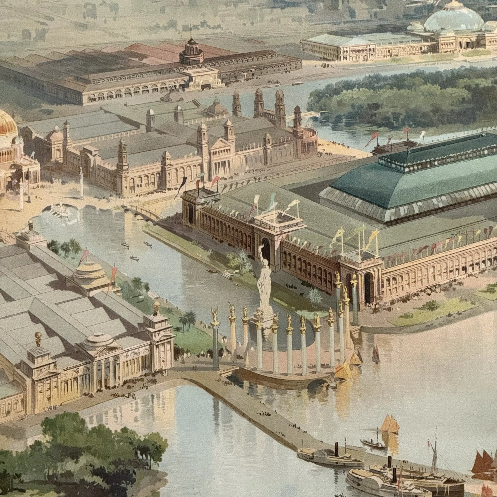 Spreading over 600 acres along the coast of Lake Michigan, one can pick out various highlights from the event, including the Fine Arts Building, the United States Government Building, various country and state pavilions, a lighthouse, a functioning battleship, the Casino, a dairy, the Agricultural Building, the Woman’s Building, the Transportation Building, and dozens of other structures created by the country’s best architects.