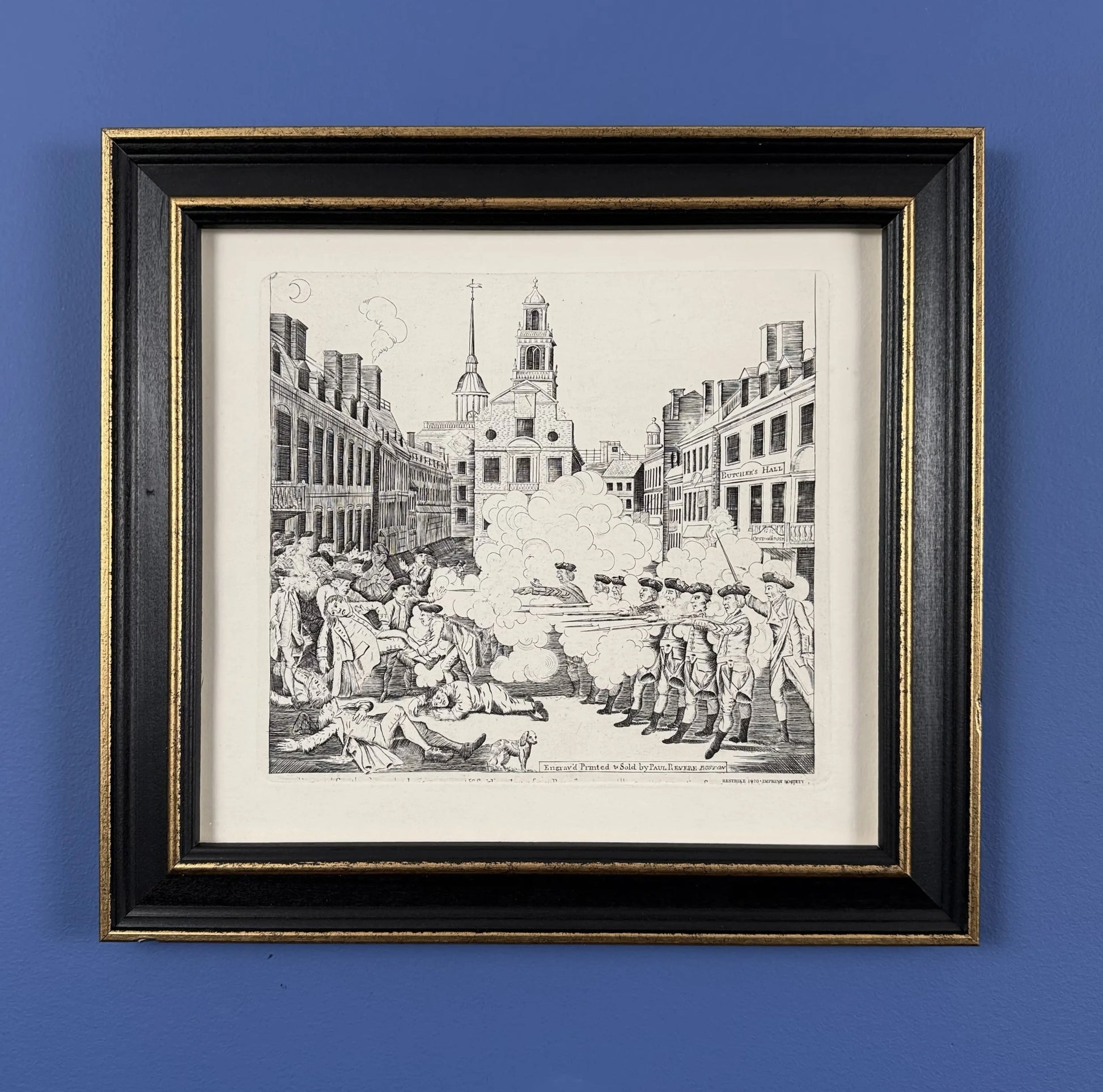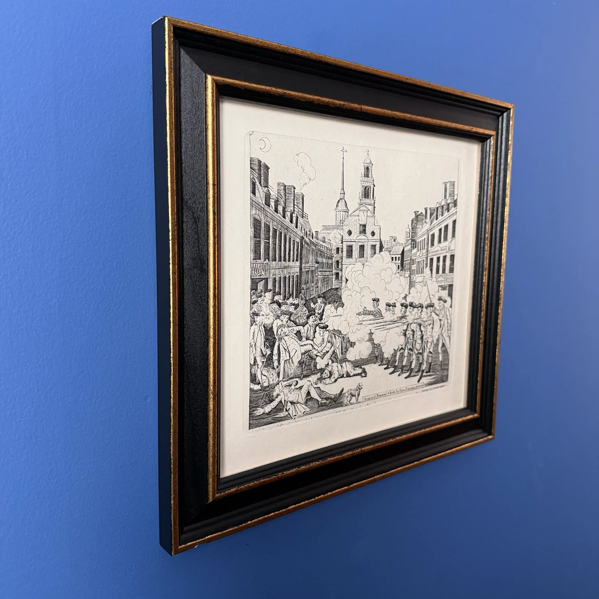 Boston Massacre print made from Revere's original plate — Black frame with gold accent