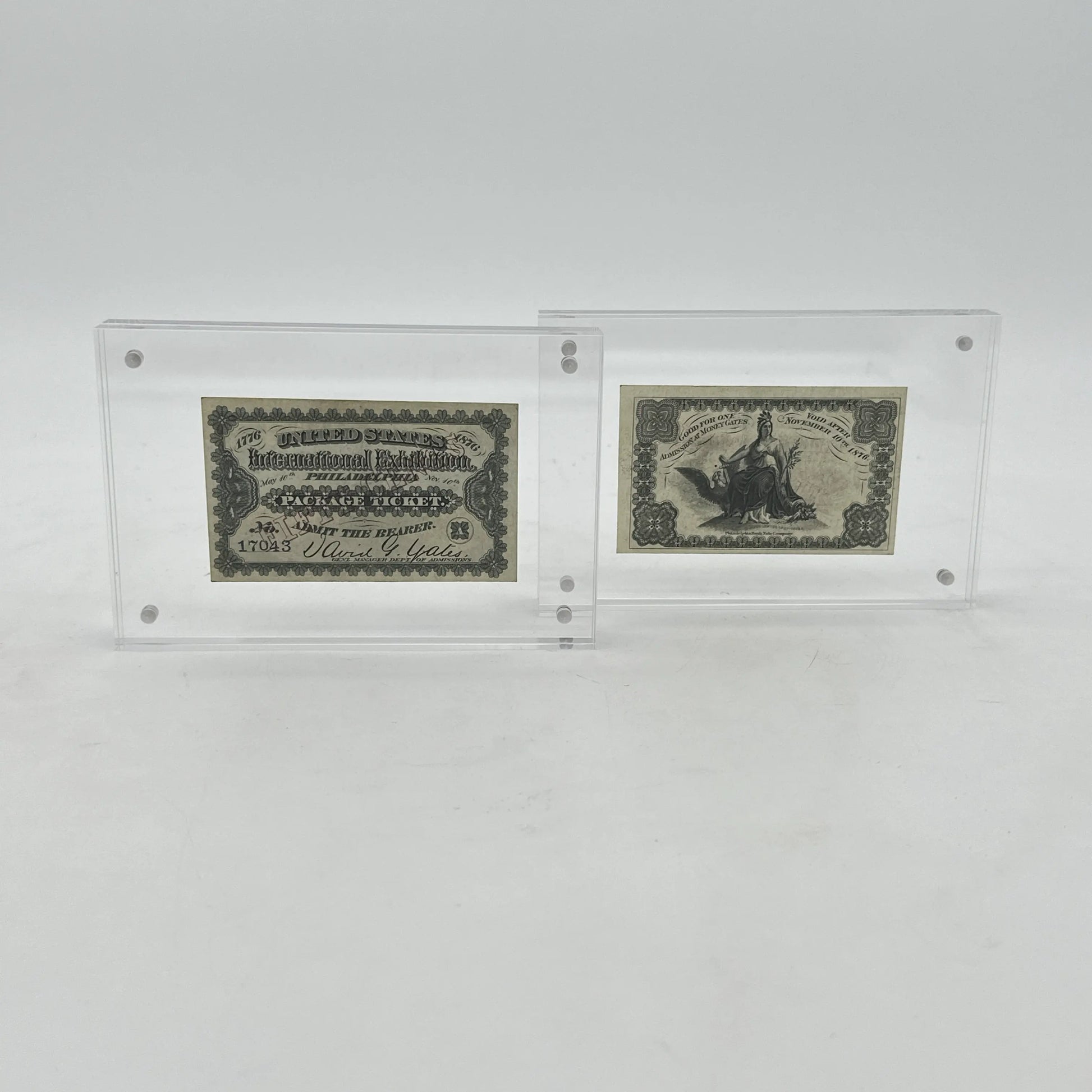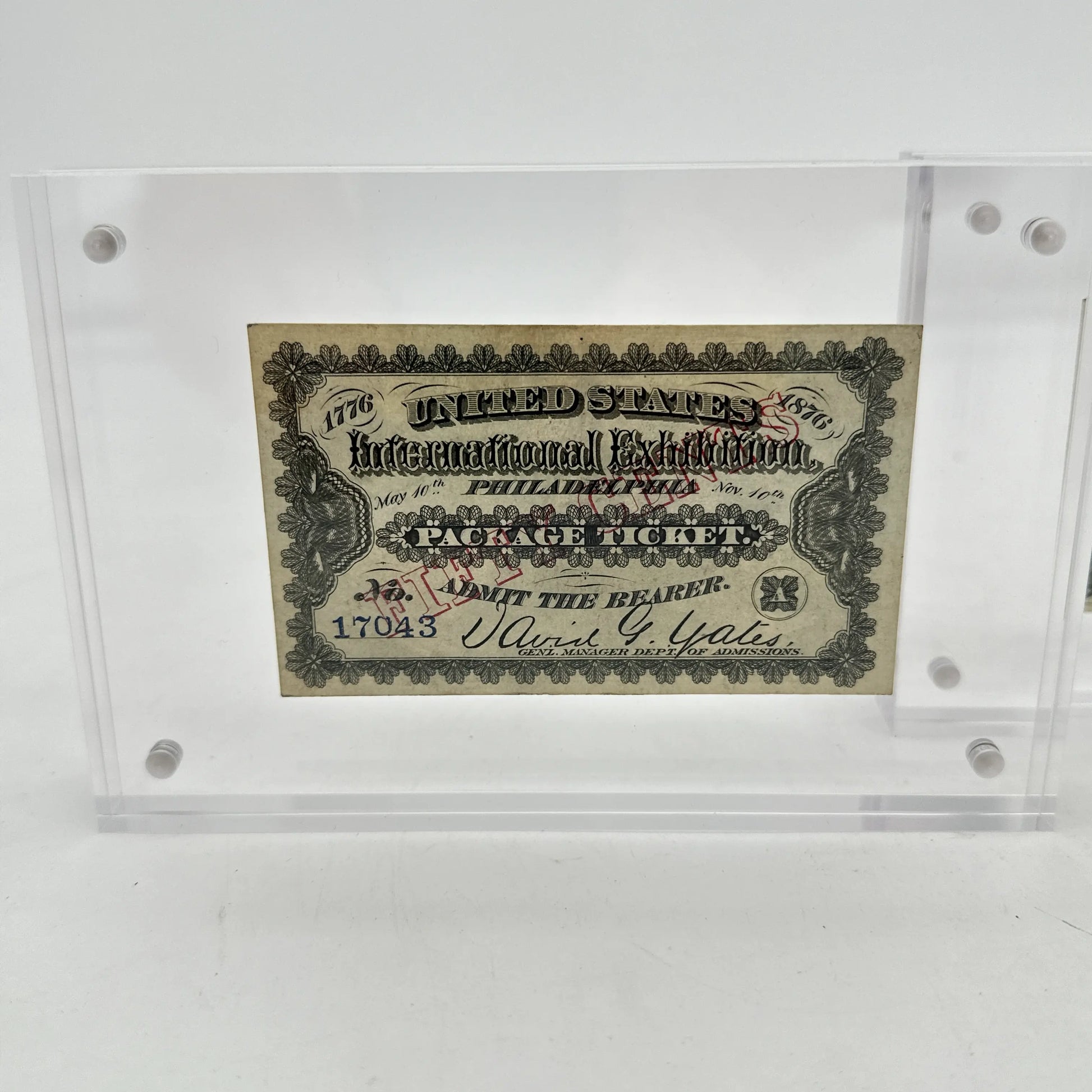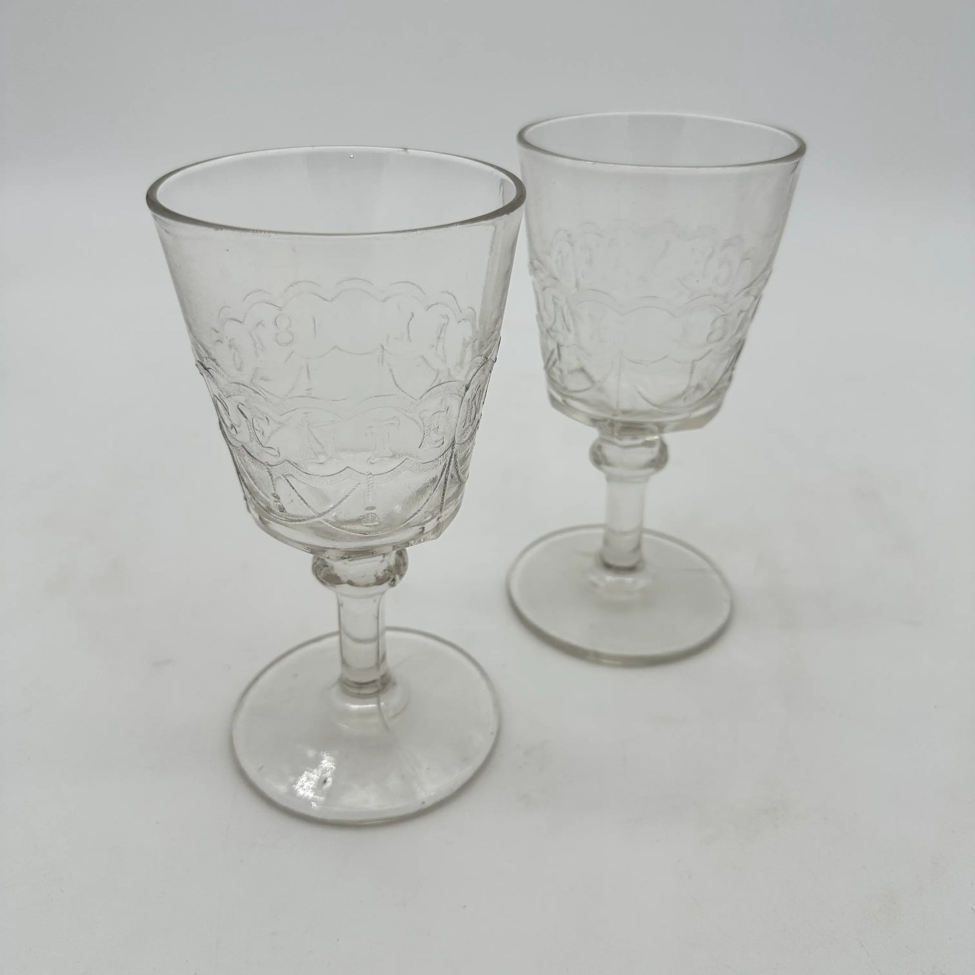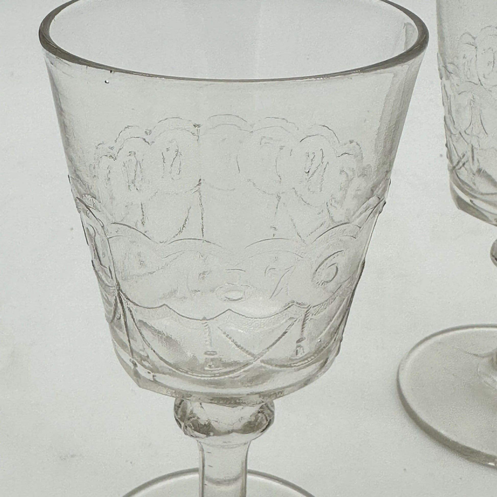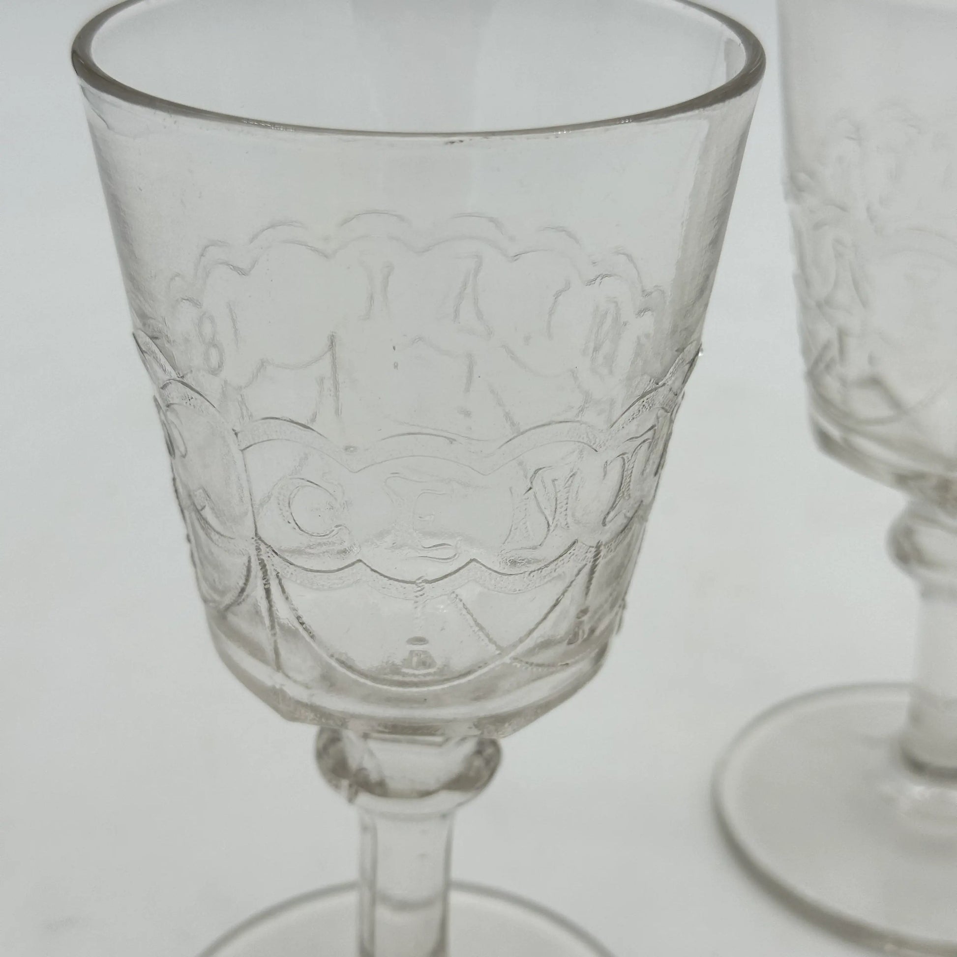 - SOLD — Centennial Goblets + Admission Tickets to the World's Fair — 6.5" high — It's hard to see in the photo, but the word "CENTENNIAL" and "1876" appear in large letters and numbers around the glass in a banner with scalloped edges with cord with tassels suspended from it.
