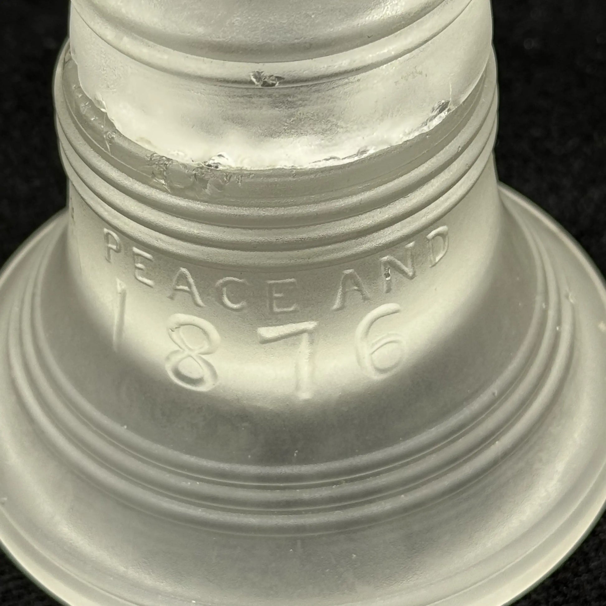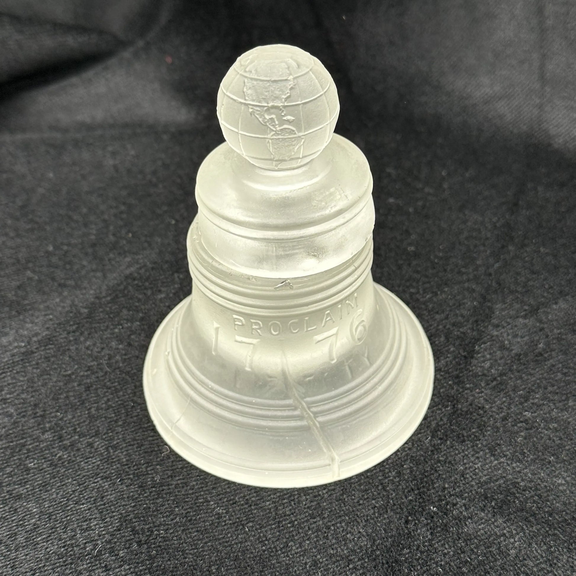 The piece is shaped in the likeness of the Liberty Bell with the iconic cracked with a globe finial to top the cover.