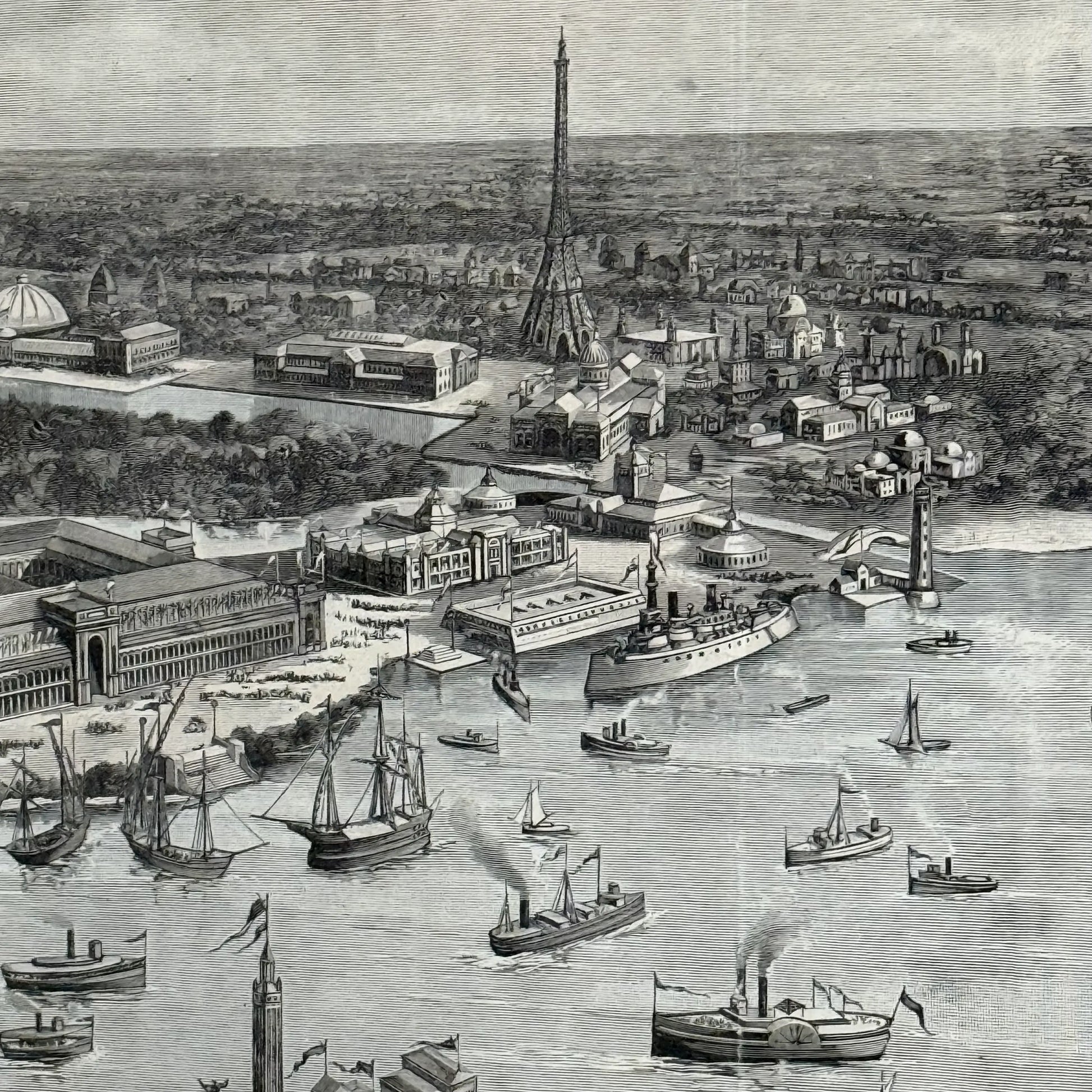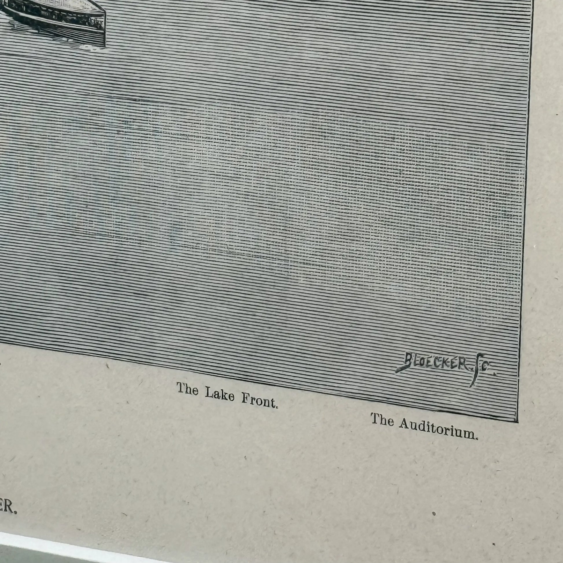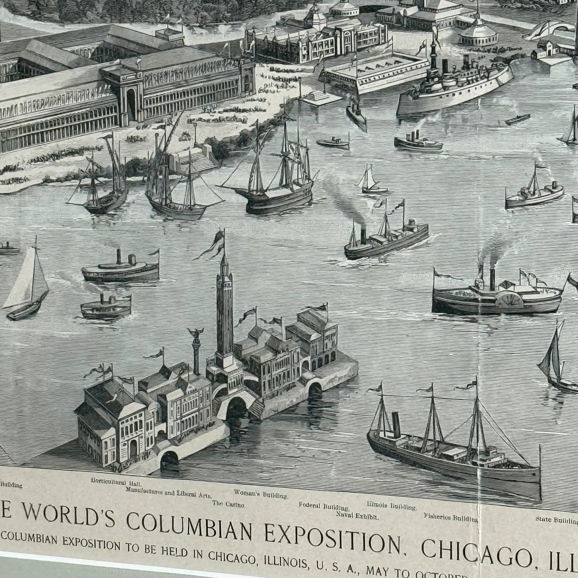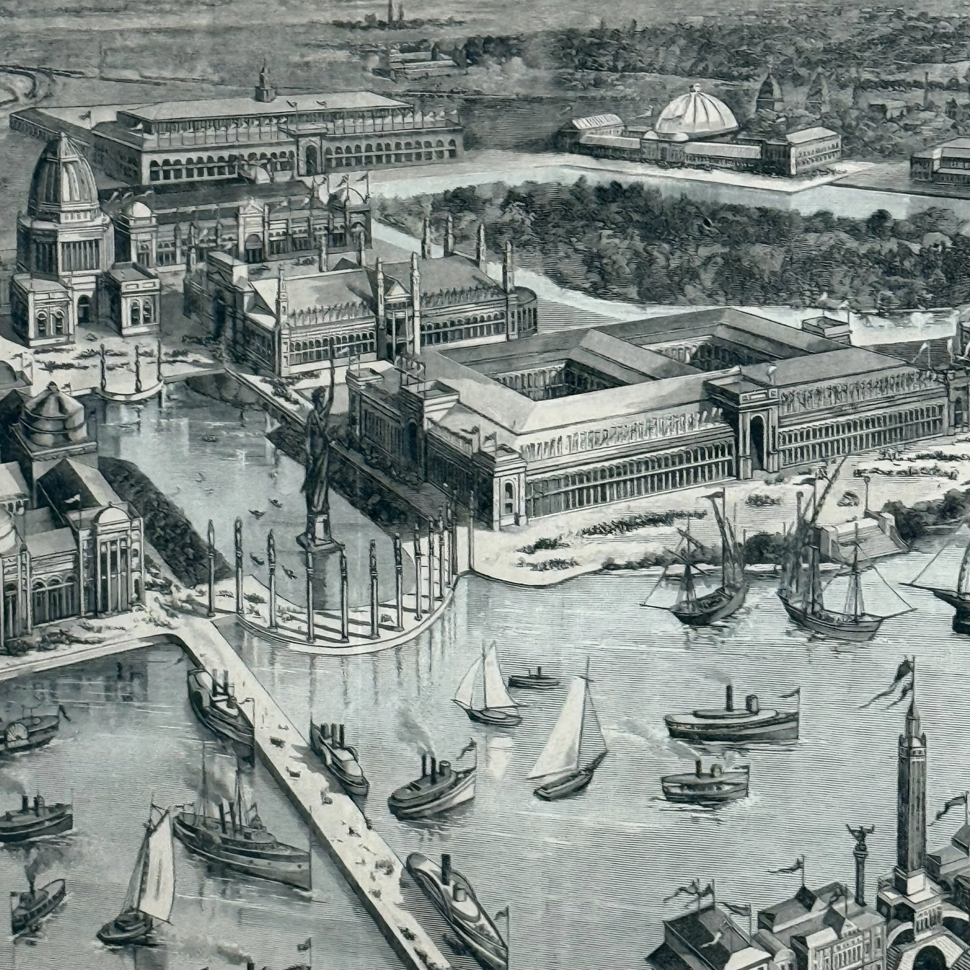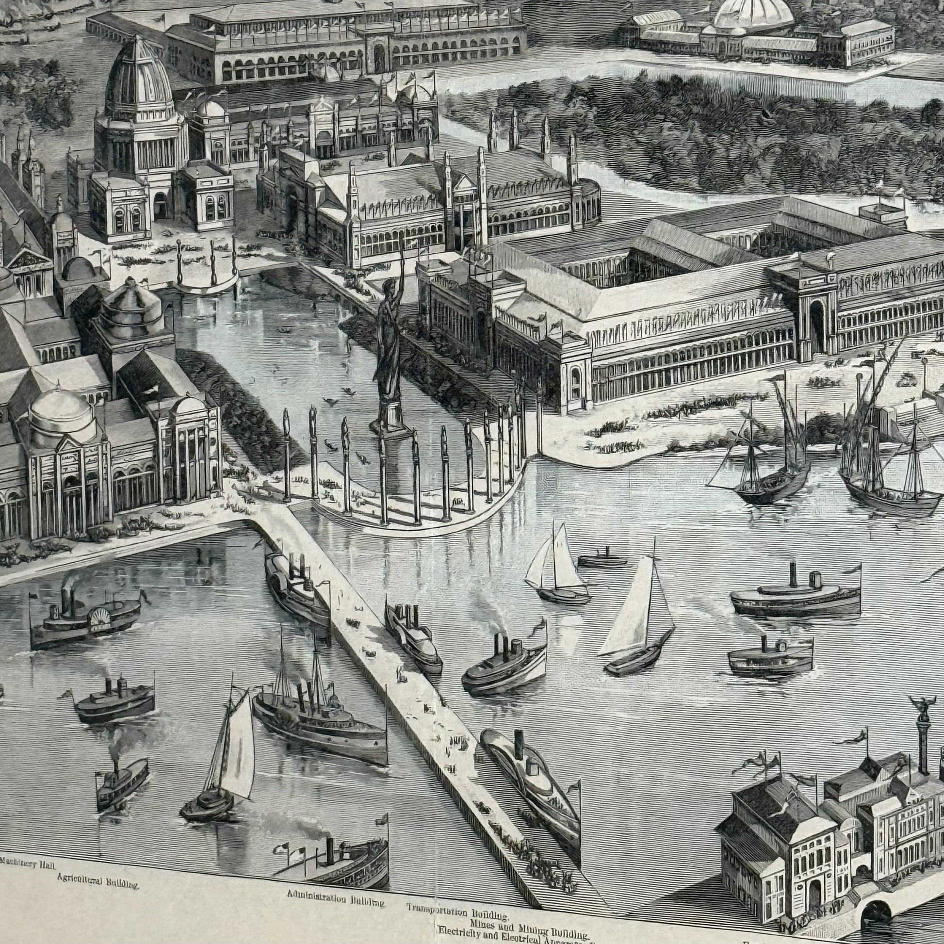 The engraving shows the fair’s most famous structures, including the Ferris Wheel (a groundbreaking engineering marvel of the time), the White City (a collection of neoclassical buildings that became the fair’s architectural hallmark), and pavilions representing countries, states, and industries.