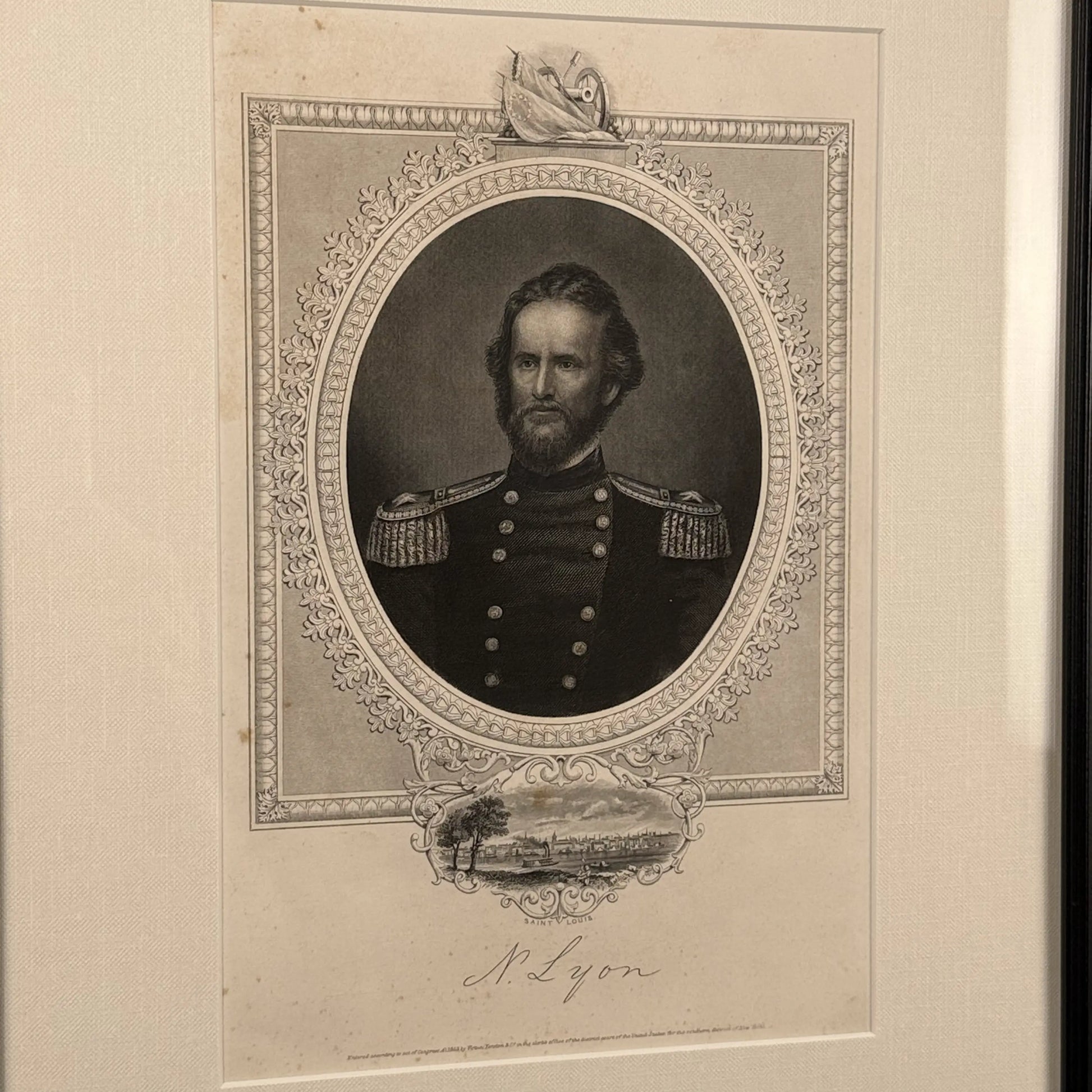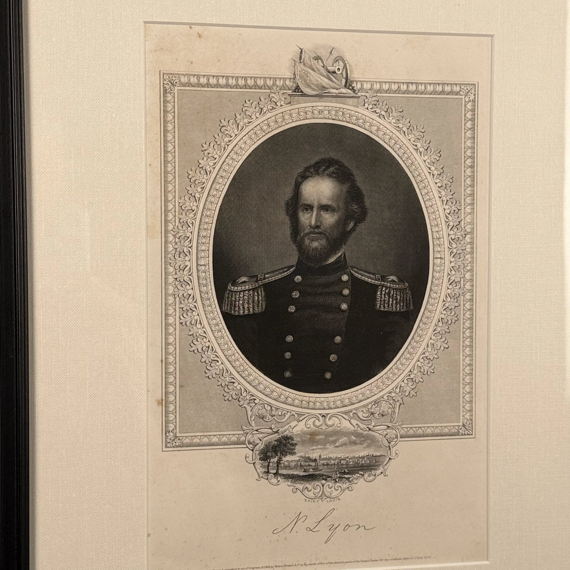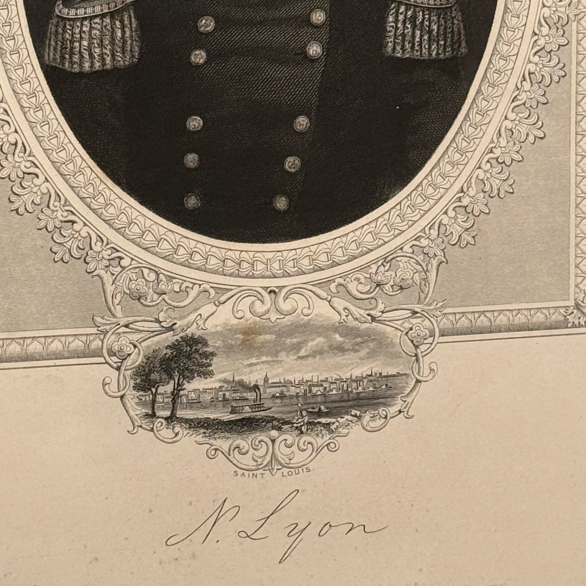 A finely detailed steel engraving of Union General Nathaniel Lyon, the first Union General killed in the Civil War, shown with a vignette of St. Louis.