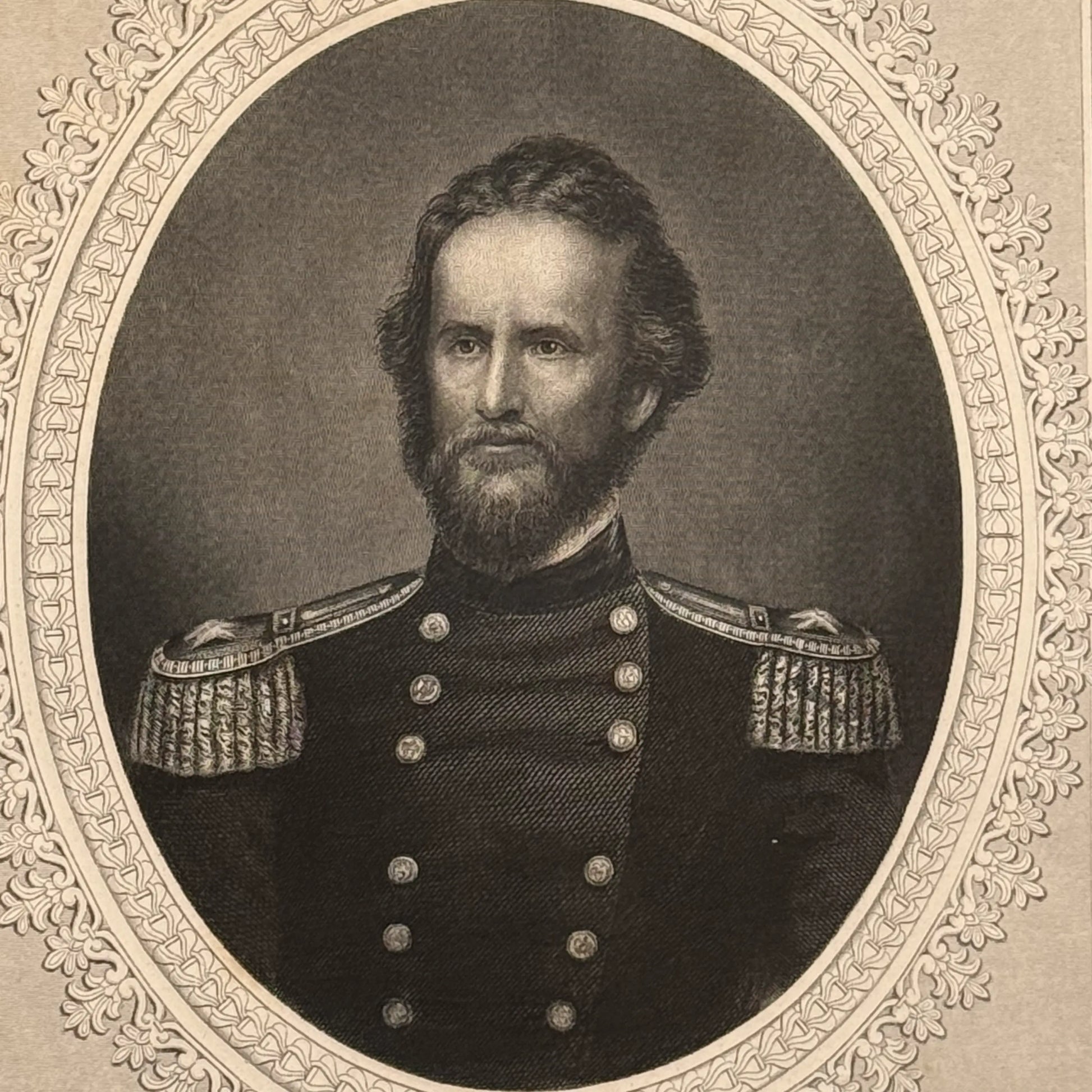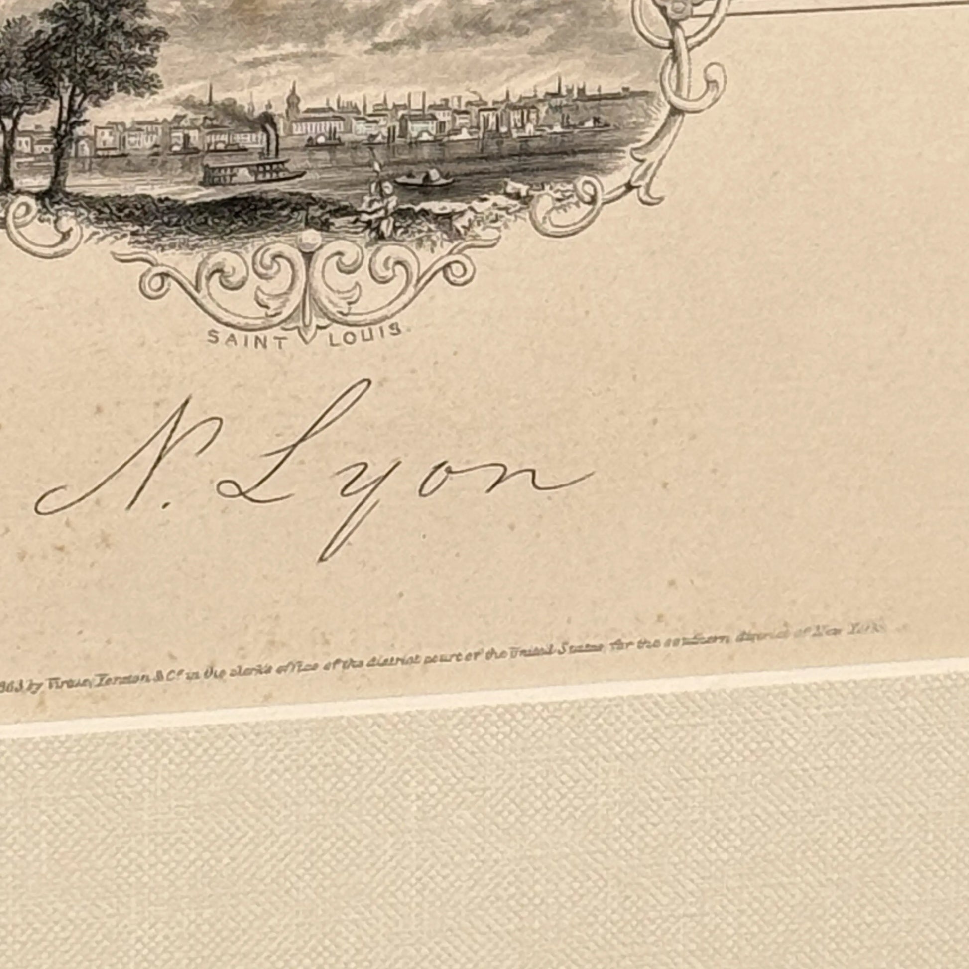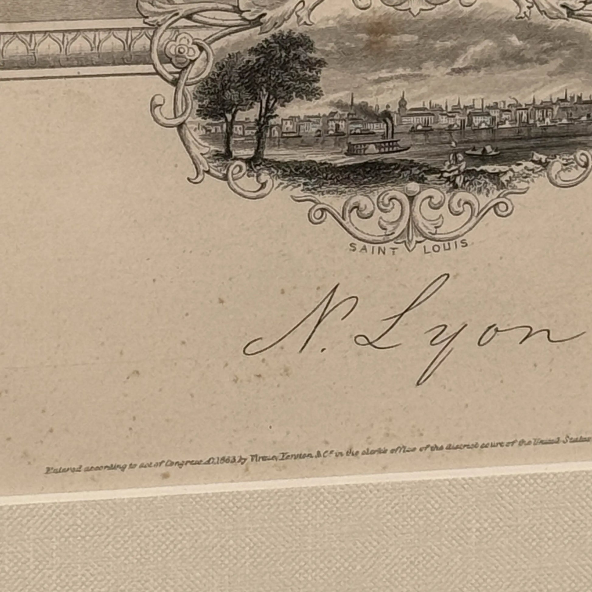 A finely detailed steel engraving of Union General Nathaniel Lyon, the first Union General killed in the Civil War, shown with a vignette of St. Louis.