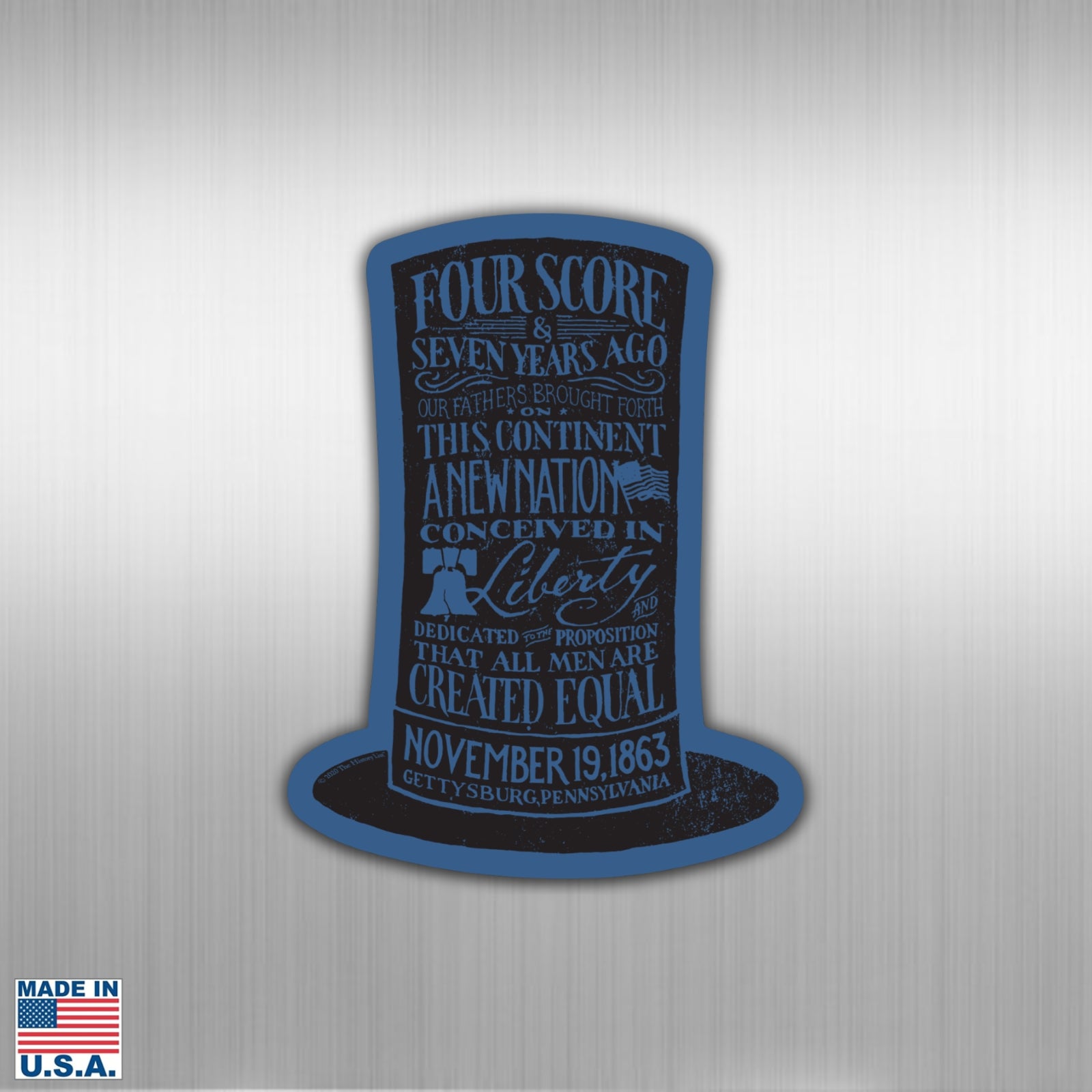 The magnet: Printed in the US on a thin, flexible magnet. Die cut. Our exclusive design, the Gettysburg Address depicted on Lincoln's signature stovepipe hat.