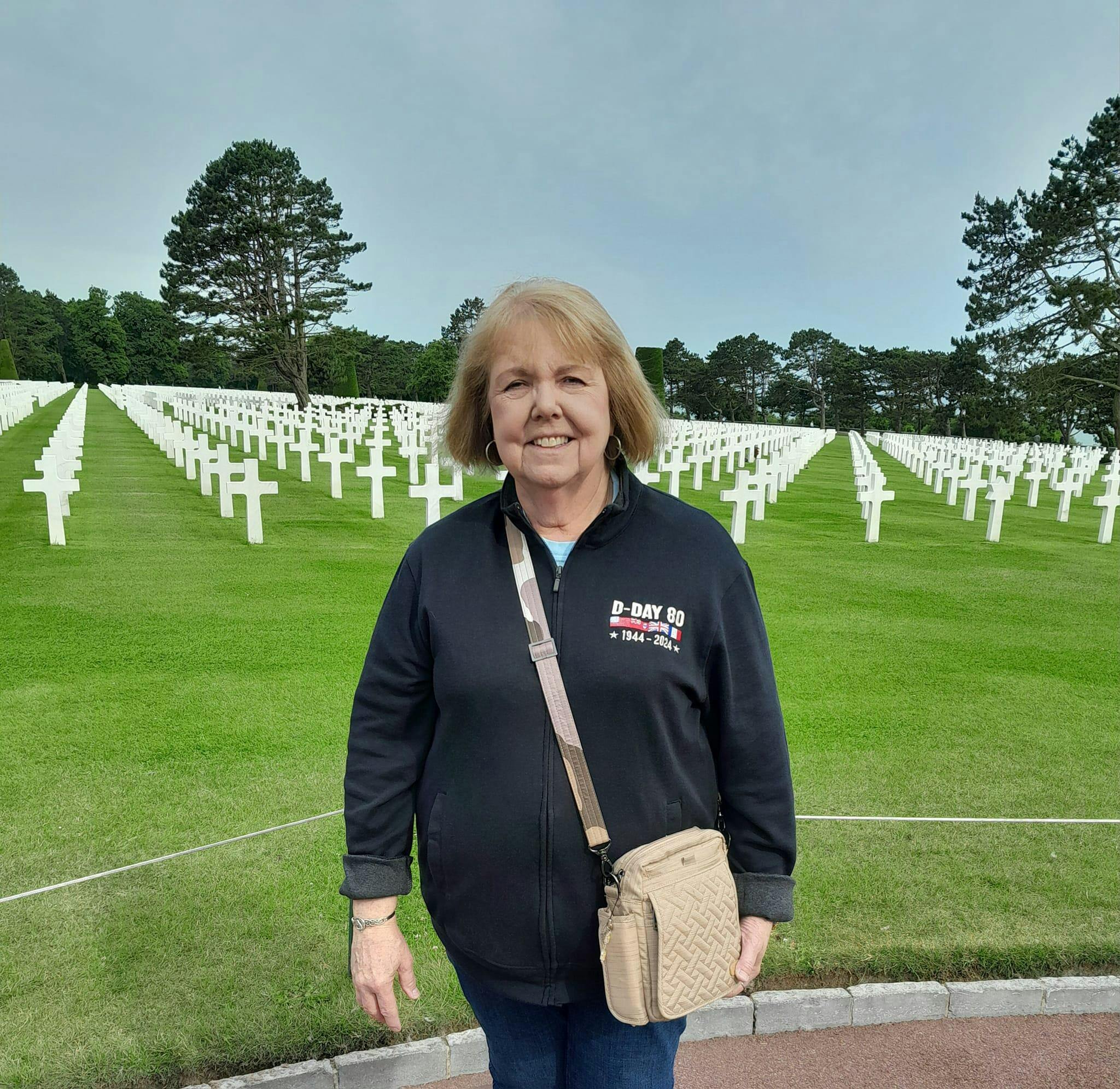 Embroidered over the left chest, "D-Day 80," the flags of the major allied nations involved in the landing, and the years 1944 - 2024. (There is nothing on the back.)