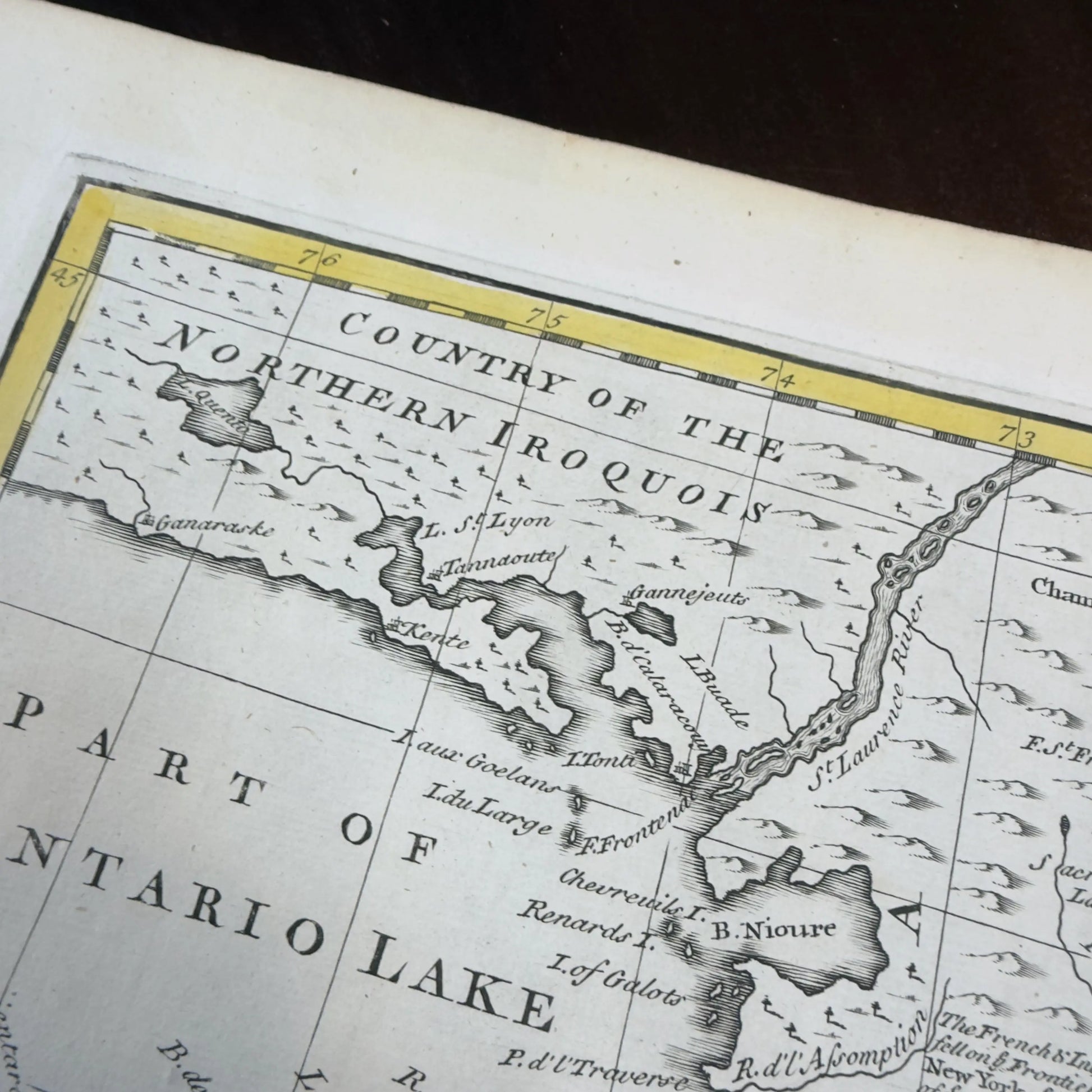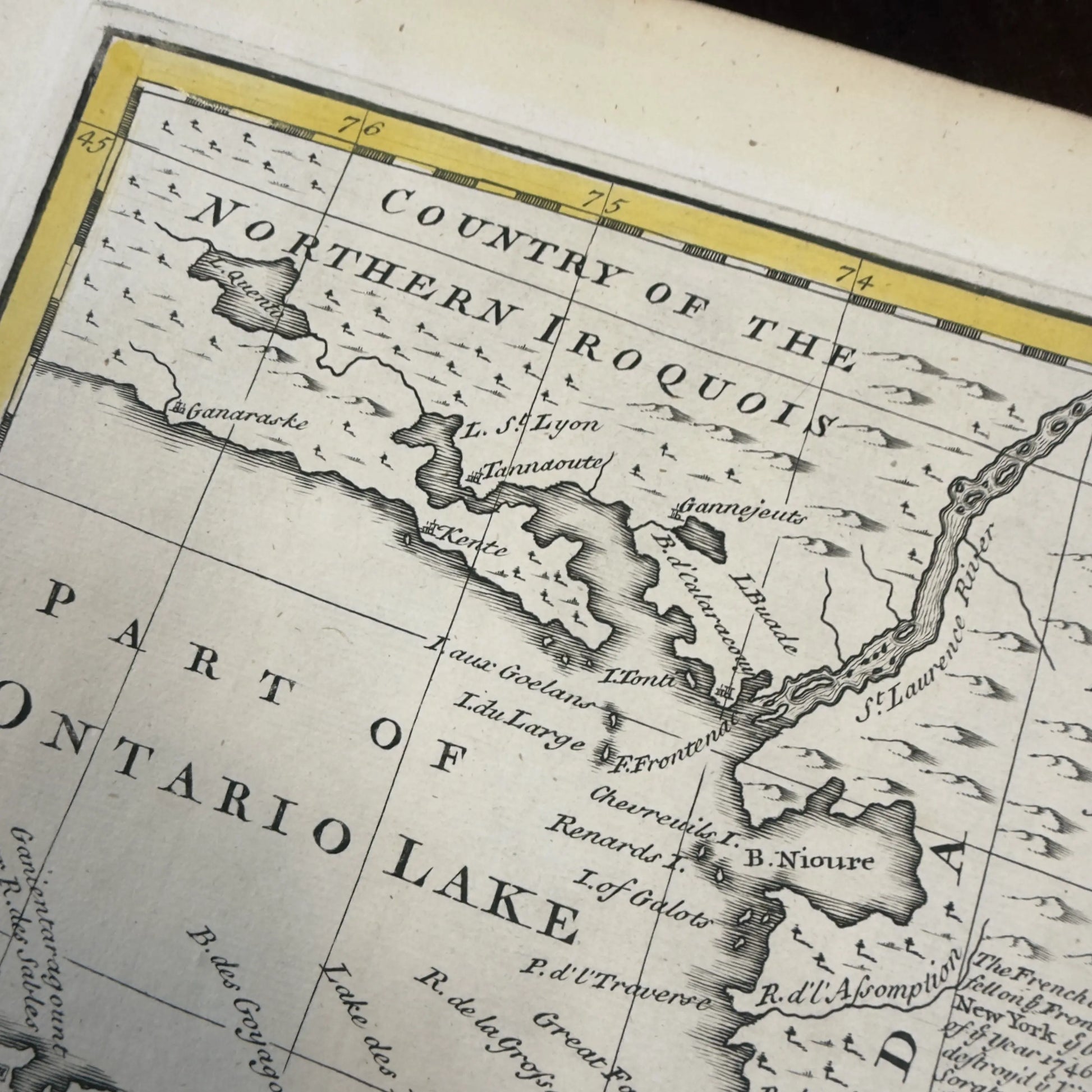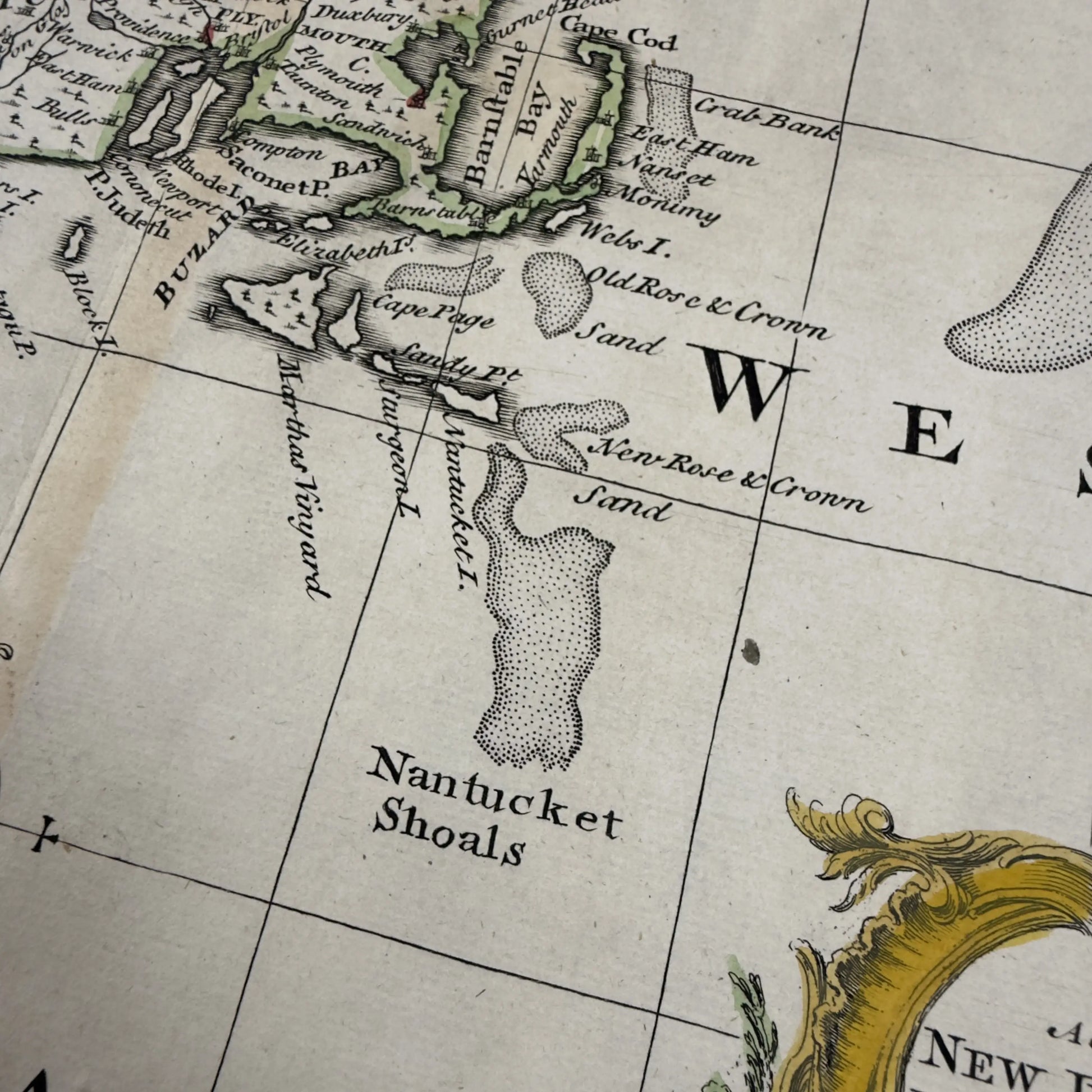 Drawn from surveys and “regulated by astronomical observations,” the map captures the coastline with notable accuracy—detailing islands, shoals, banks, and major harbors along New England’s shores. Inland, however, the geography becomes more speculative. An outsized Lake Ontario feeds an unusually rendered St. Lawrence River, and in Pennsylvania the early counties appear in evolving form: Bucks and Philadelphia are named, while Chester is labeled “Derby County.”