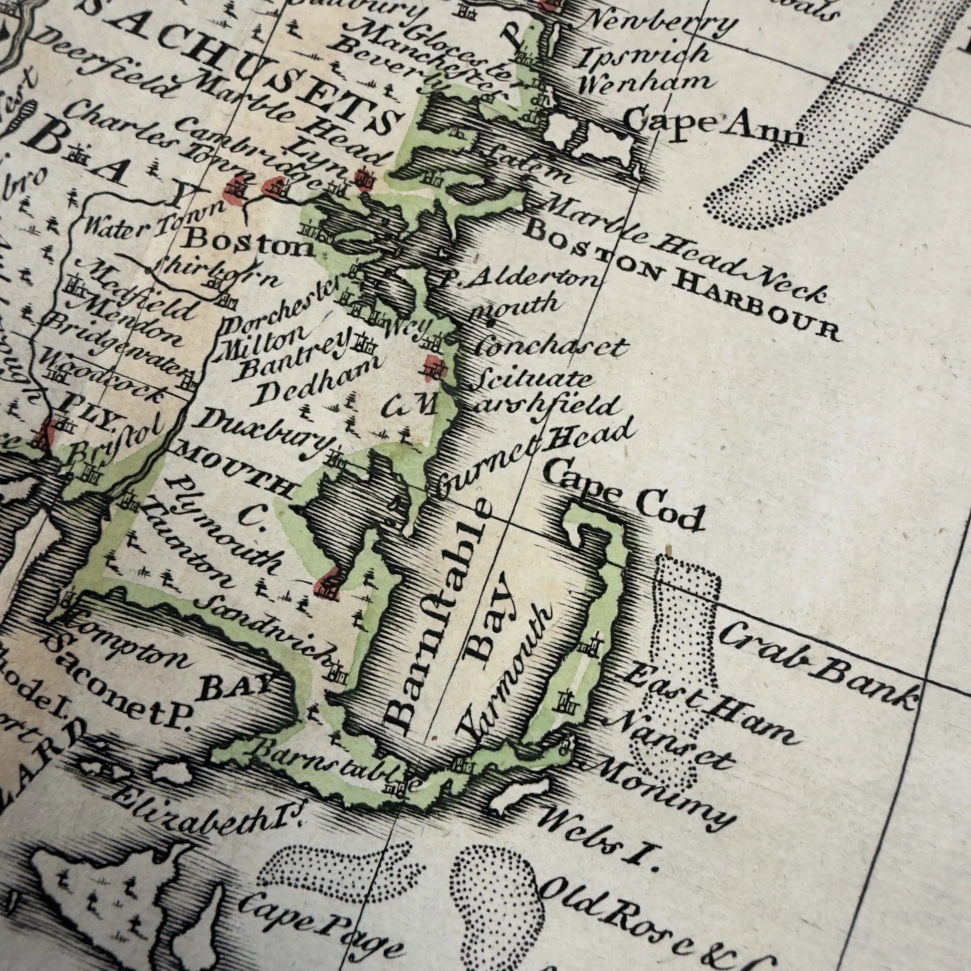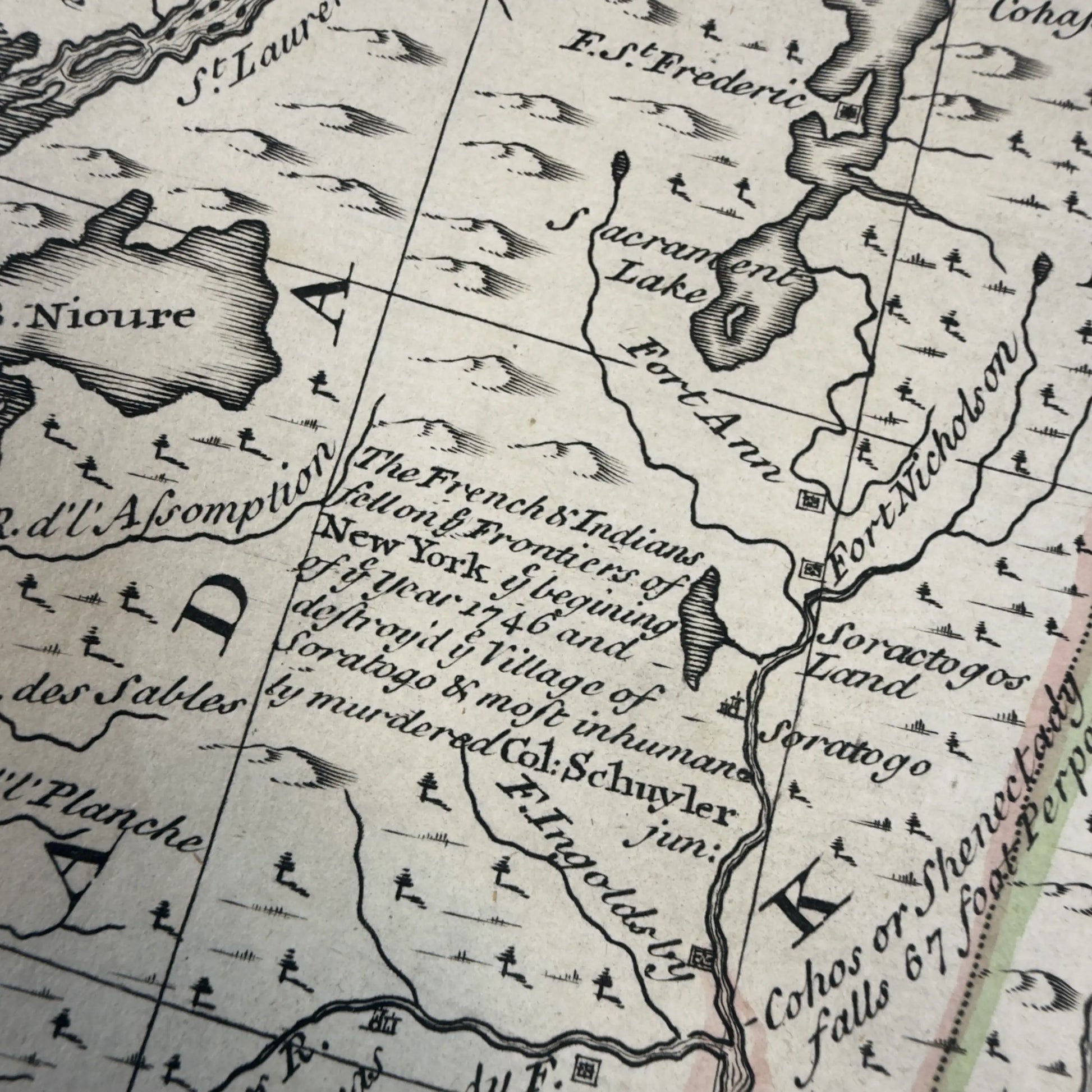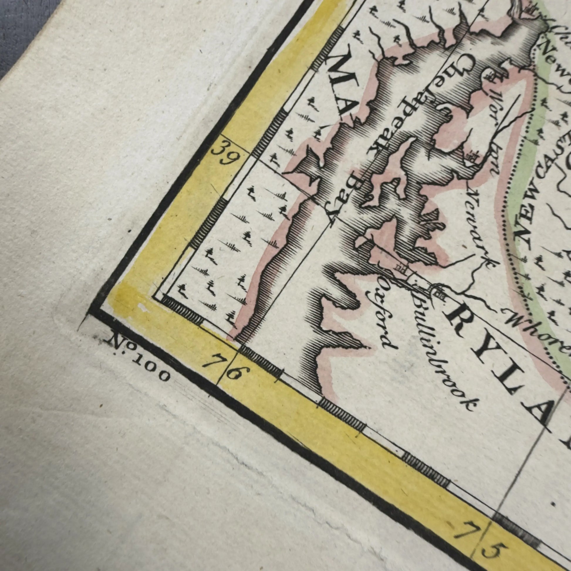 Drawn from surveys and “regulated by astronomical observations,” the map captures the coastline with notable accuracy—detailing islands, shoals, banks, and major harbors along New England’s shores. Inland, however, the geography becomes more speculative. An outsized Lake Ontario feeds an unusually rendered St. Lawrence River, and in Pennsylvania the early counties appear in evolving form: Bucks and Philadelphia are named, while Chester is labeled “Derby County.”