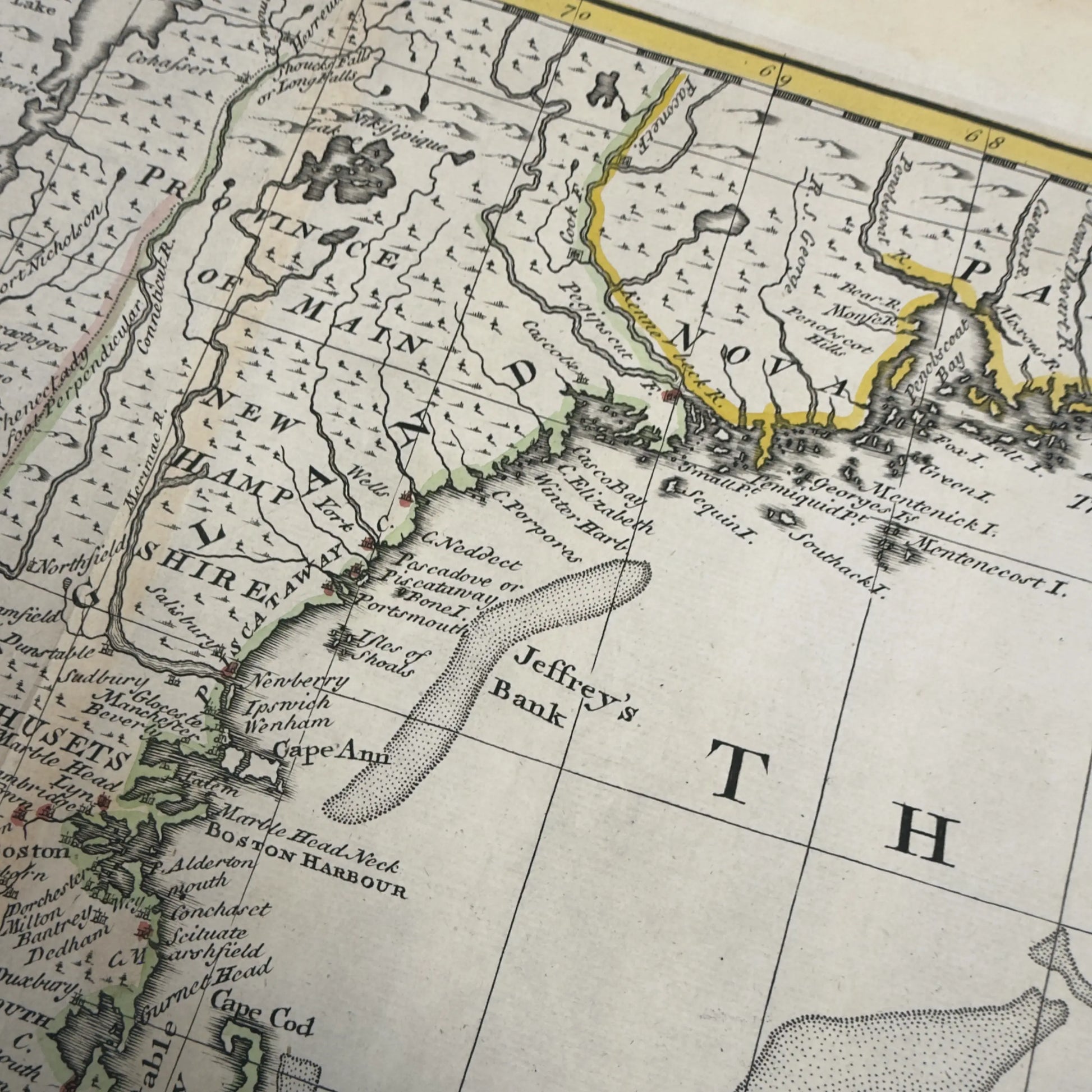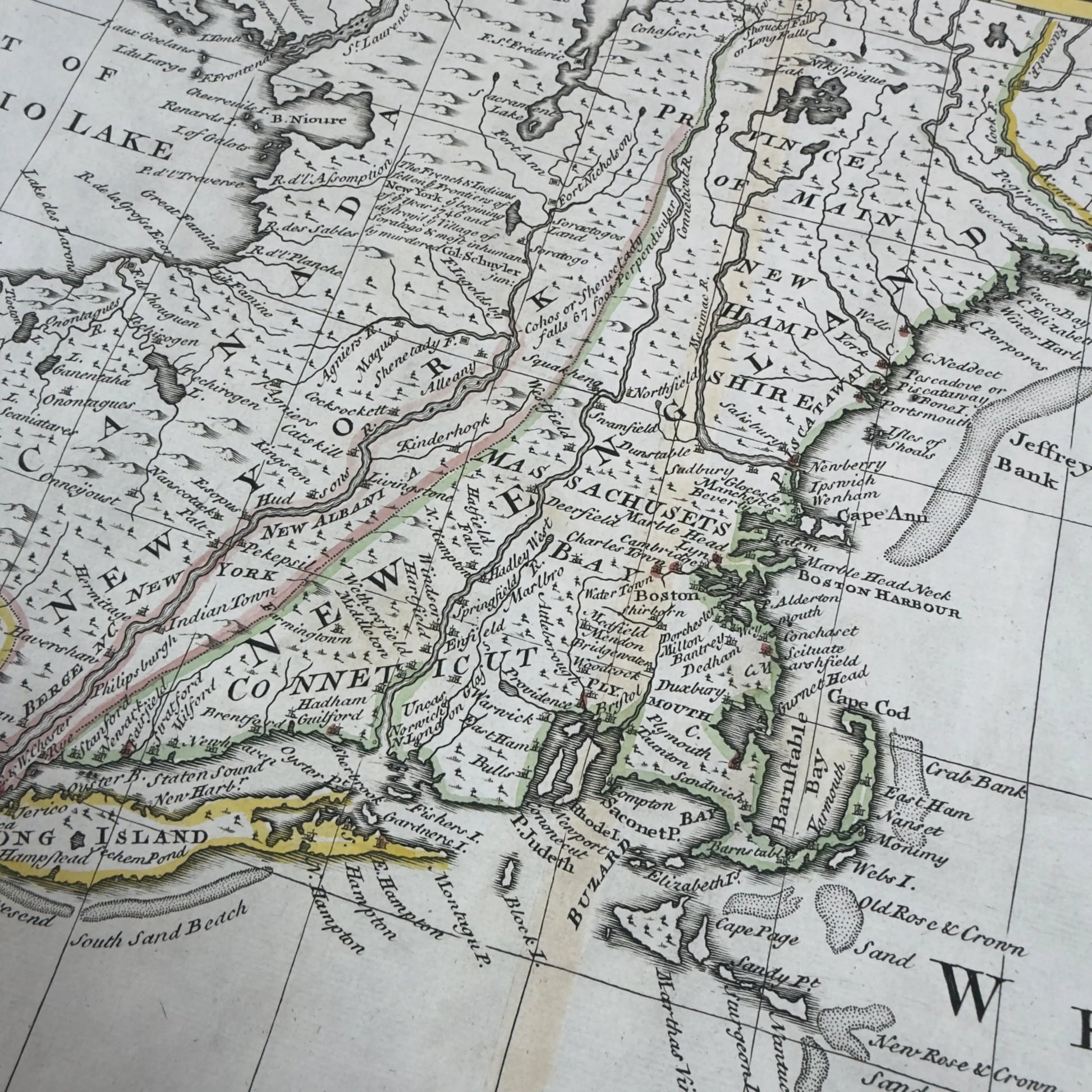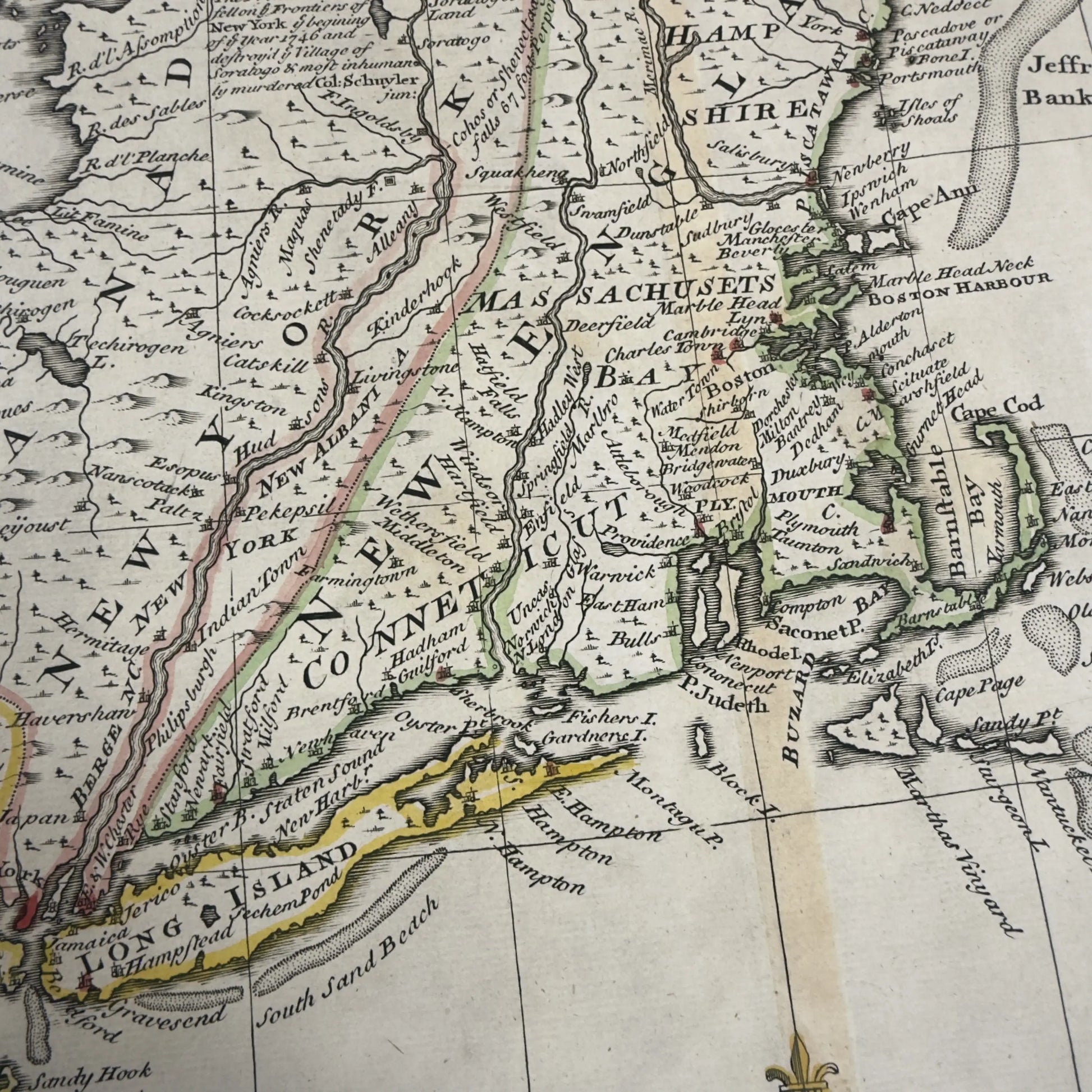 A handsome double-page engraved map of the American Northeast, issued in the mid-18th century as part of A Complete System of Geography. Covering the region from Chesapeake Bay to the Bay of Fundy, it reflects both the strengths and limitations of British cartography in the colonial period.