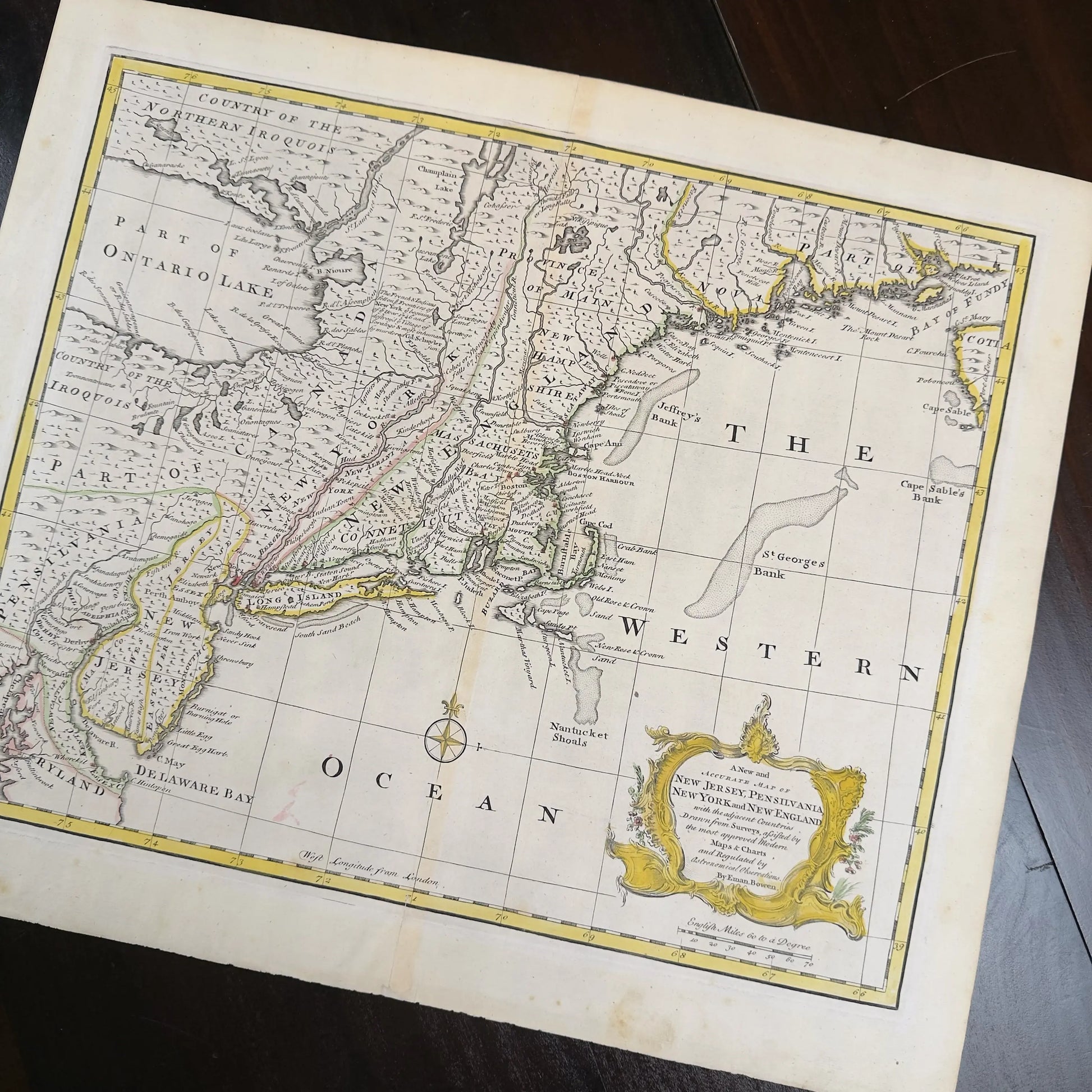 Title: A New and Accurate Map of New Jersey, Pensilvania, New York and New England With the Adjacent Countries. Drawn from surveys, assisted by the most approved modern maps & charts and regulated by astronomical observations.
