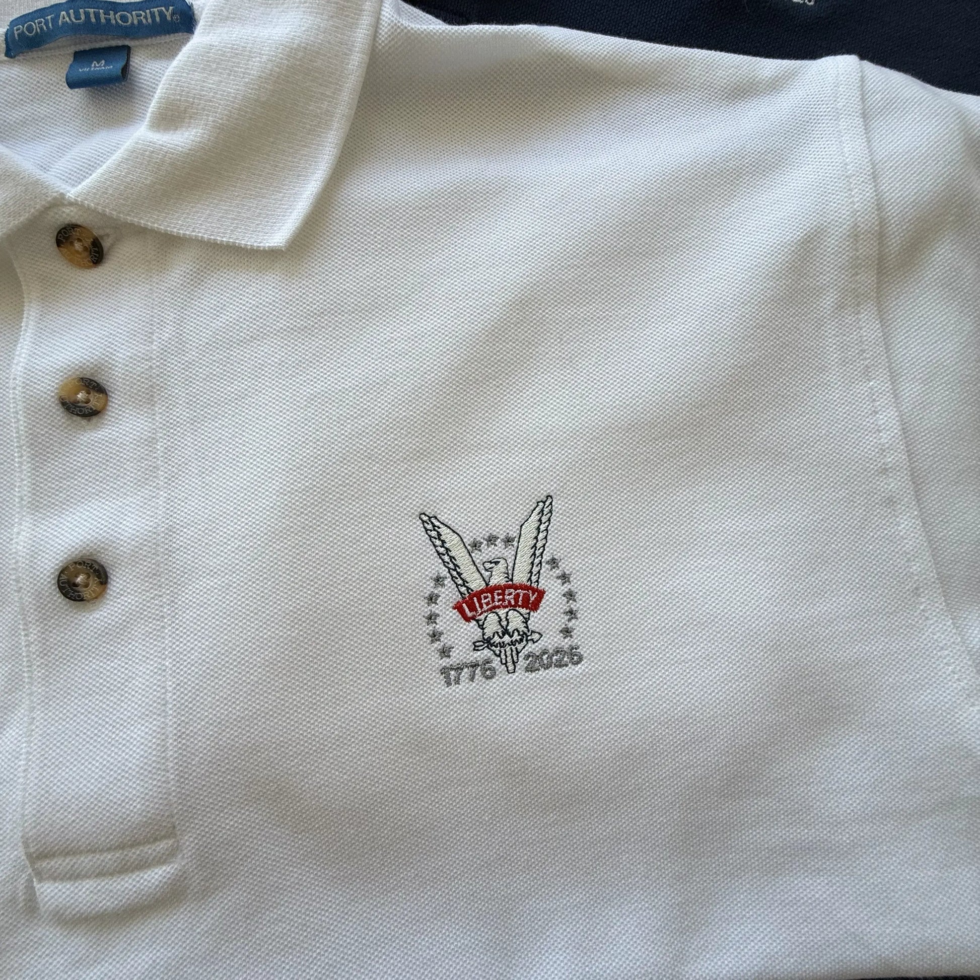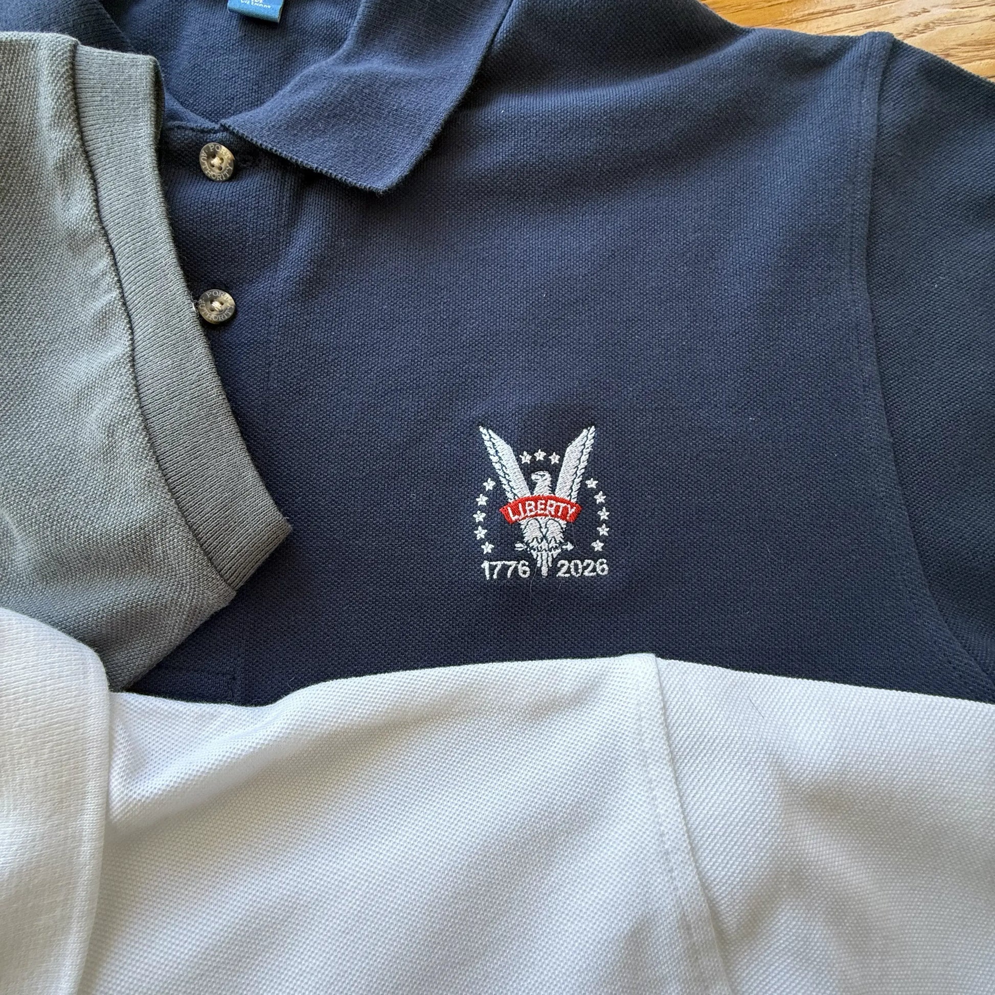 Embroidered on the left chest of this high-quality 100% cotton pique polo shirt, our original "Liberty" eagle design with "1776" and "2026" surrounded by thirteen stars.