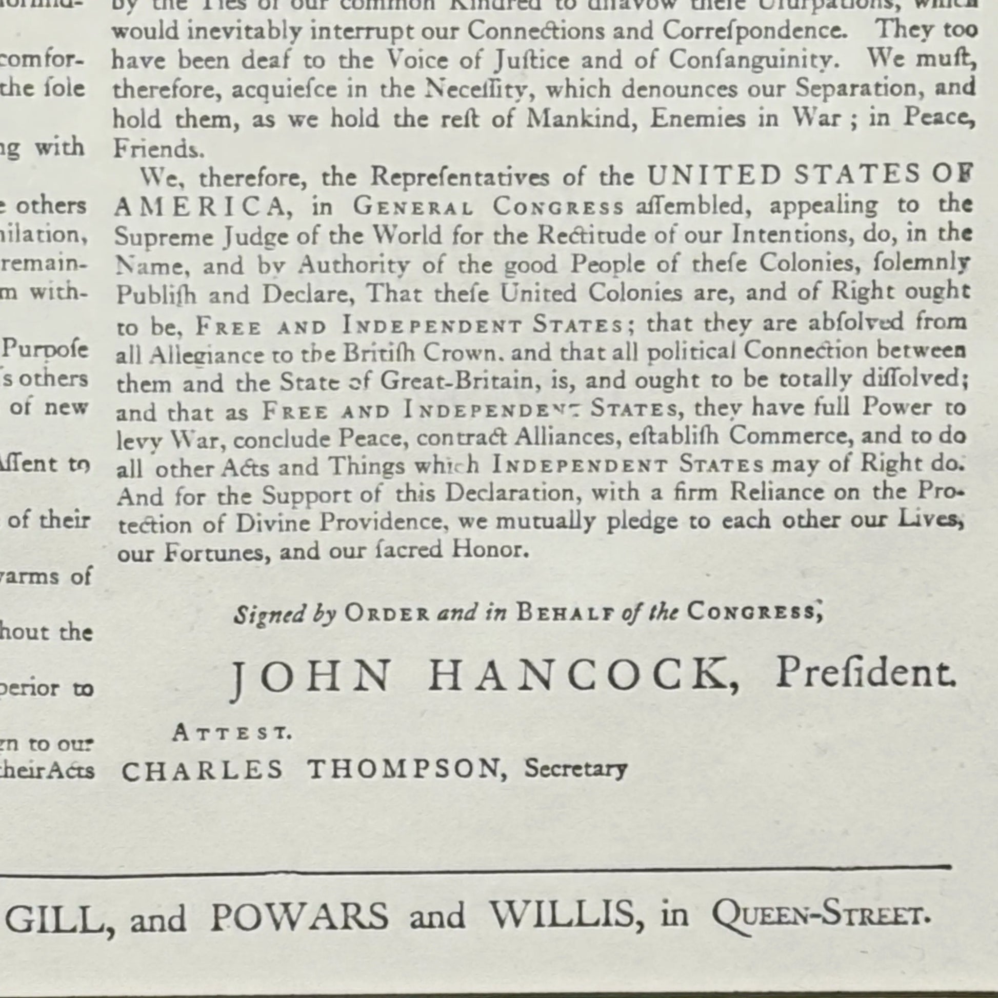 Just two editions of the Boston Printing of the Declaration broadside were published by Gill and then it disappeared from history. Only three copies from this John Gill edition have survived. In June 2009 Christie's auctioned a rare Boston imprint of the Declaration.