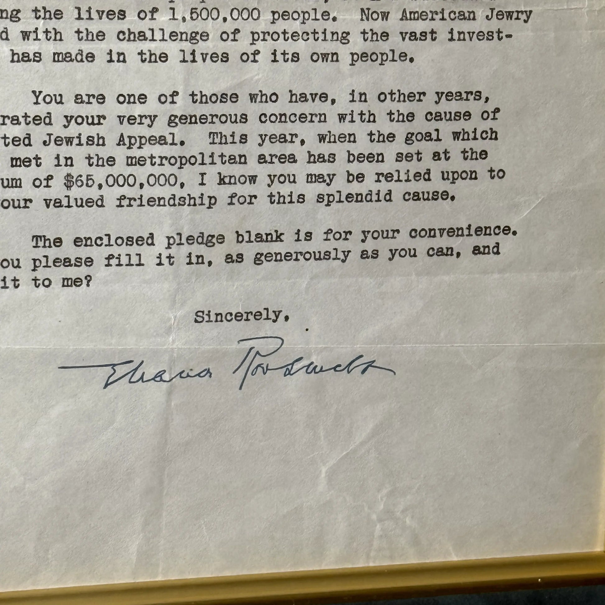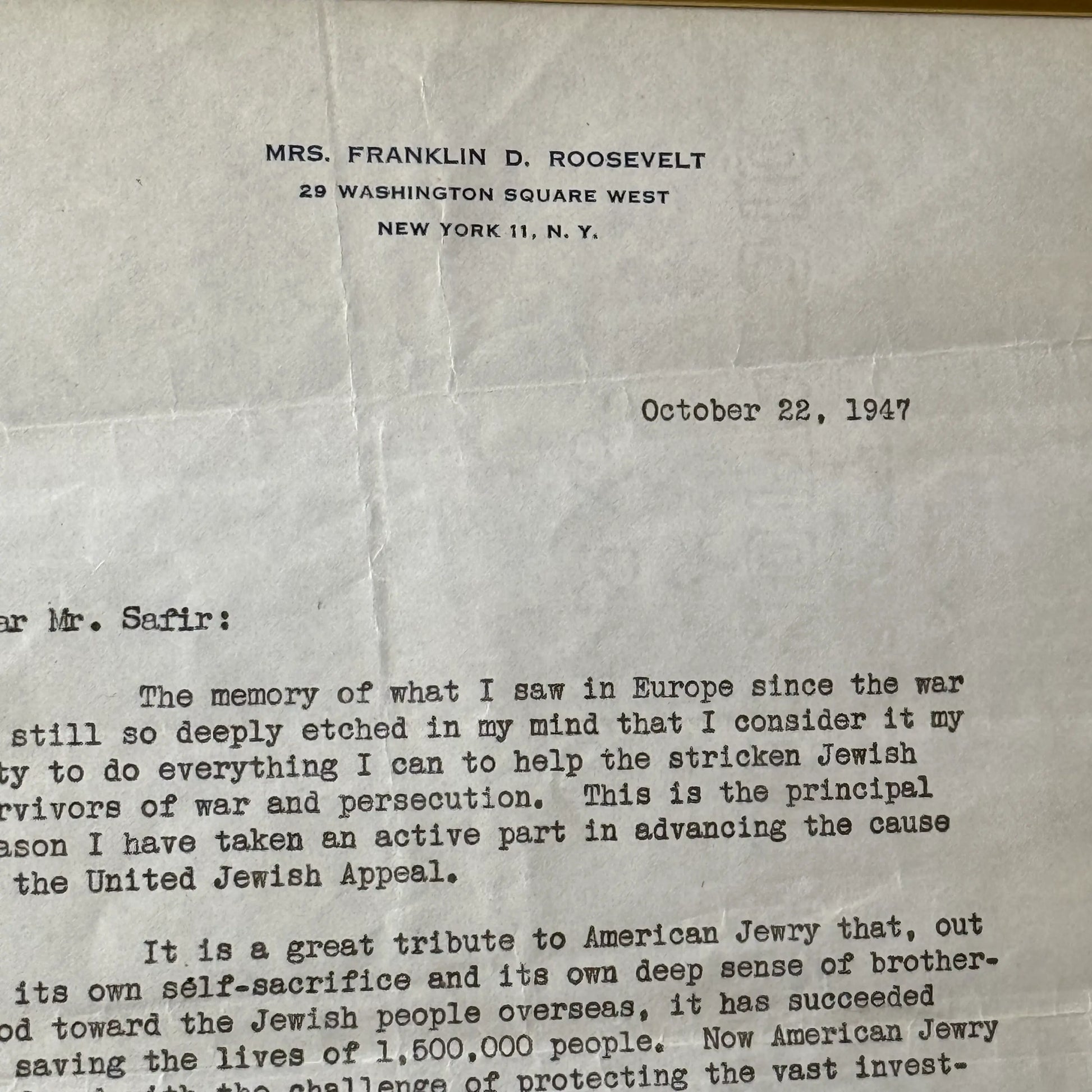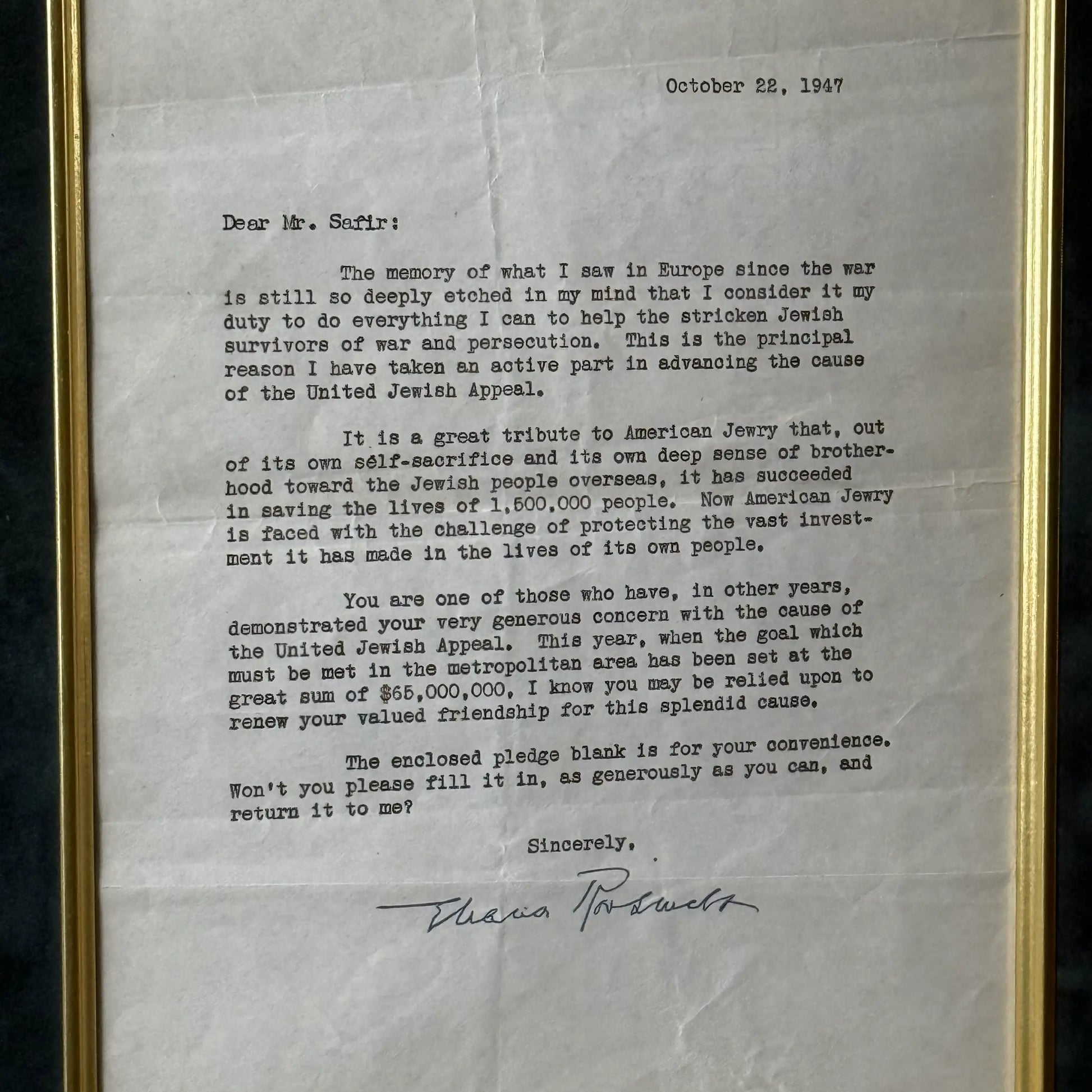 Framed Eleanor Roosevelt signed letter to aid American Jewish fundraising after WWII