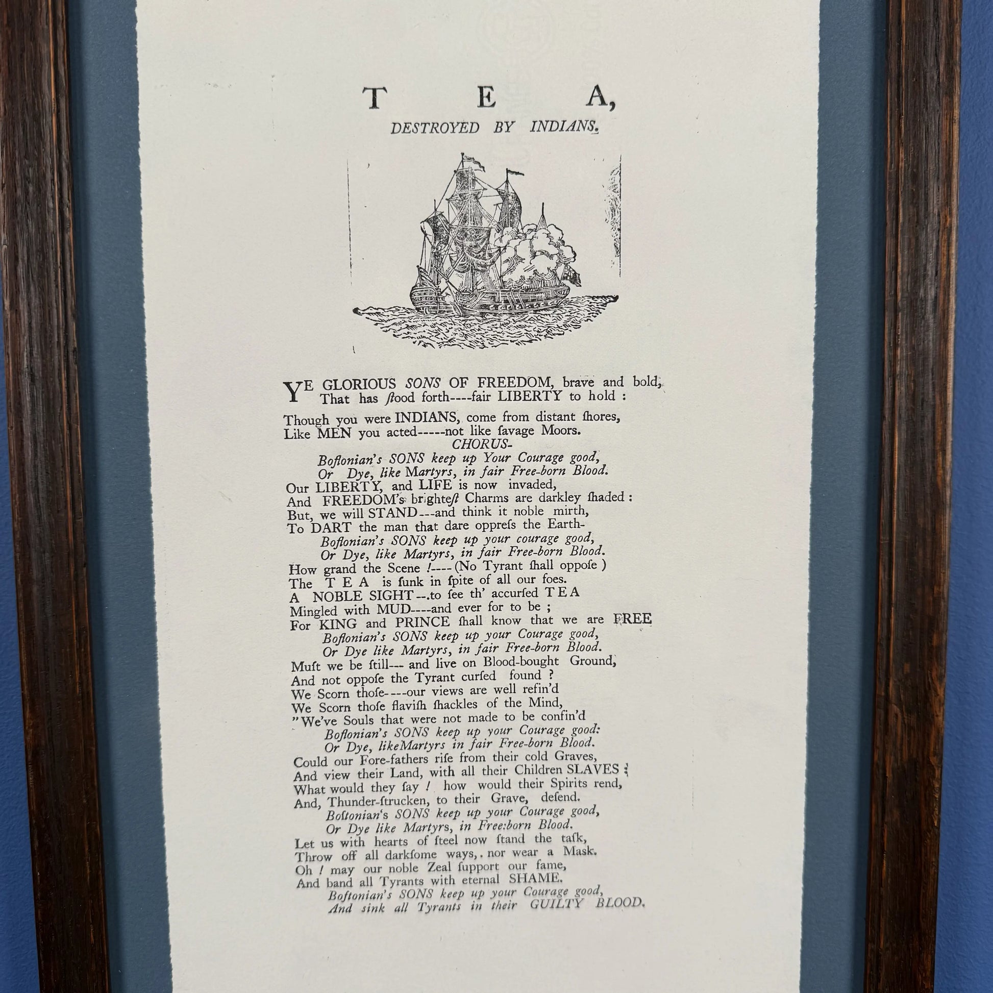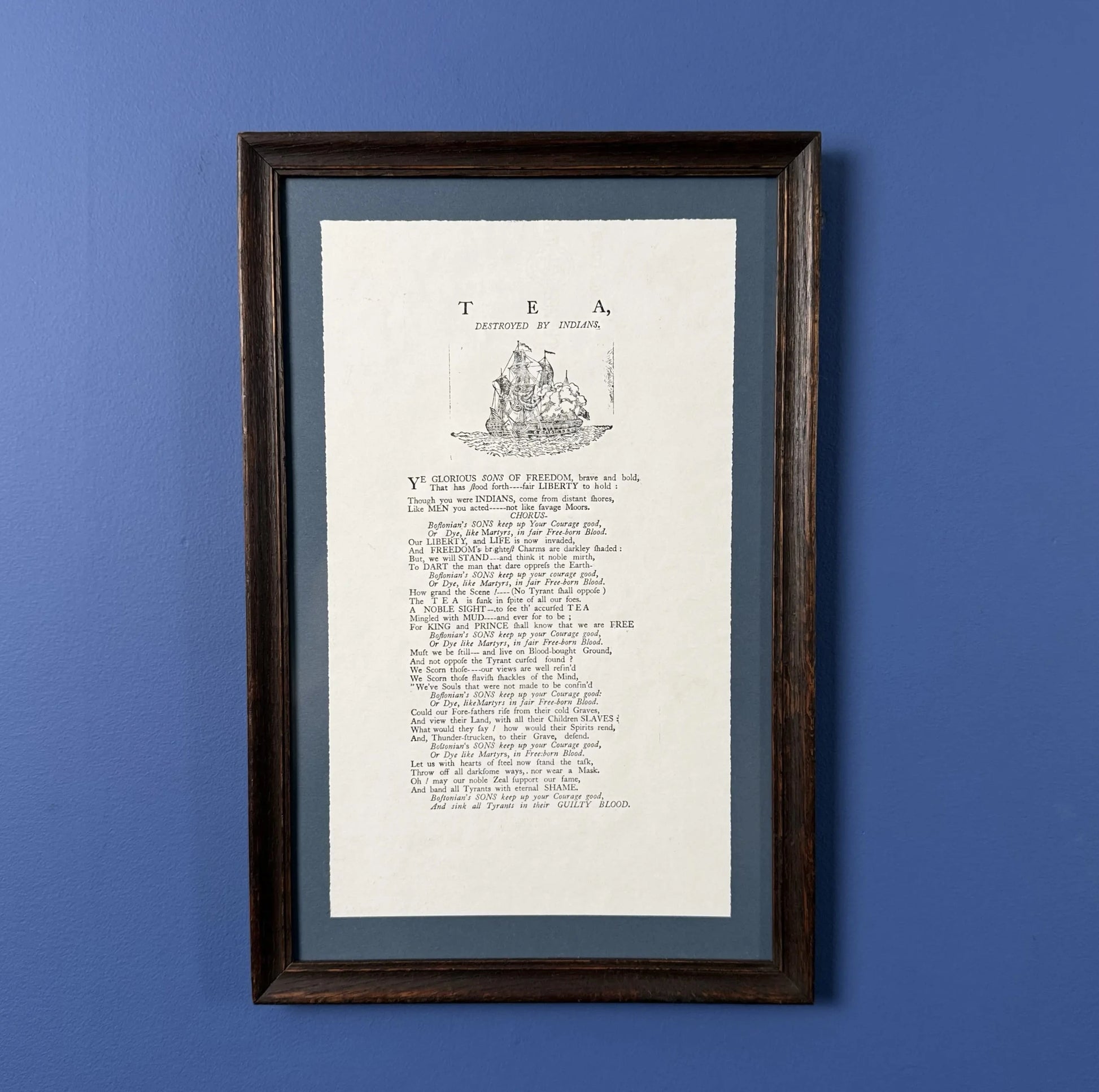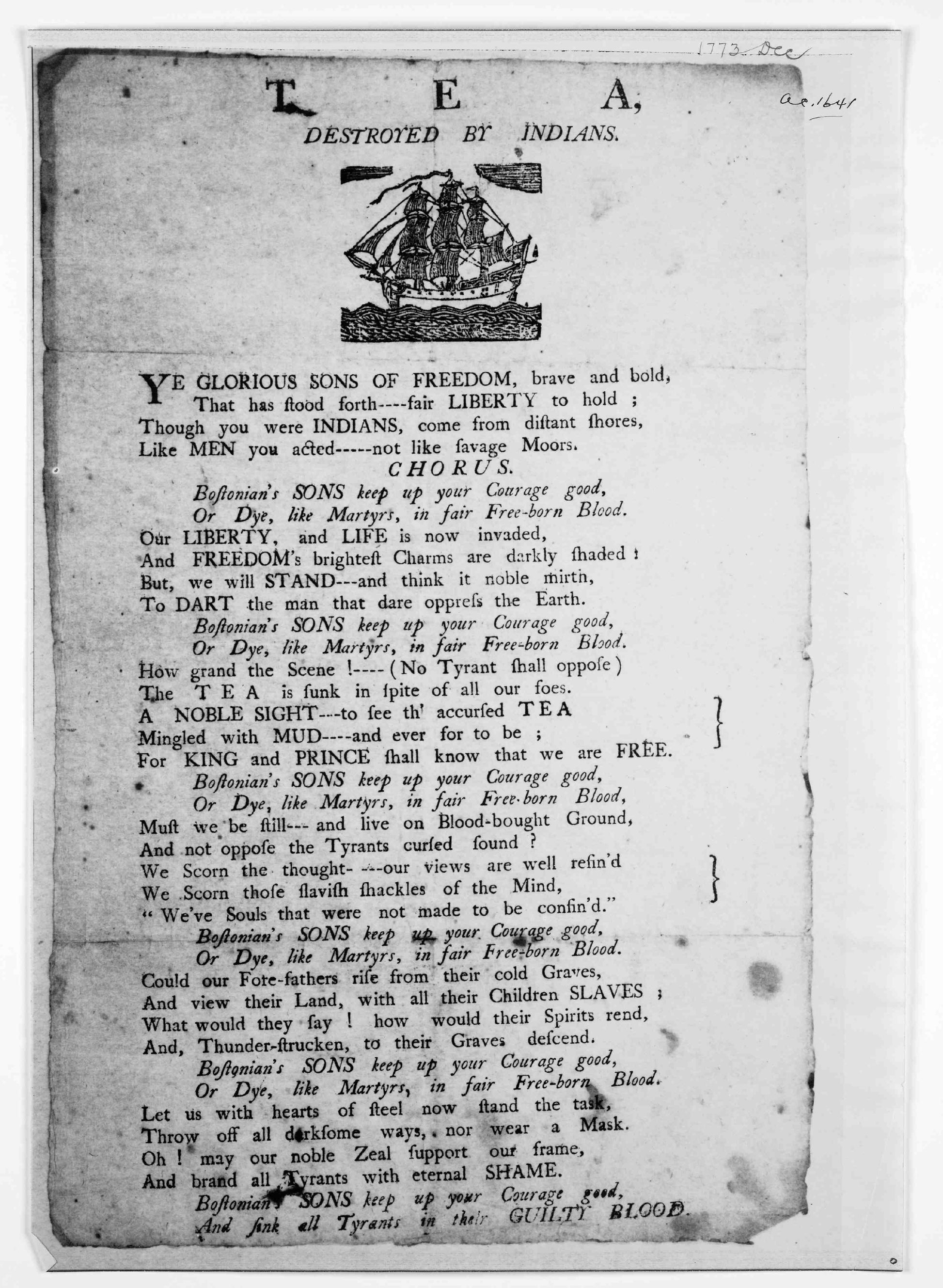 This is a reproduction of a 1773 broadside contains a poem praising the patriots who stormed the British tea ships during the Boston Tea Party.