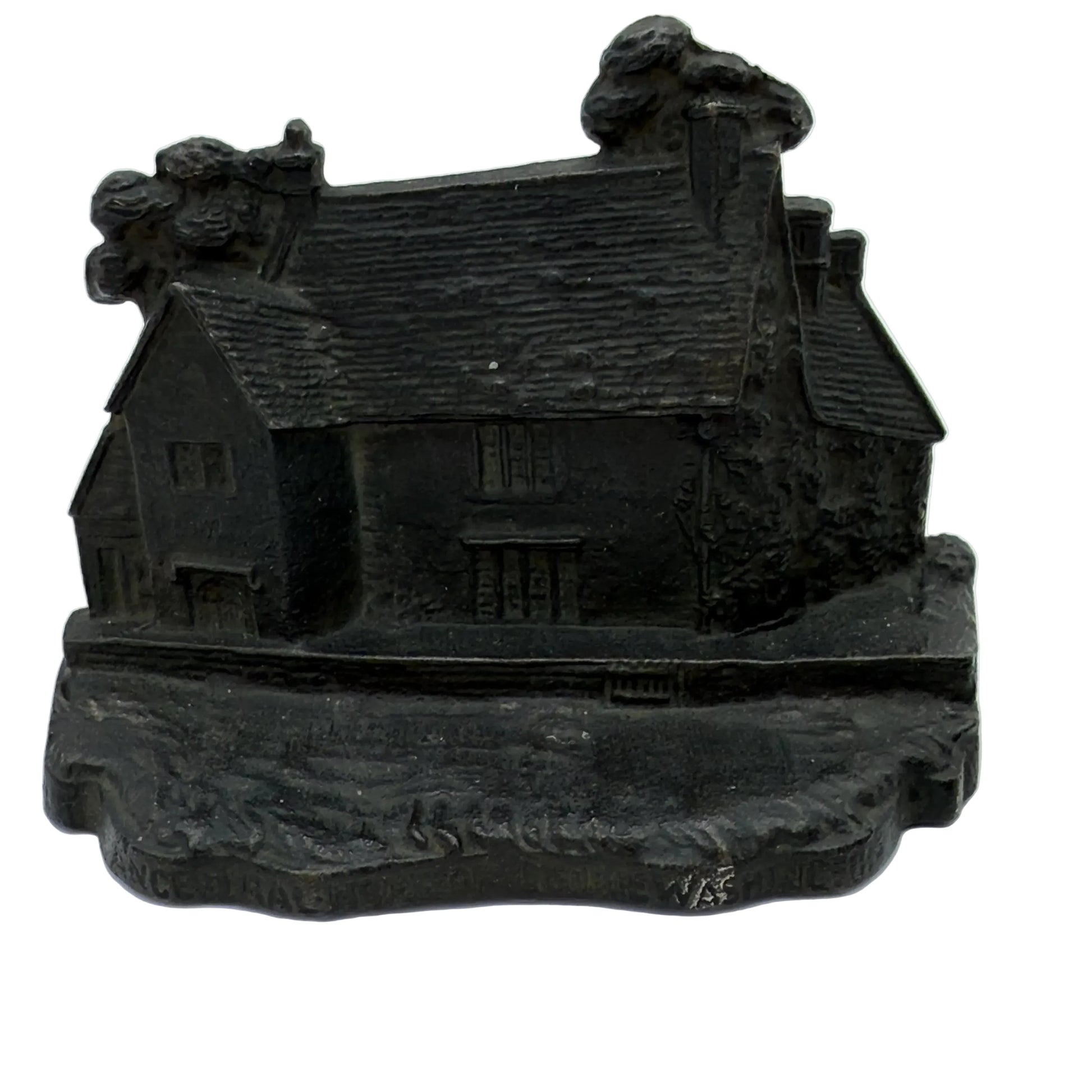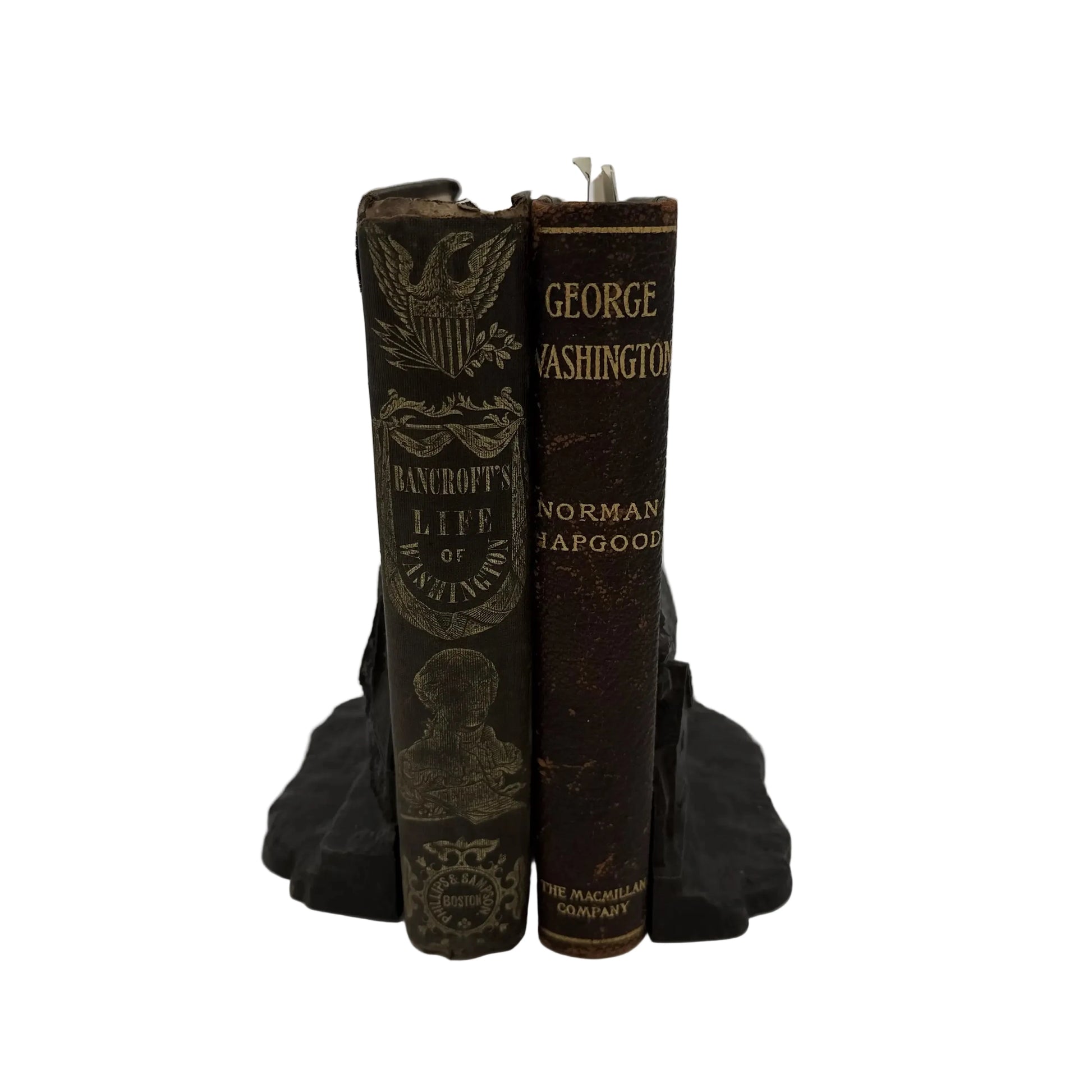A striking pair of antique cast iron bookends featuring the ancestral home of George Washington, Sulgrave Manor, located in Northamptonshire, England