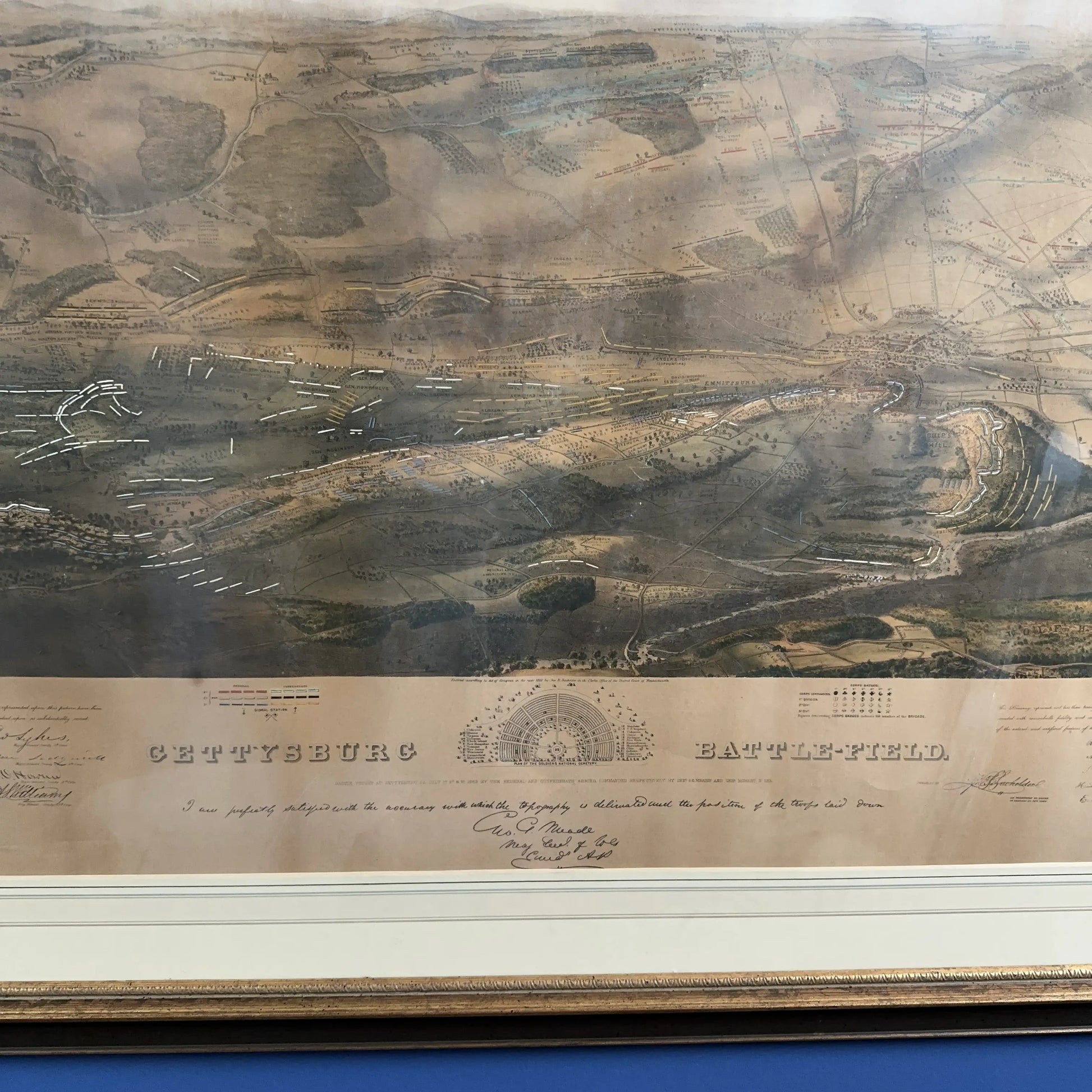 Along the bottom border, this statement: “I am perfectly satisfied with the accuracy with which the topography is delineated and the position of the troops laid down. Geo. G. Meade, Major Gen. of the Grand A.P.”