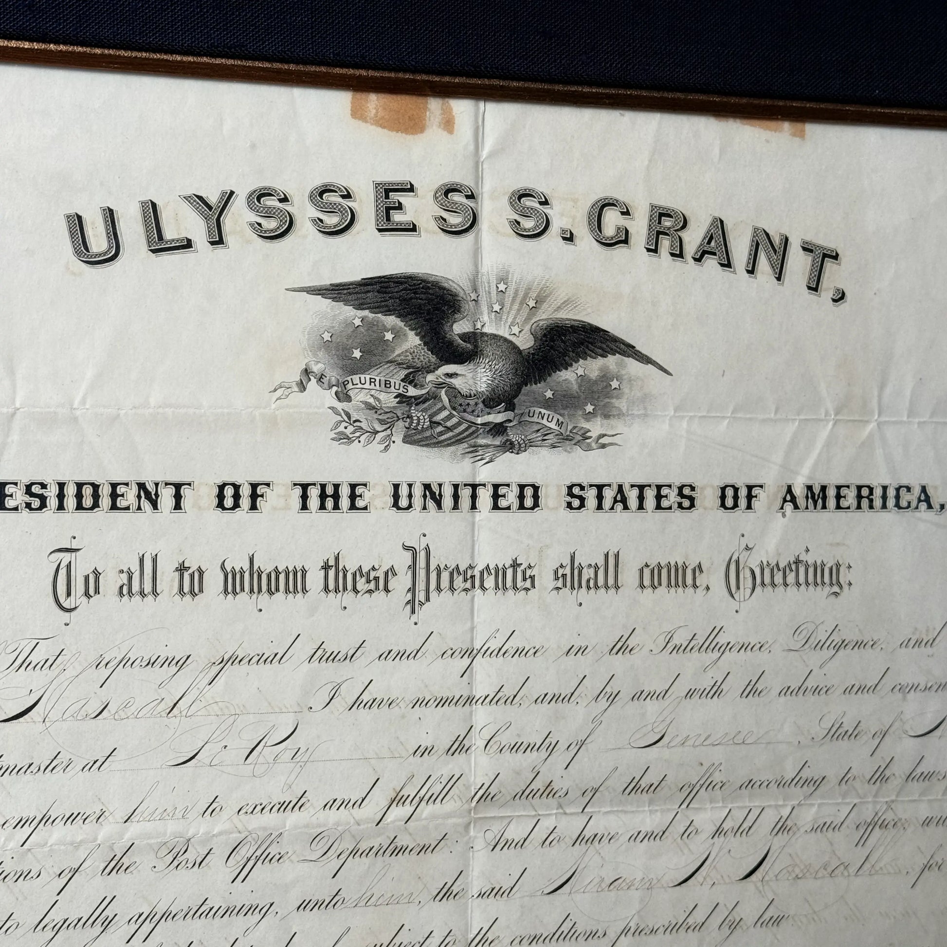 Original postmaster appointment signed by Ulysses S. Grant as President on March 11, 1875, countersigned by Postmaster General Marshall Jewell.
