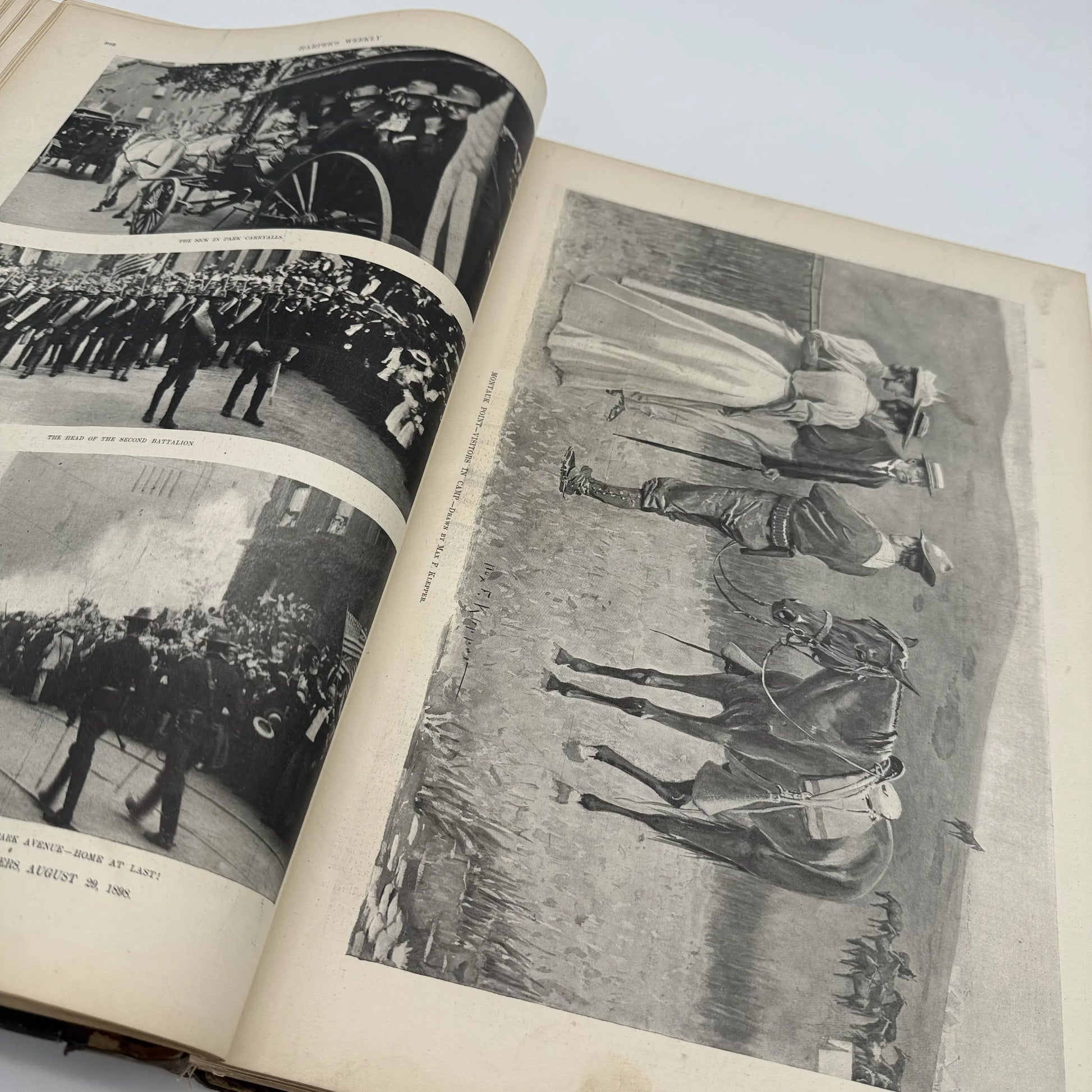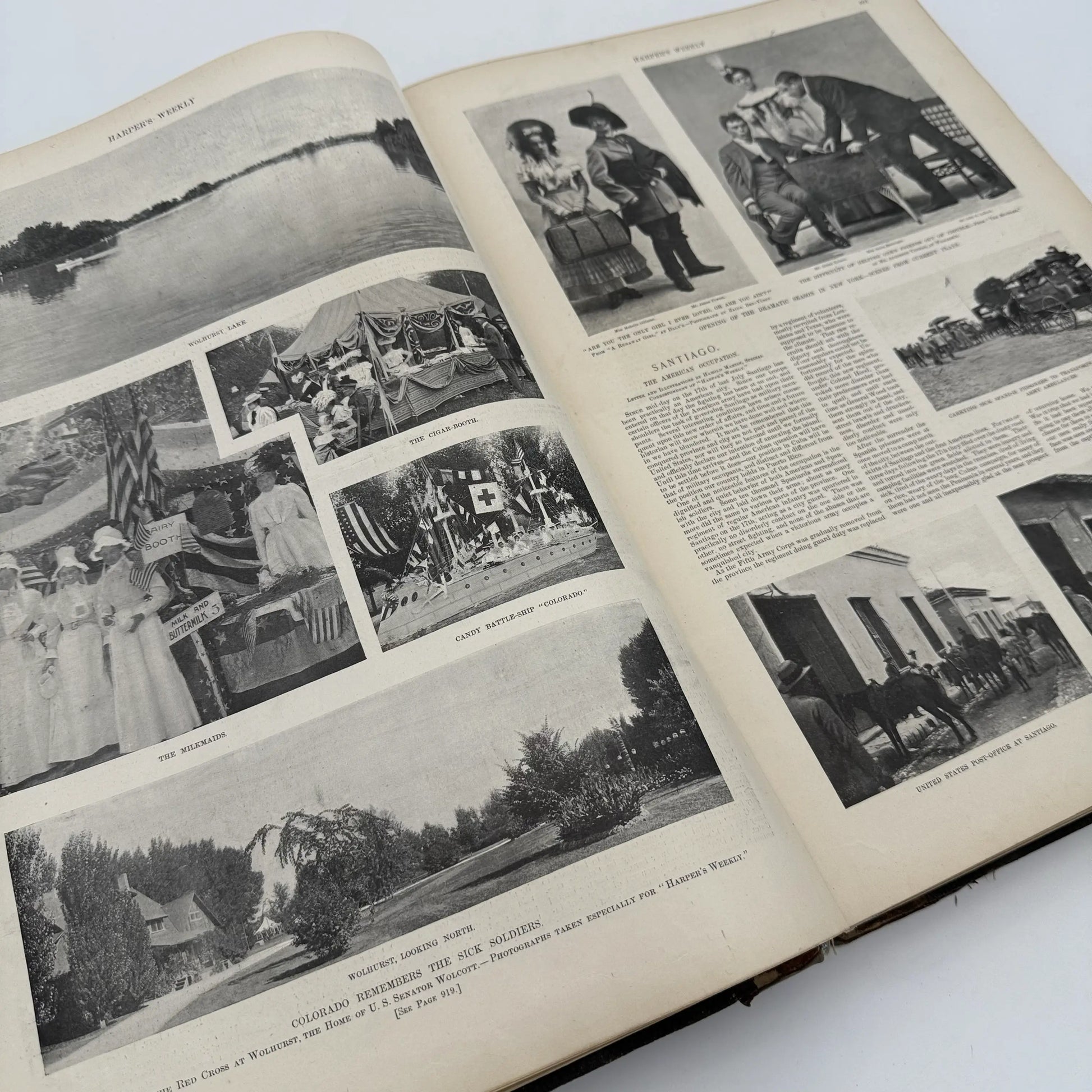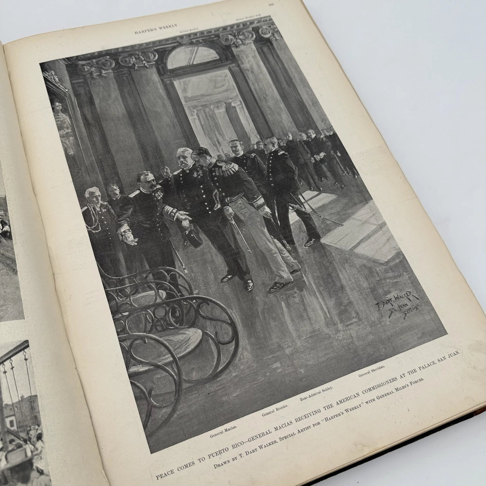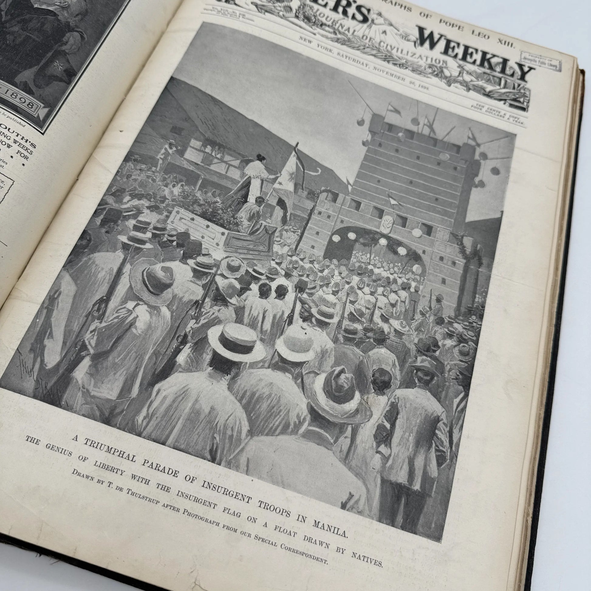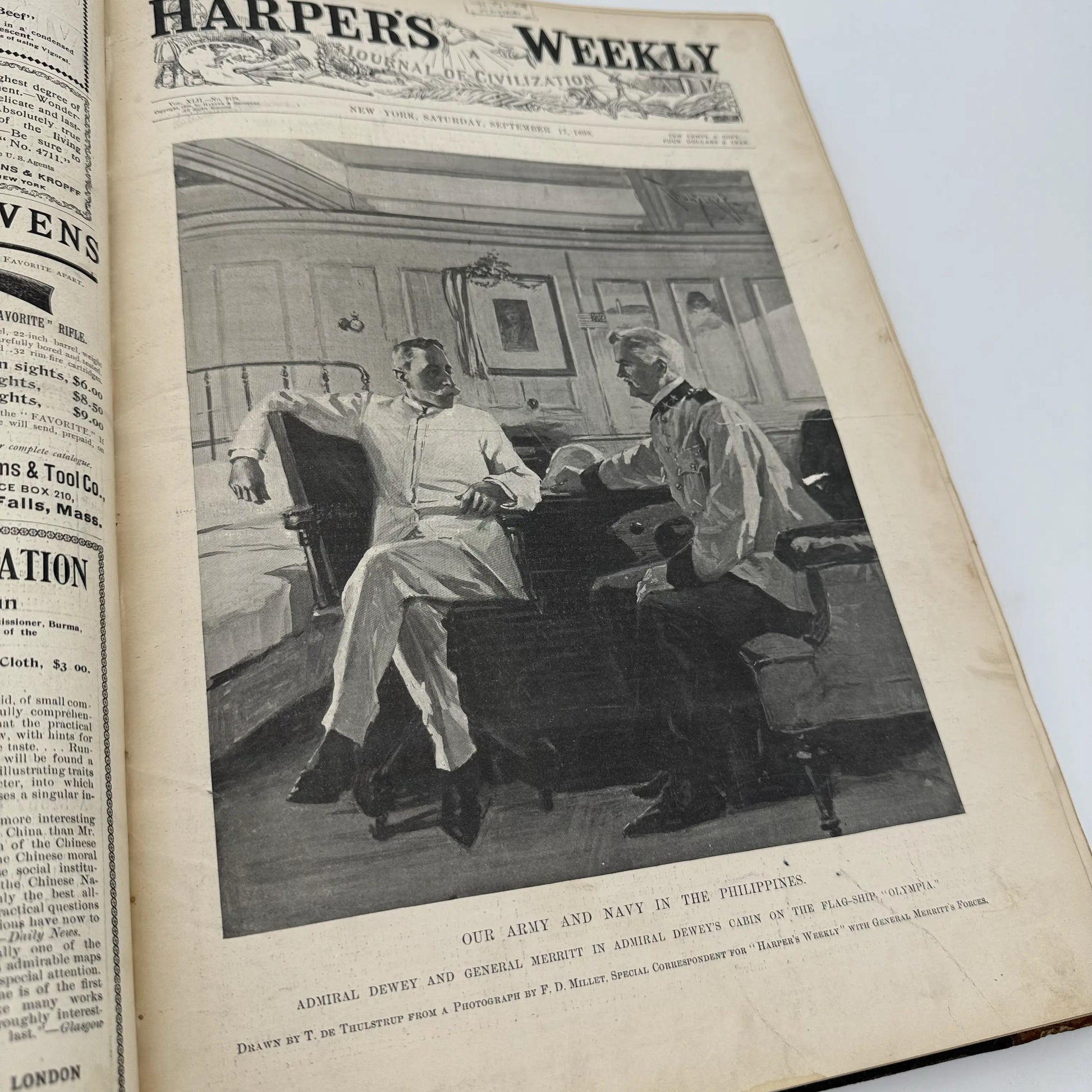This 1898 first edition of Harpers Weekly includes all of the issues of the magazine from September through December in a large bound volume.