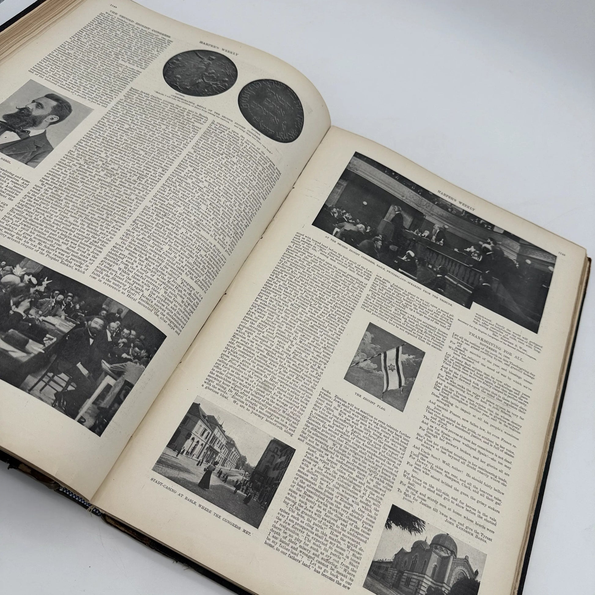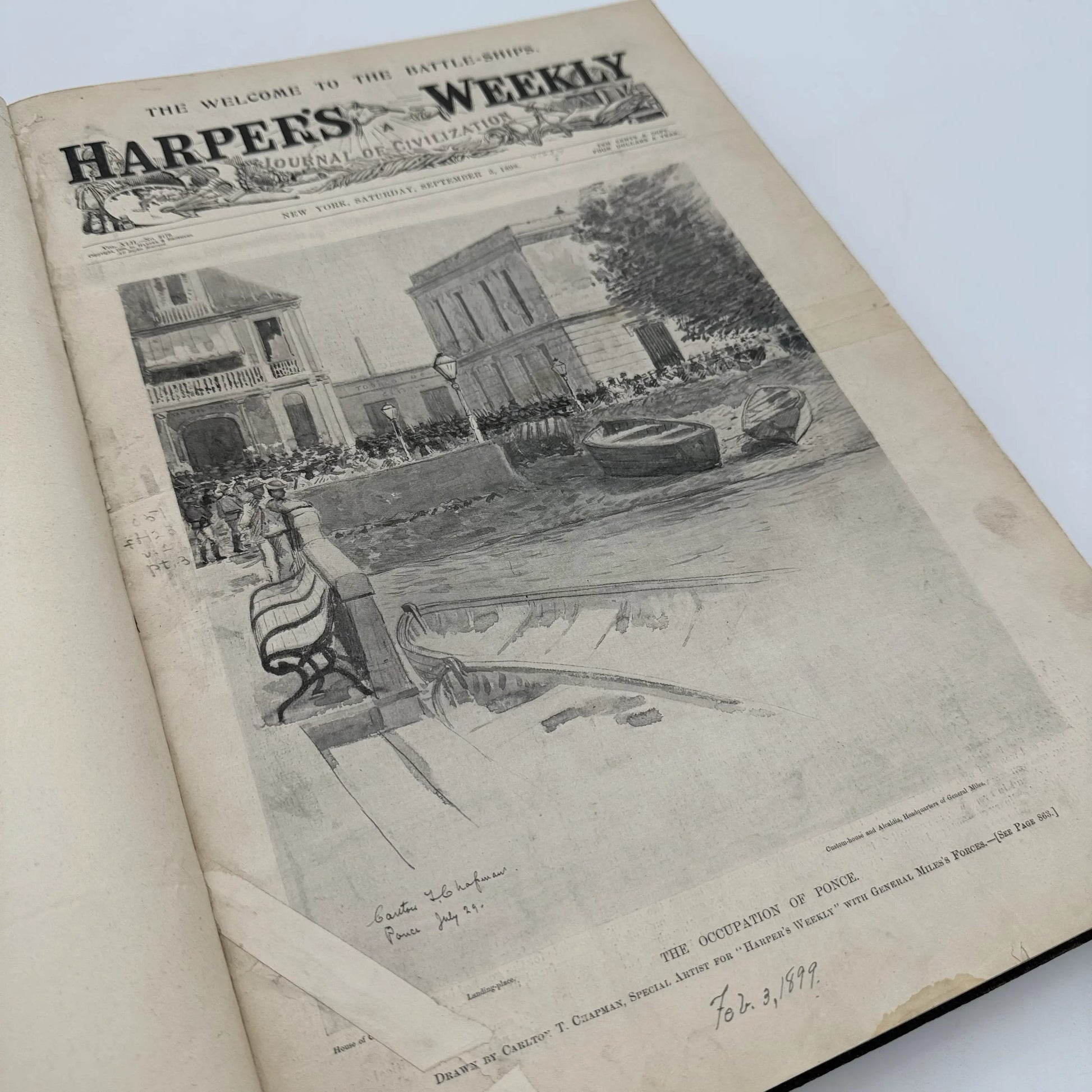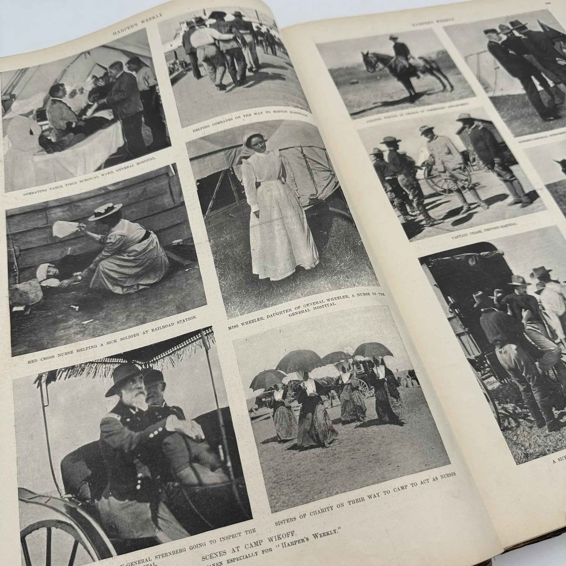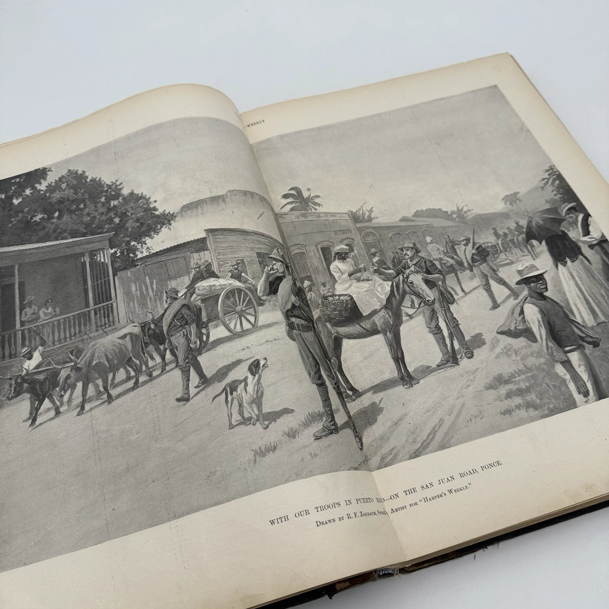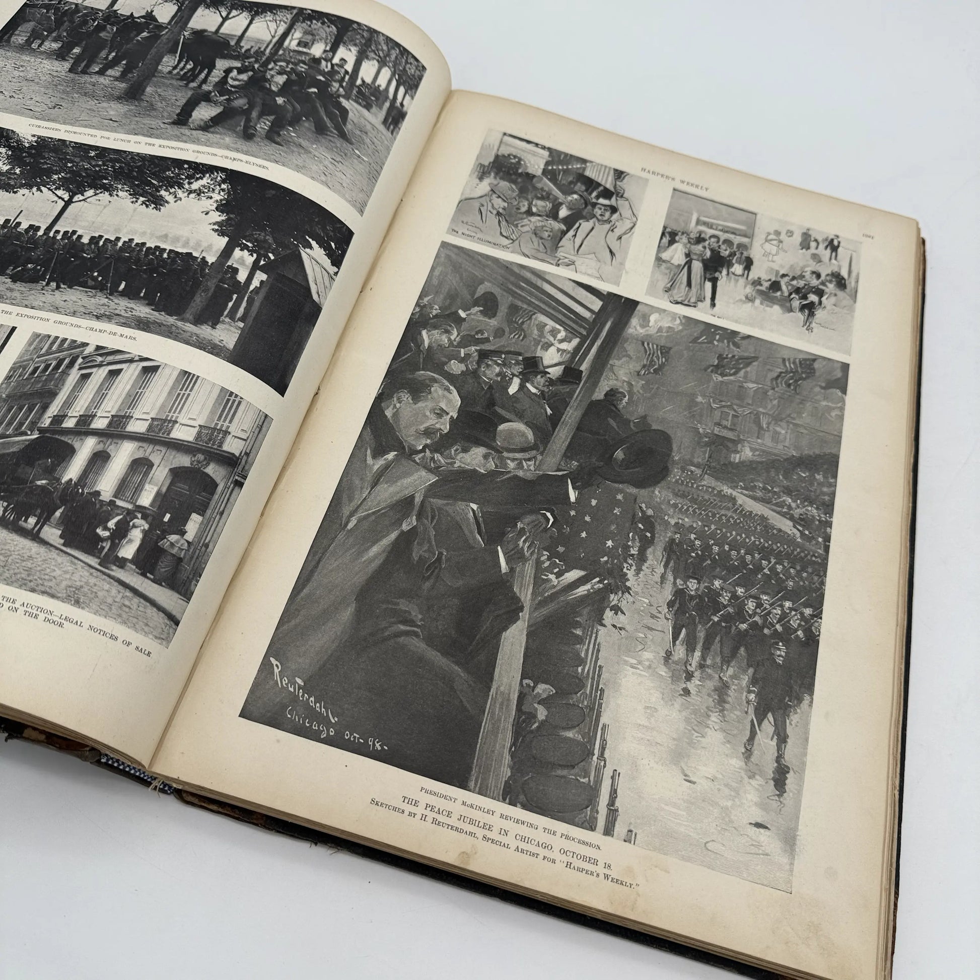 This 1898 first edition of Harpers Weekly includes all of the issues of the magazine from September through December in a large bound volume.