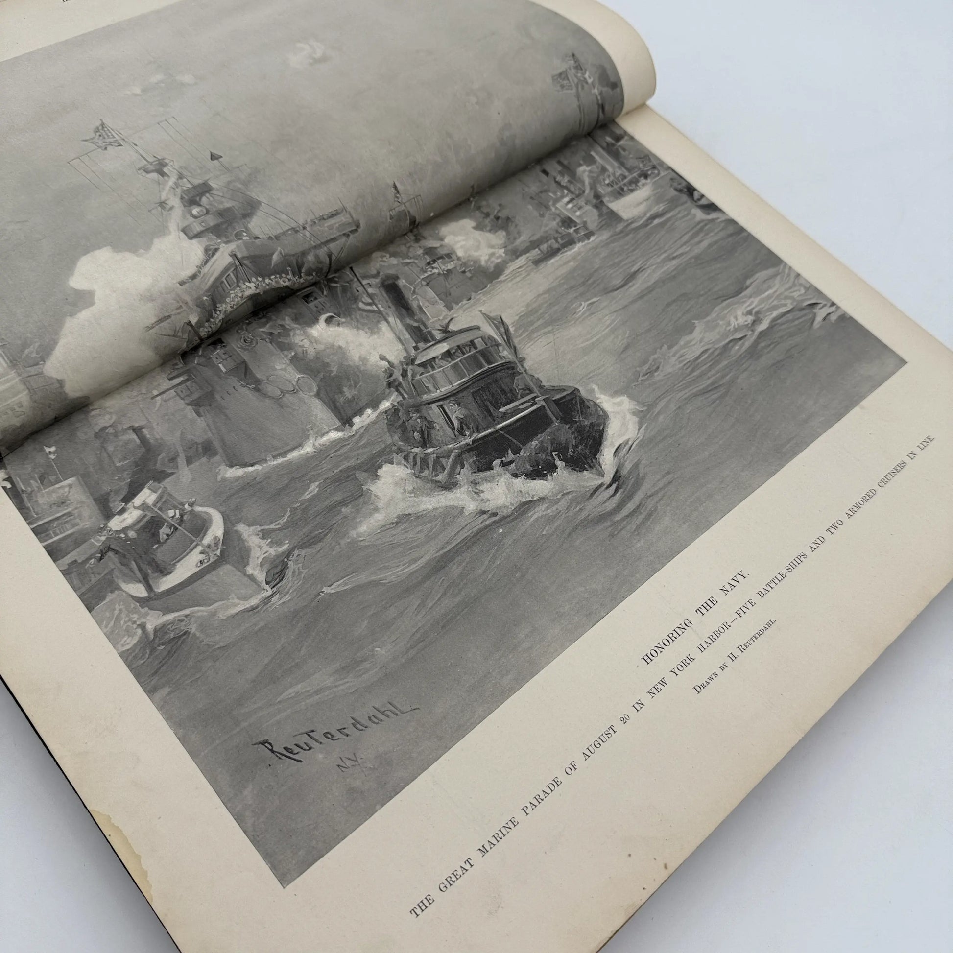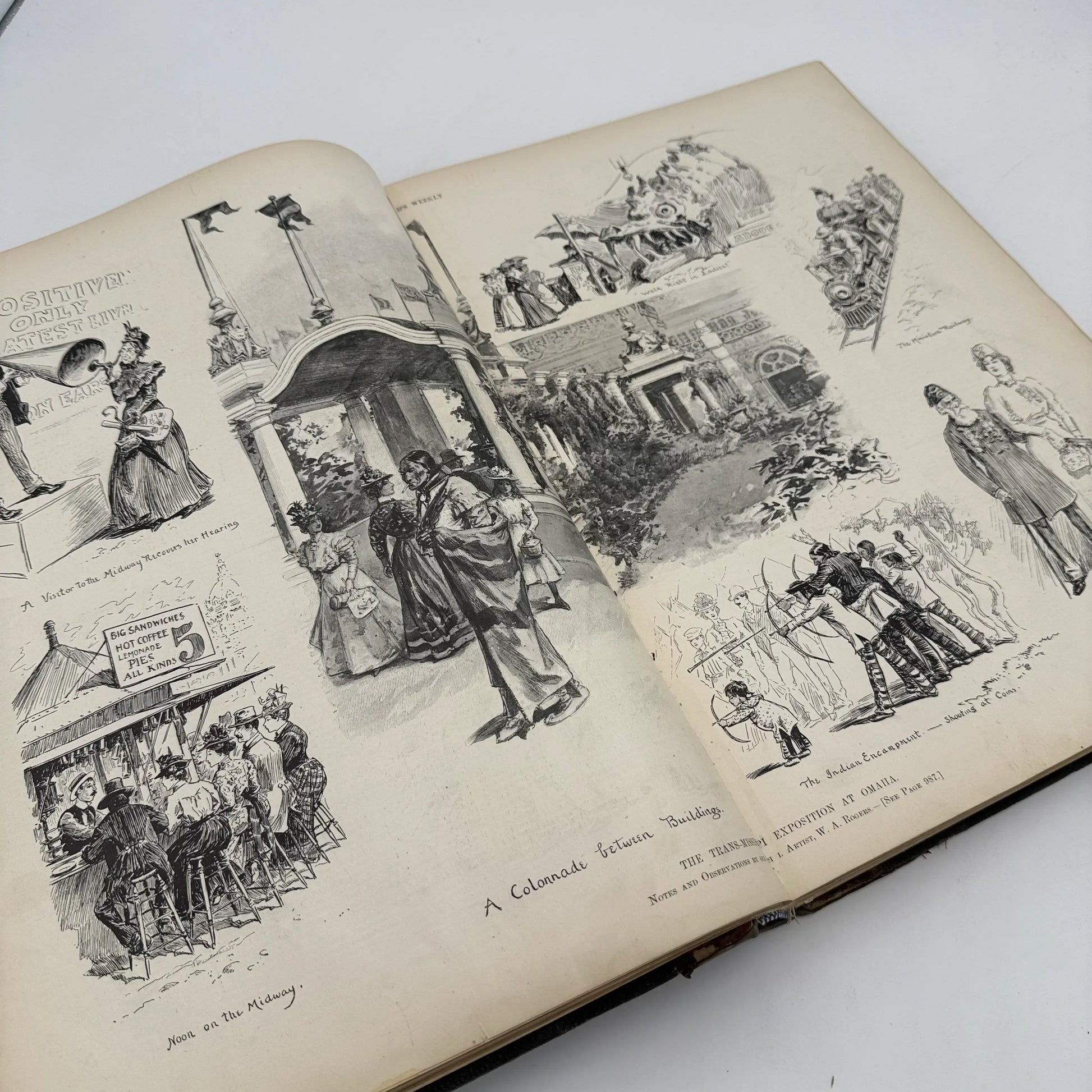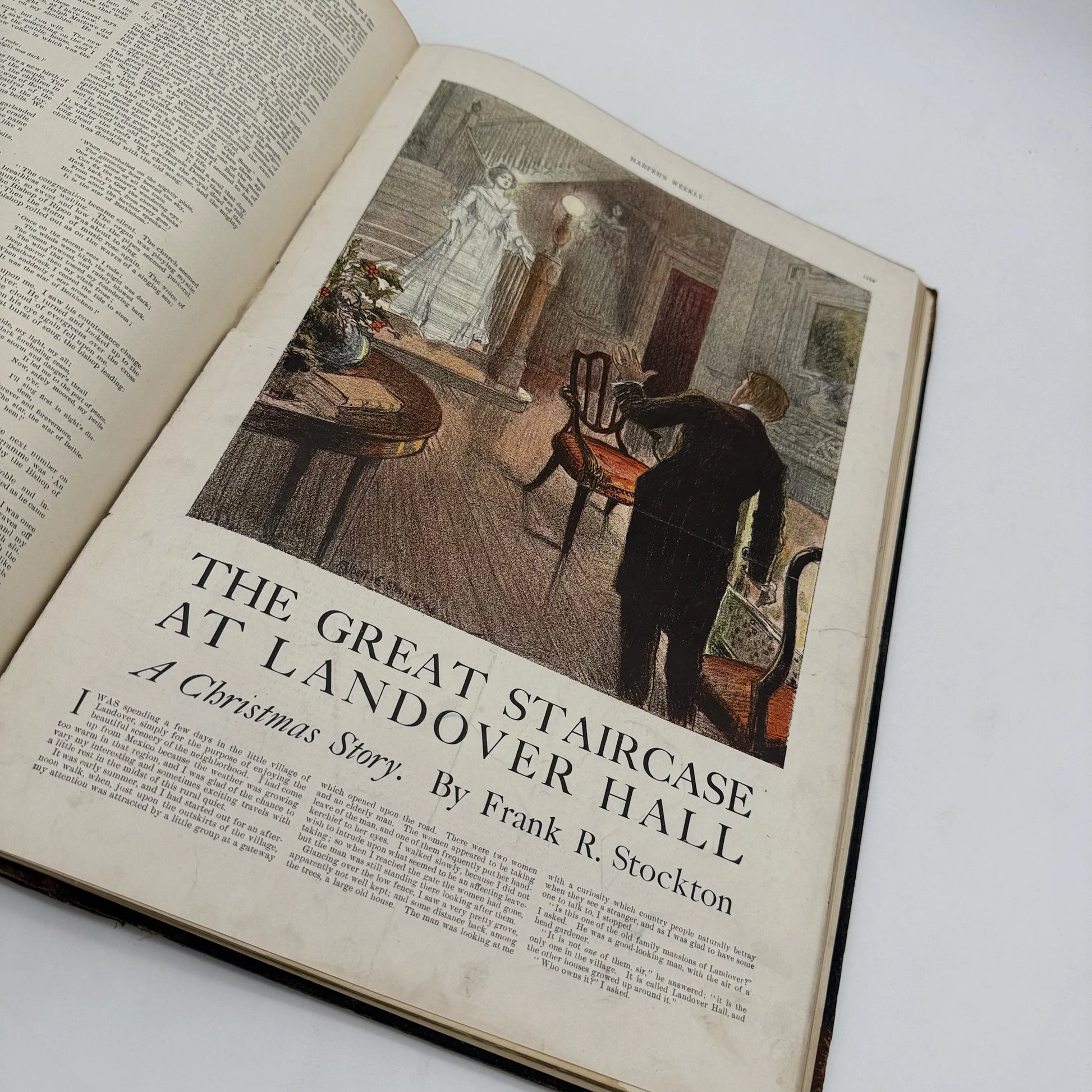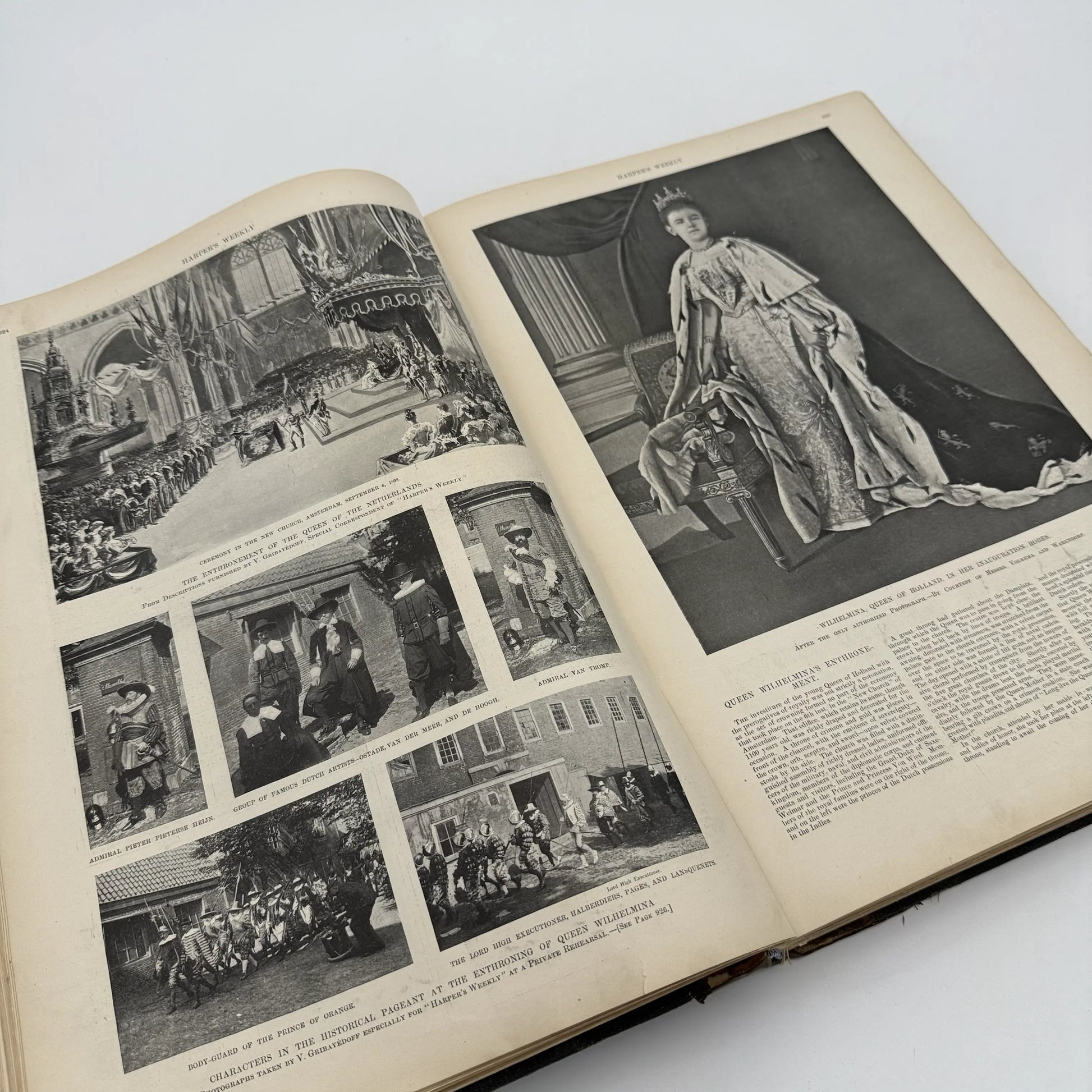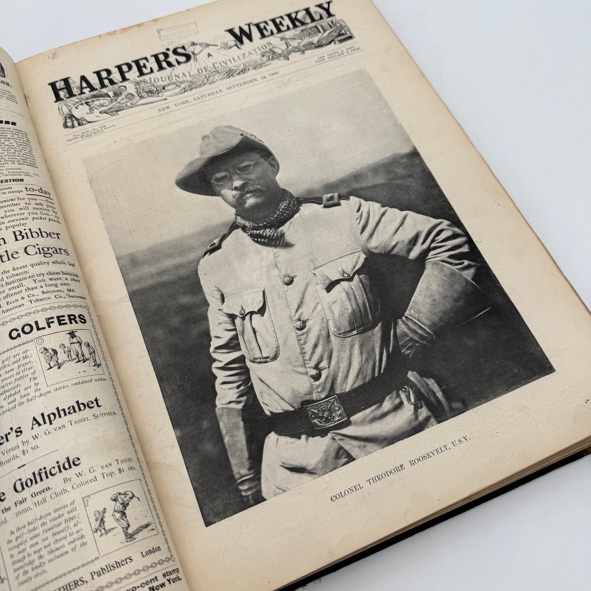 This 1898 first edition of Harpers Weekly includes all of the issues of the magazine from September through December in a large bound volume.