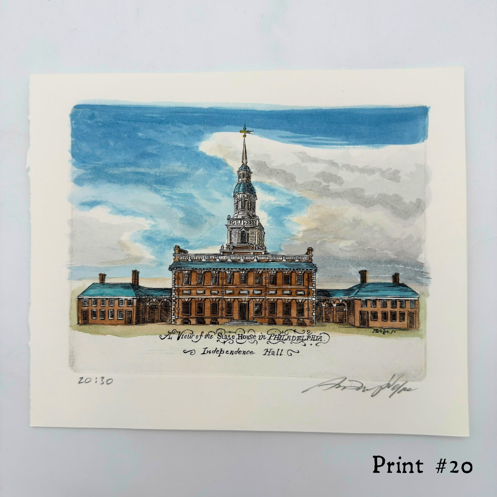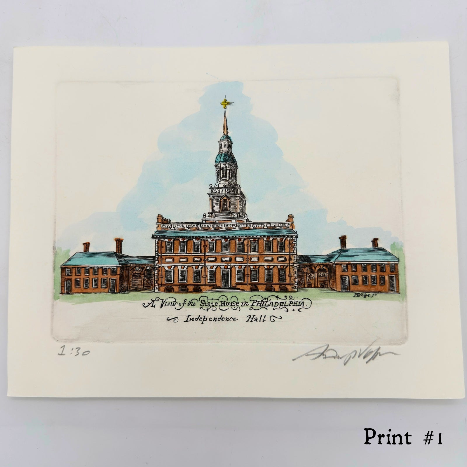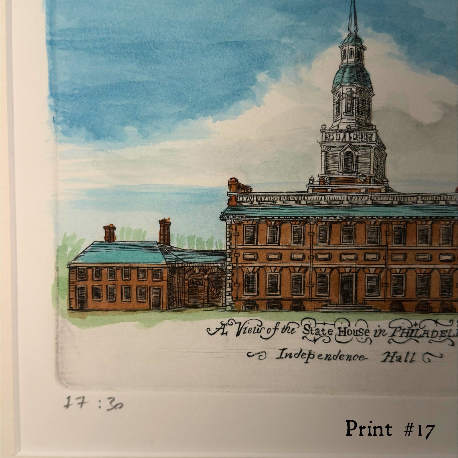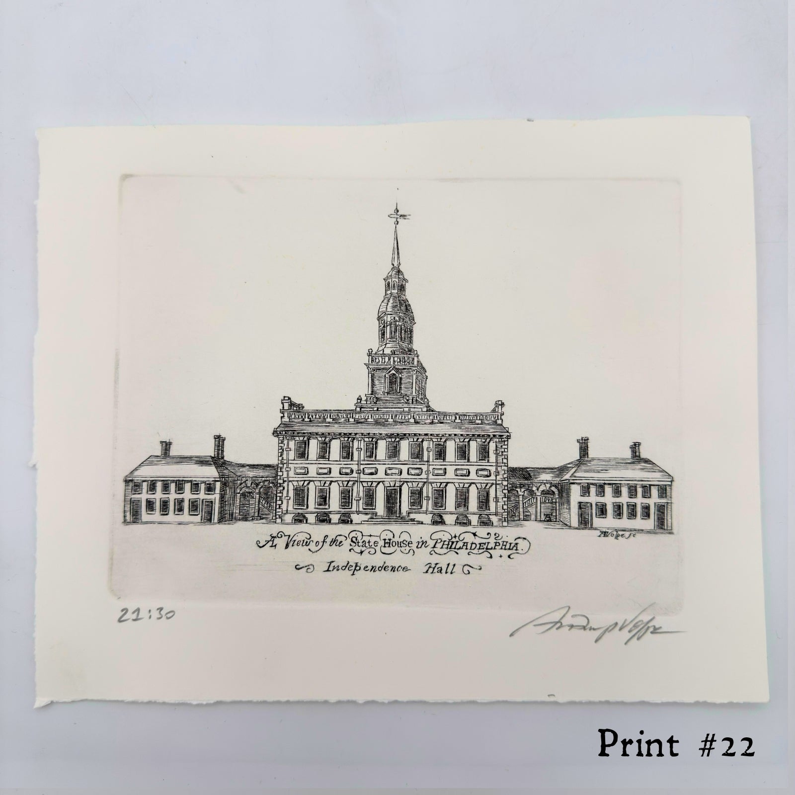 Hand-engraved print of the Philadelphia State House known today as the Independence Hall. Created by historical artist and engraver Andy Volpe.