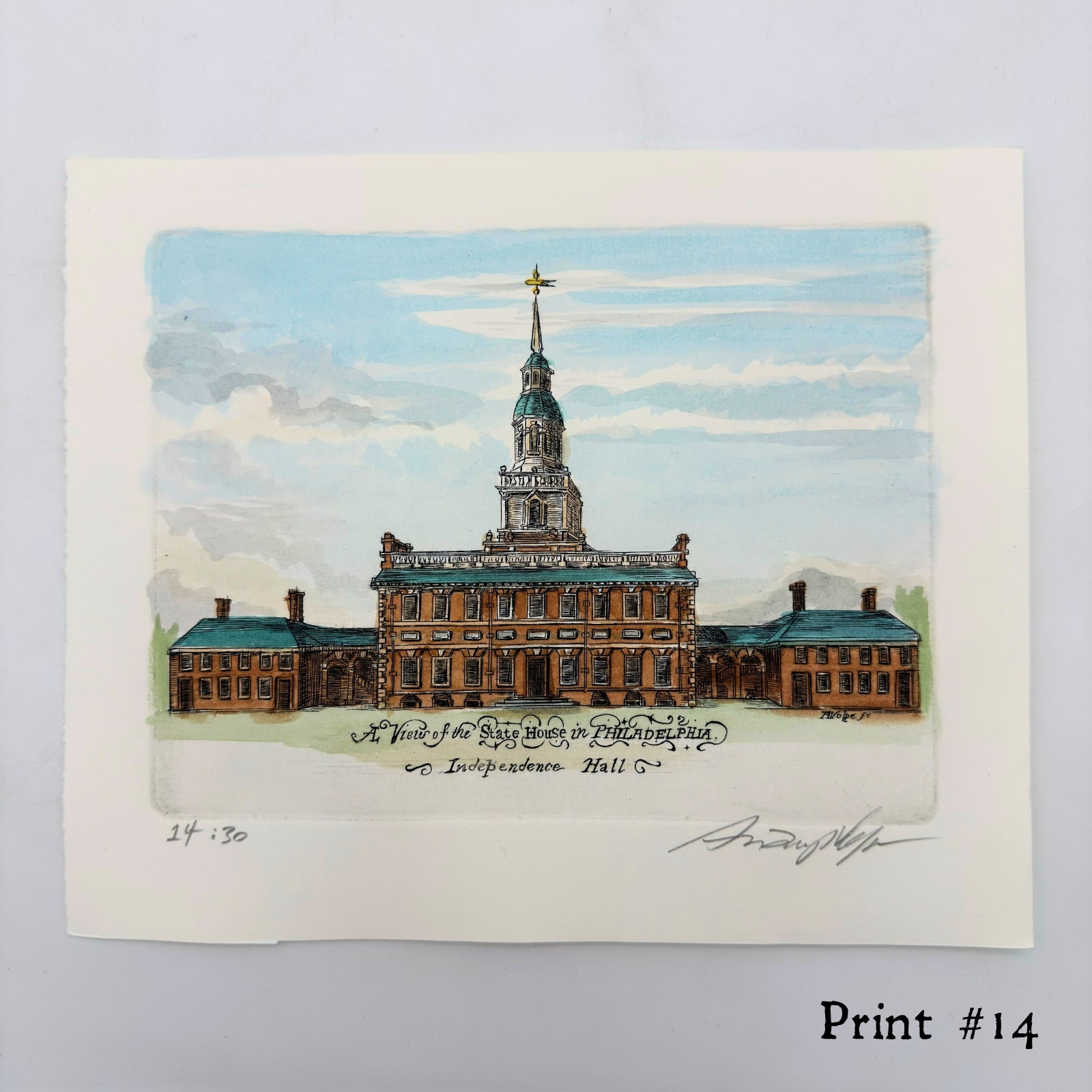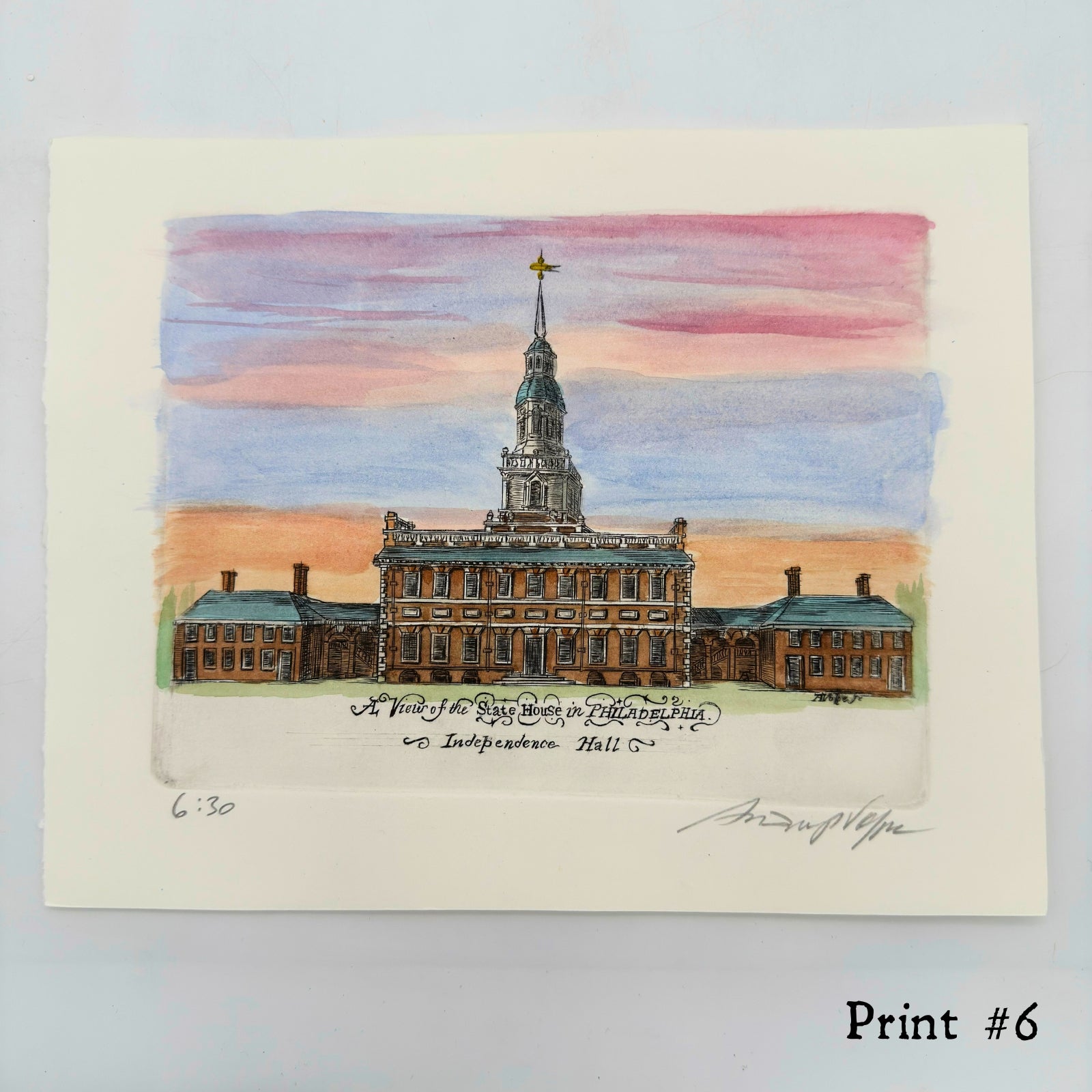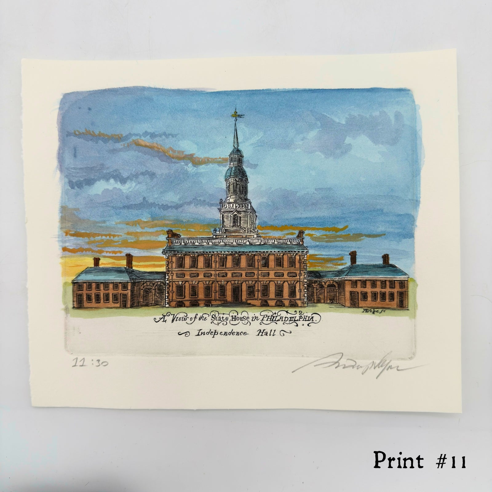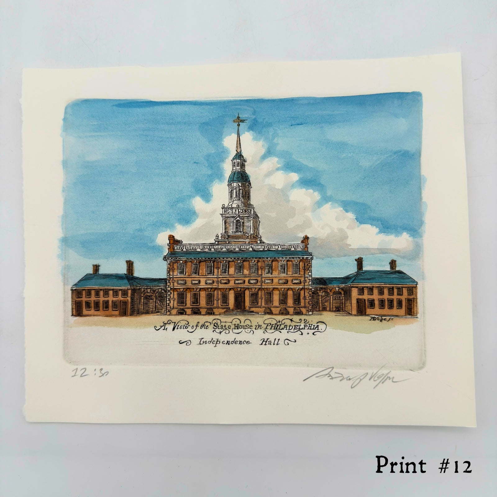 Hand-engraved print of the Philadelphia State House known today as the Independence Hall. Created by historical artist and engraver Andy Volpe.